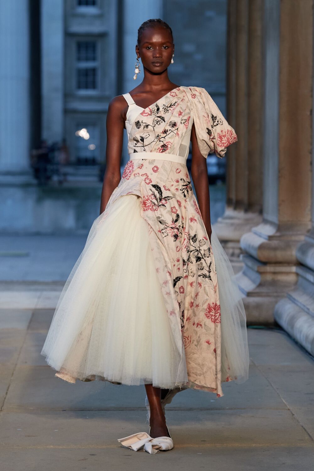 Look 42 is a very special piece as it incorporates archival textiles, remnants of curtains that were once hung at Chatsworth, this fabric was then hand embroidered in the studio by Cecily Lasnet, Debo’s great granddaughter. This piece speaks to the idea of lineage and continuity whilst embodying Debo’s make do and mend spirit.”