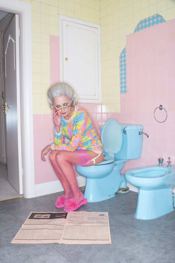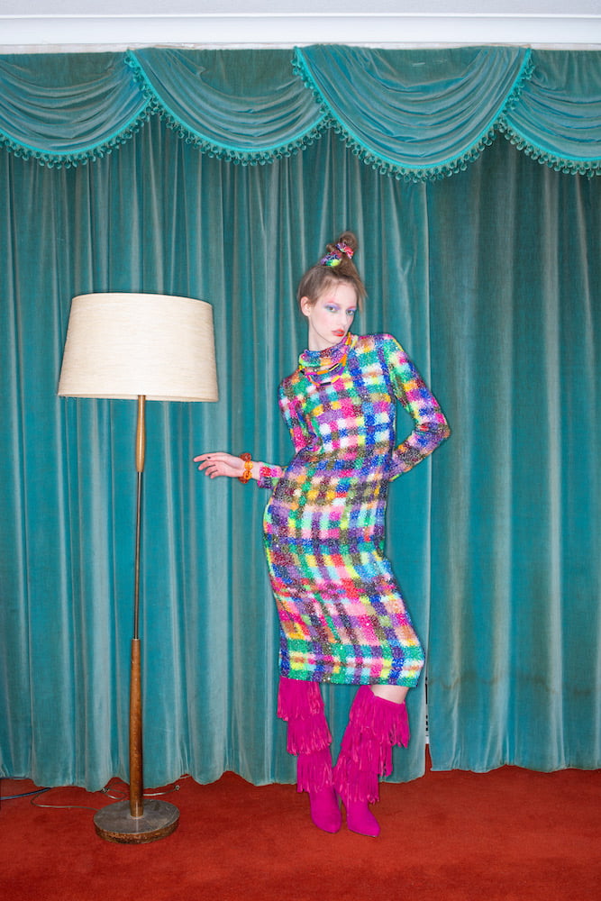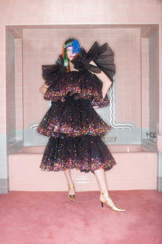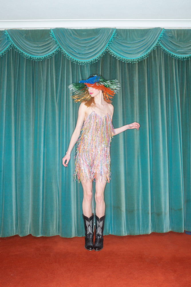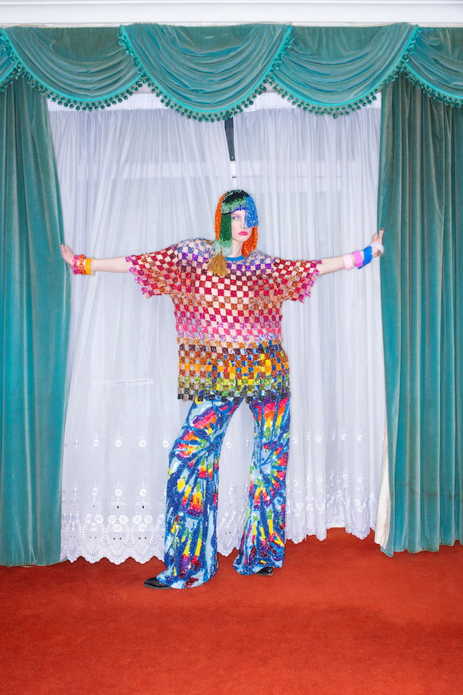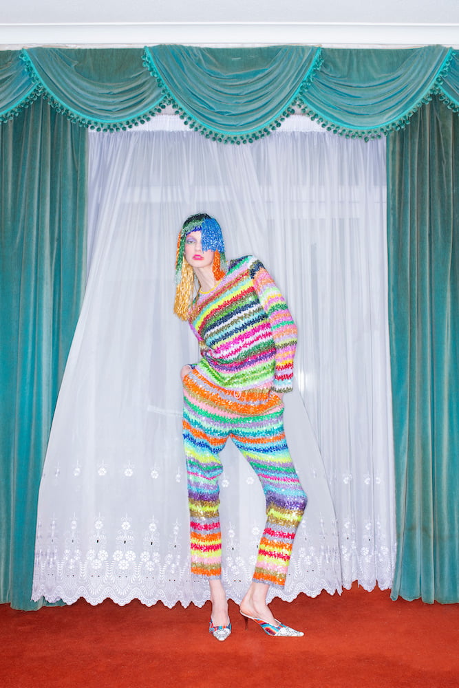 “There was such a great freedom where the pieces almost end up looking like fuzzy knitwear,” he says, pointing out that he wanted luxurious pyjama sets and going out-out dresses to appear to be made of mohair which is sprinkled with technicoloured glitter. Hues are able to blend into one another in accidental gradients thanks to Ashish’s original sketches, whether that’s on pseudo-tye-dye tops, or multi-coloured, glass-beaded frocks (worn with matching wigs courtesy of Sam McKnight).