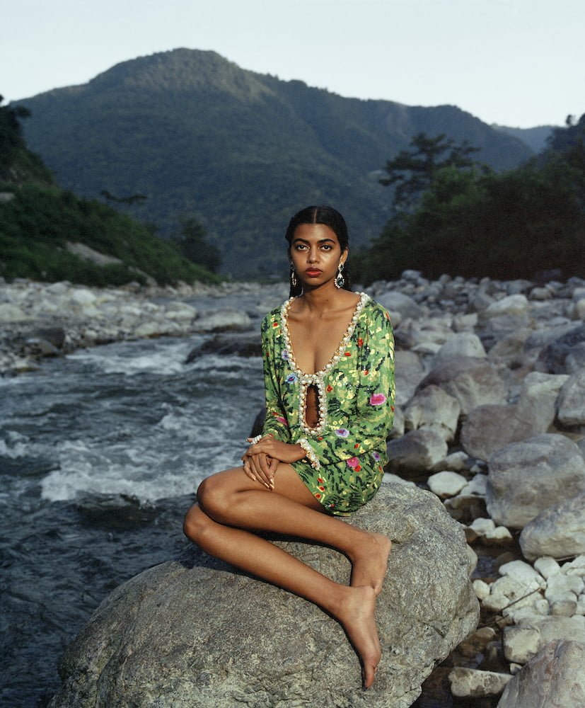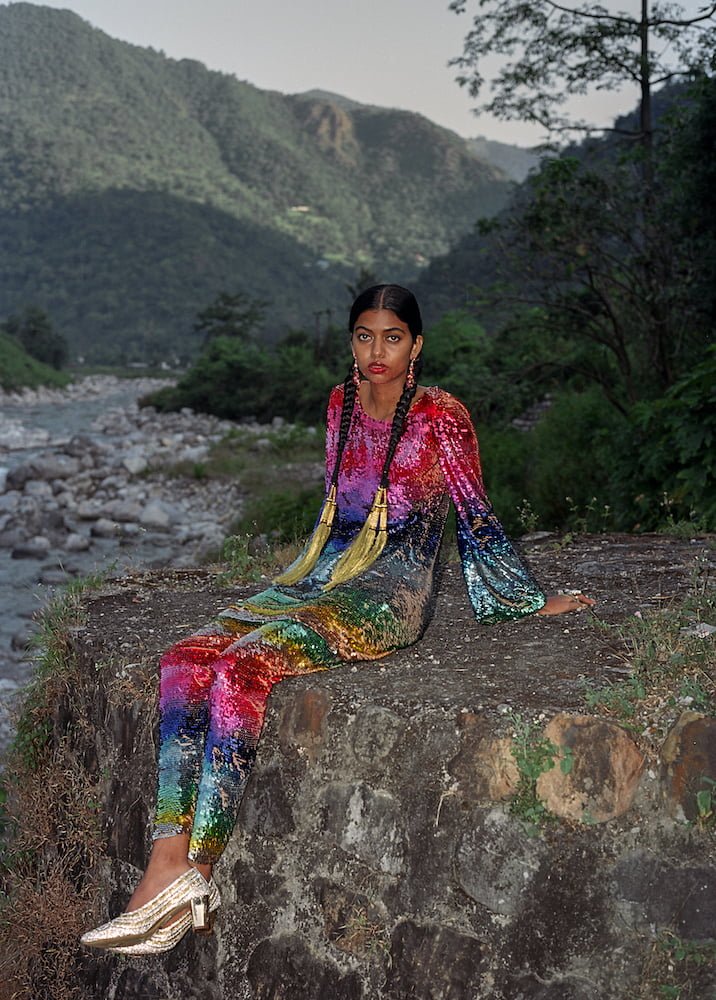 It was only after the final look was created, when Ashish realised one standout gown – featuring a swan swimming against a scenic background – subconsciously resembles a Ravi Varma painting of the Goddess Lakshmi, which hangs in the designer’s hallway. Another slew of looks – all beautifully striped – are a representation of the days Ashish wanted to be controlled, paired alongside a glamourous set of seventies going-out dresses for those moments he missed the dancefloor. “It was so therapeutic,” reflected the designer on the whole process. Not only has kitsch never looked so cool, but rather beautiful, too.