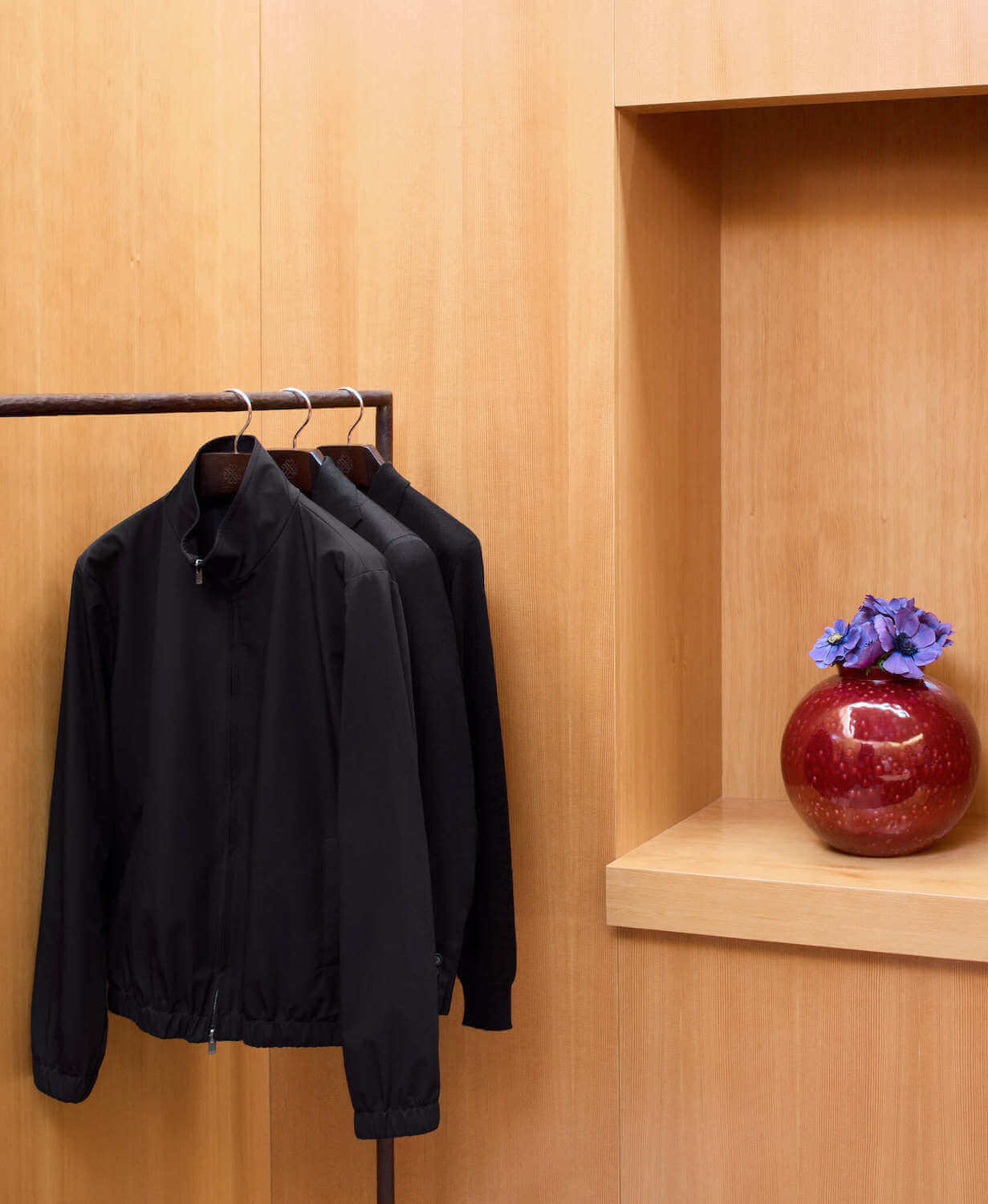 17 everyday pieces are on offer: think notch lapel jackets in silk canvas, linen and bamboo, zipped technical jackets, pleated linen trousers, light wash denim jeans and “featherlight” – according to Granath – cashmere-blend crew-neck sweaters, polos and t-shirts. “We always start with fabrics and the tactile sensation you get from them on your body,” he explains. “Jackets in slubby raw silk or smooth bamboo, suits in washed linen, knitwear in cashmere and silk…”