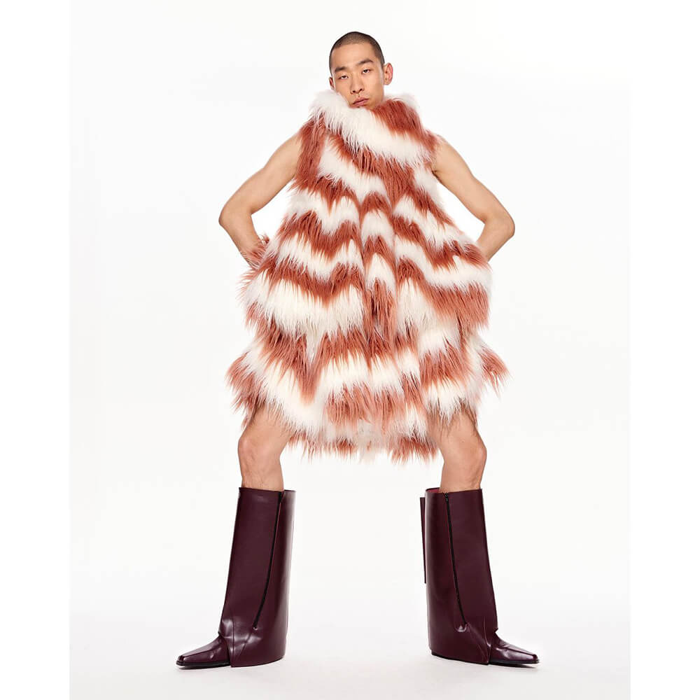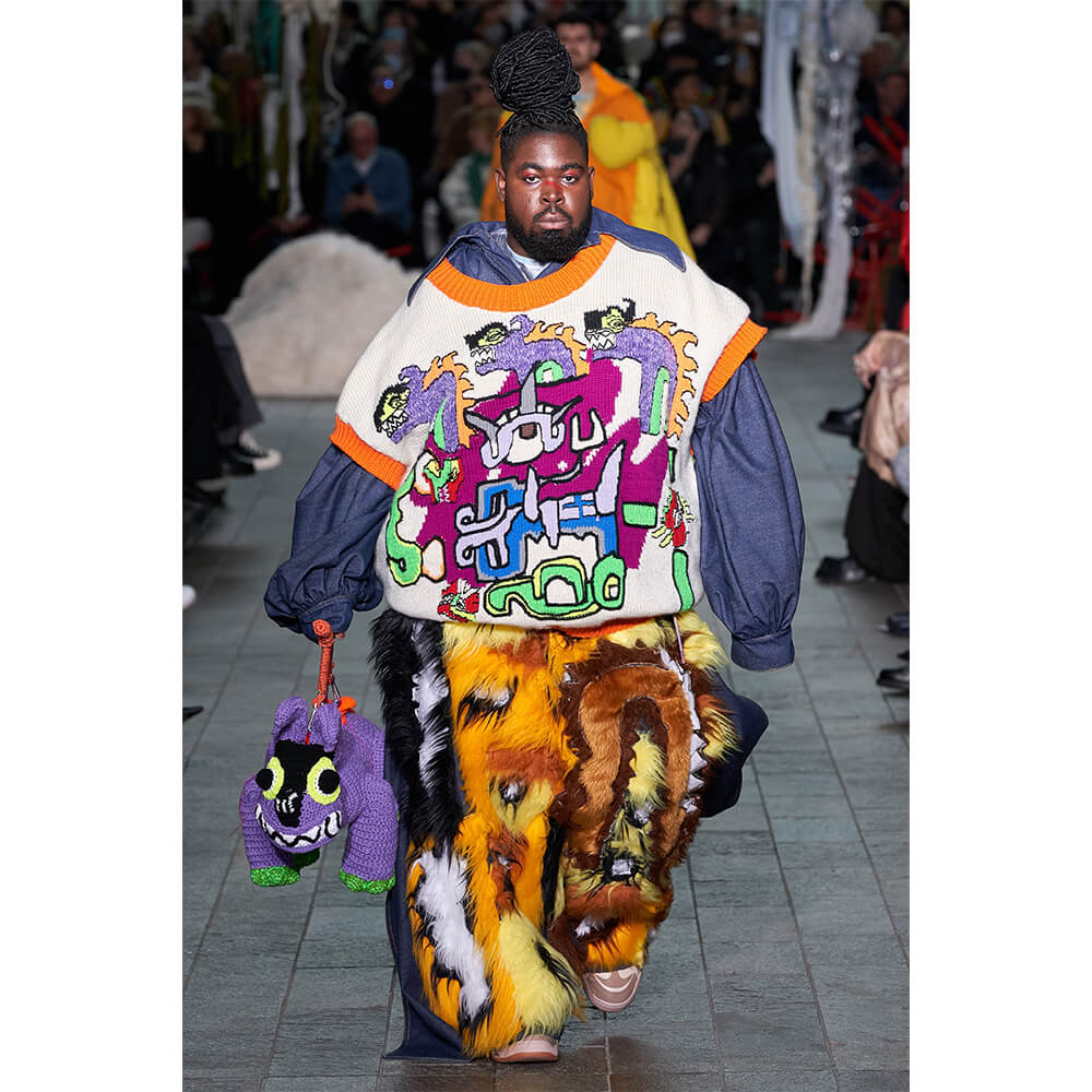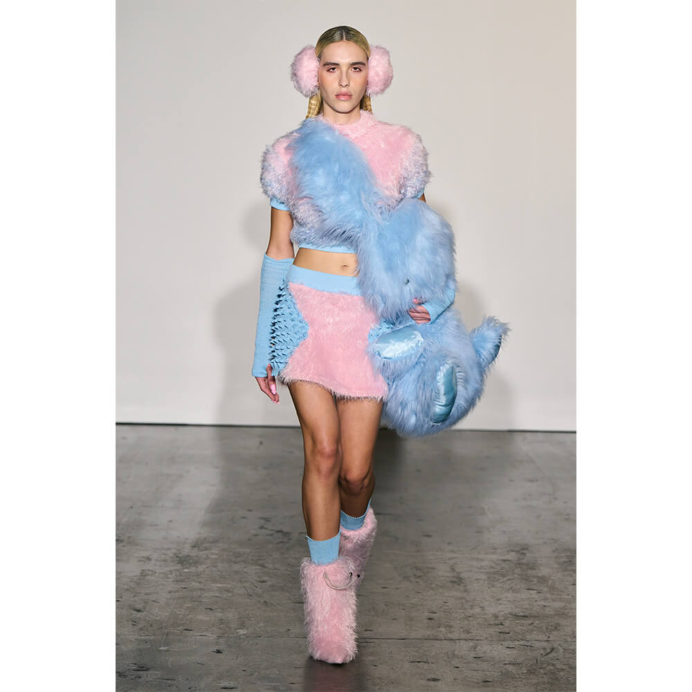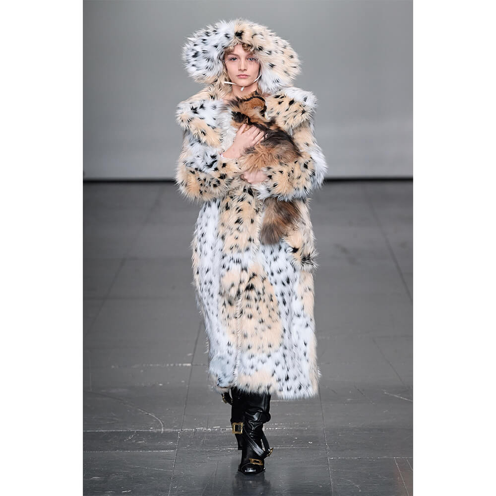 Toyland took on London this season. Brands like Matty Bovan and Ed Mendoza from Central Saint Martins’ MA  had quirky stuffed animals for handbags, either crafted with crochet or fabric off cuts. At Fashion East, Chet Lo followed suit, but rather than kiddish playthings, the plush bunnies were made in the same spiky material as the models’ garms – like an elevated me and my American Girl Doll with matching outfits straight out of the 2000s (talk about twinning!). Yuhan Wang took a more literal approach to pet play, sending her living, breathing cat Misty down the runway cradled in the arms of a model who donned a matching leopard print, faux-fur coat and hat. Go grab your furry friends, people – be it living, plush or animatronic – because pets are back in fashion.