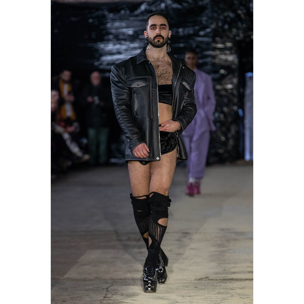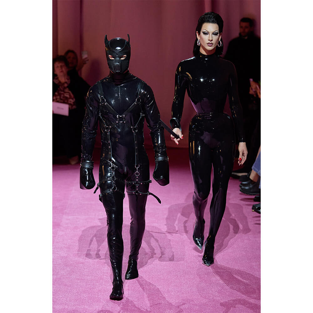 So, getting into the nitty gritty, Christopher Kane employed leather harnesses, naughty bodices and rope to tie it all together this season. Elsewhere, Edward Crutchley offered upcycled leather platforms and nipple clamp earrings on nearly nude men. The star of the season was Richard Quinn’s hedonistic display where RuPaul’s Drag Race winner, Violet Chachki, walked a human pup on a literal lead, both in full latex, studded and harnessed get-ups. It’s not surprising that these carnalities would pop up in London in particular – this is a city known for its rising curiosity for sex parties and fetish festivals. It might not be Berlin but oh, what a buzz.