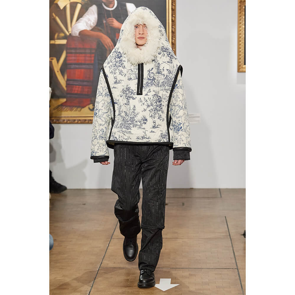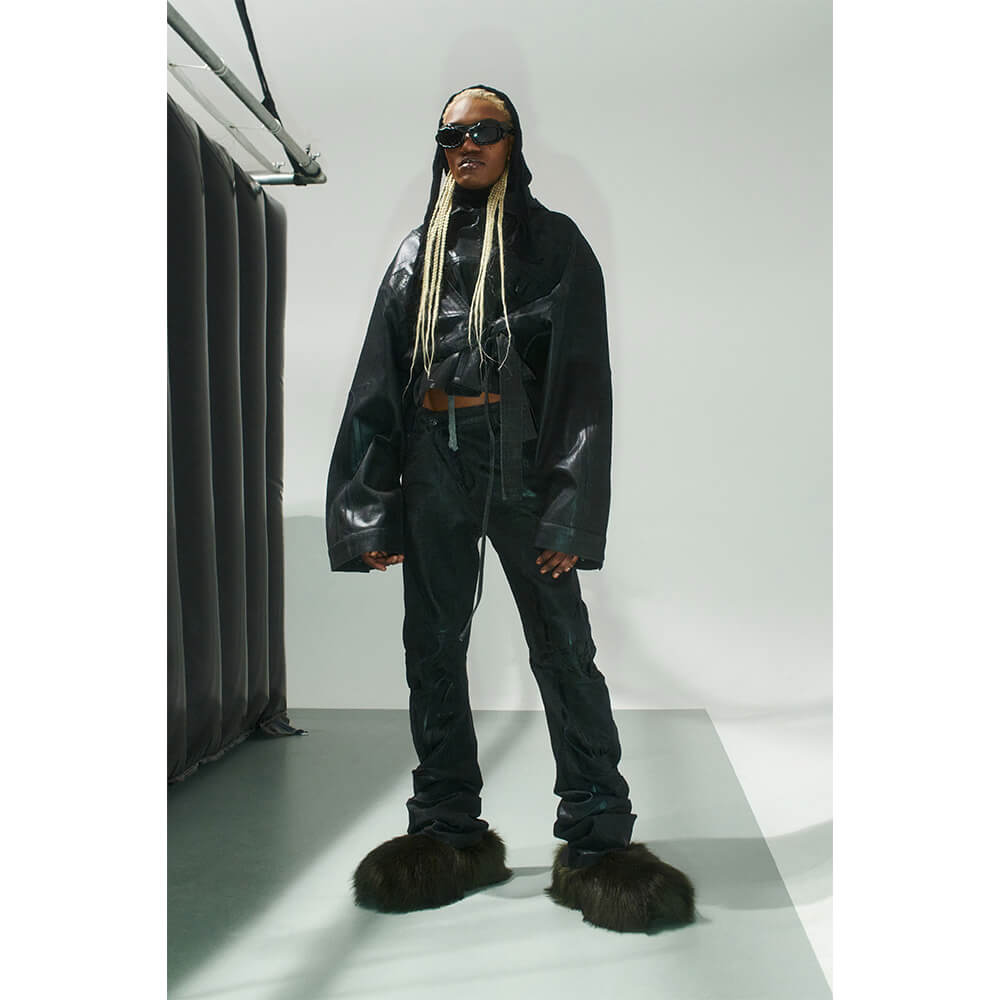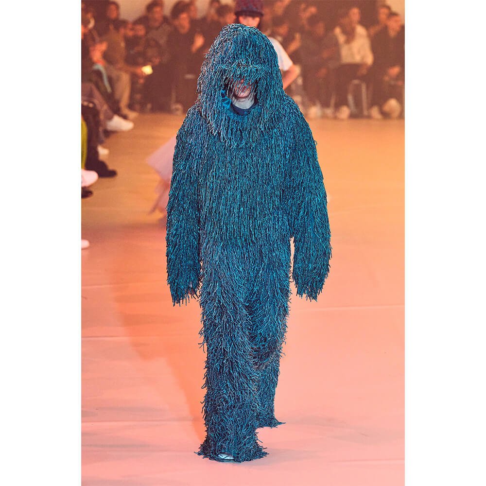 For Off-White, this monstrous aesthetic appeared as pimpy oversized fur coats and a baggy, shaggy, hooded unitard. Elsewhere, Ottolinger integrated furry flats and kitten-heels into its collection and Marine Serre sent an avalanche of fluffy headwear down the runway, keeping the snowman a little more subtle. Then at Rick Owens, woolly trimmings adorned the sleeves of bulbous coats and Fashion East alumni Goom Heo proposed a long-haired belt, balaclava and ball gown. With what the internet has dubbed Yeti boots dominating street style since the start of 2022, it’s no wonder these shaggy furs have wandered up the body to form full fledged monster snowsuits. Could this winter weather, scruffy style be the au courant apres-ski?