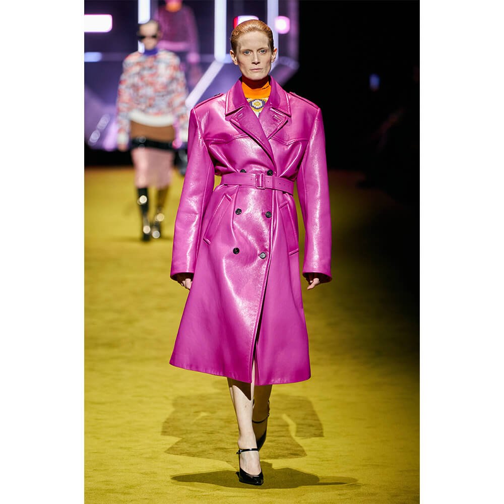 Prepped and primed for the cold season, Dsquared2 offered an edgy leather skirt over pants look in addition to its brown aviator bombers, while Sportmax took a more sensual approach with halter-neck tops and shifts or form-fitted frocks to bring the heat. At Versace it was short dresses, thick corseted coats and wide-leg trousers galore. Plus, Prada updated its outerwear with lux leather, oversized coats.