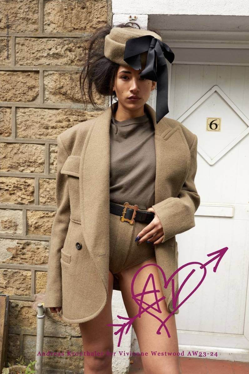 The AW23 campaign, shot by Juergen Teller, was a family affair filmed by Vivienne Westwood’s brother Gordon Swire, with casting done her son Ben Westwood. Shoot in Westwood’s hometown, Tintwistle, the team started at Westwood’s birthplace no.6 Millbrook, Hollingworth where her granddaughter, Cora Corré posed, moving through the backyards of relatives, and concluded at the grave of the late designer. TS