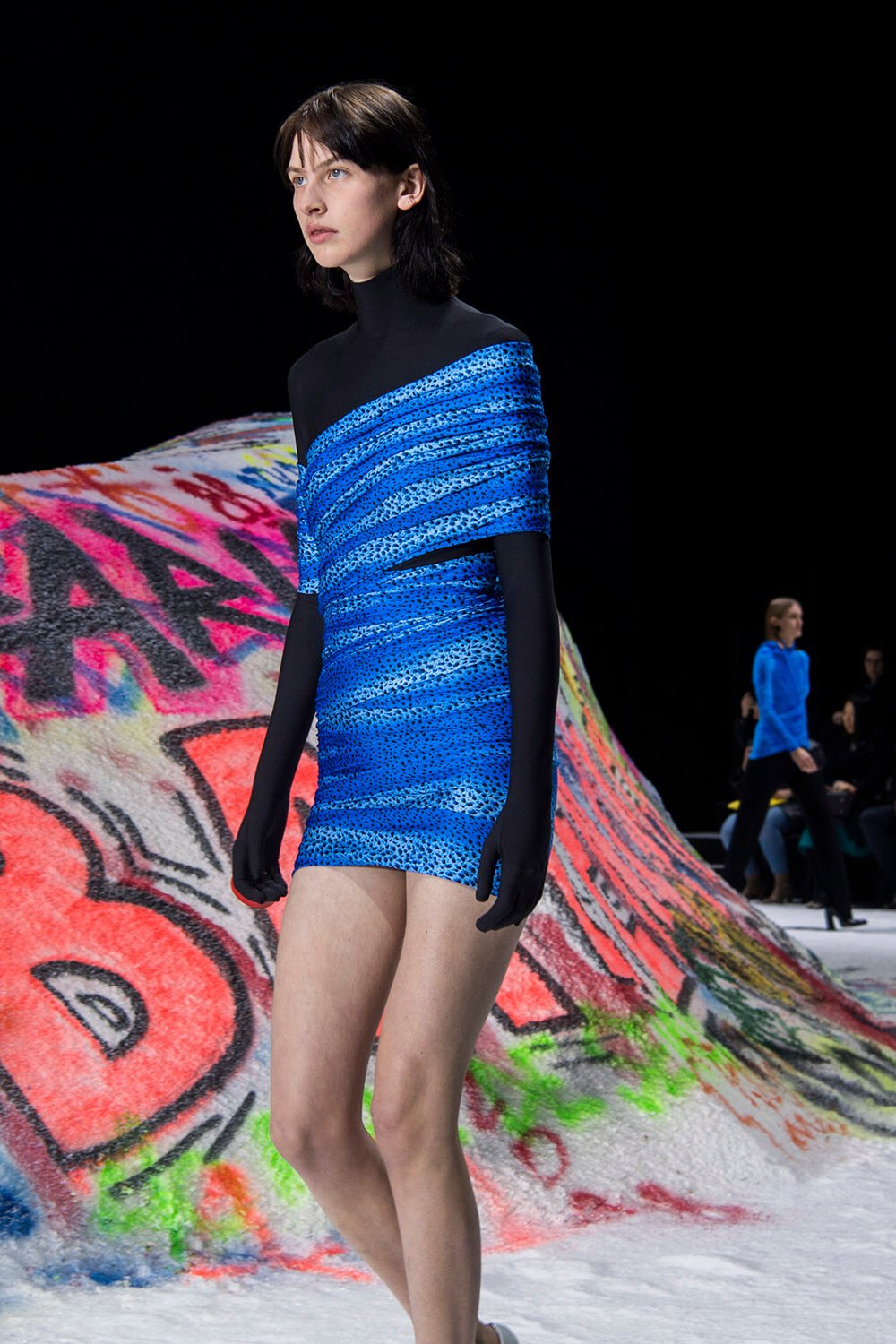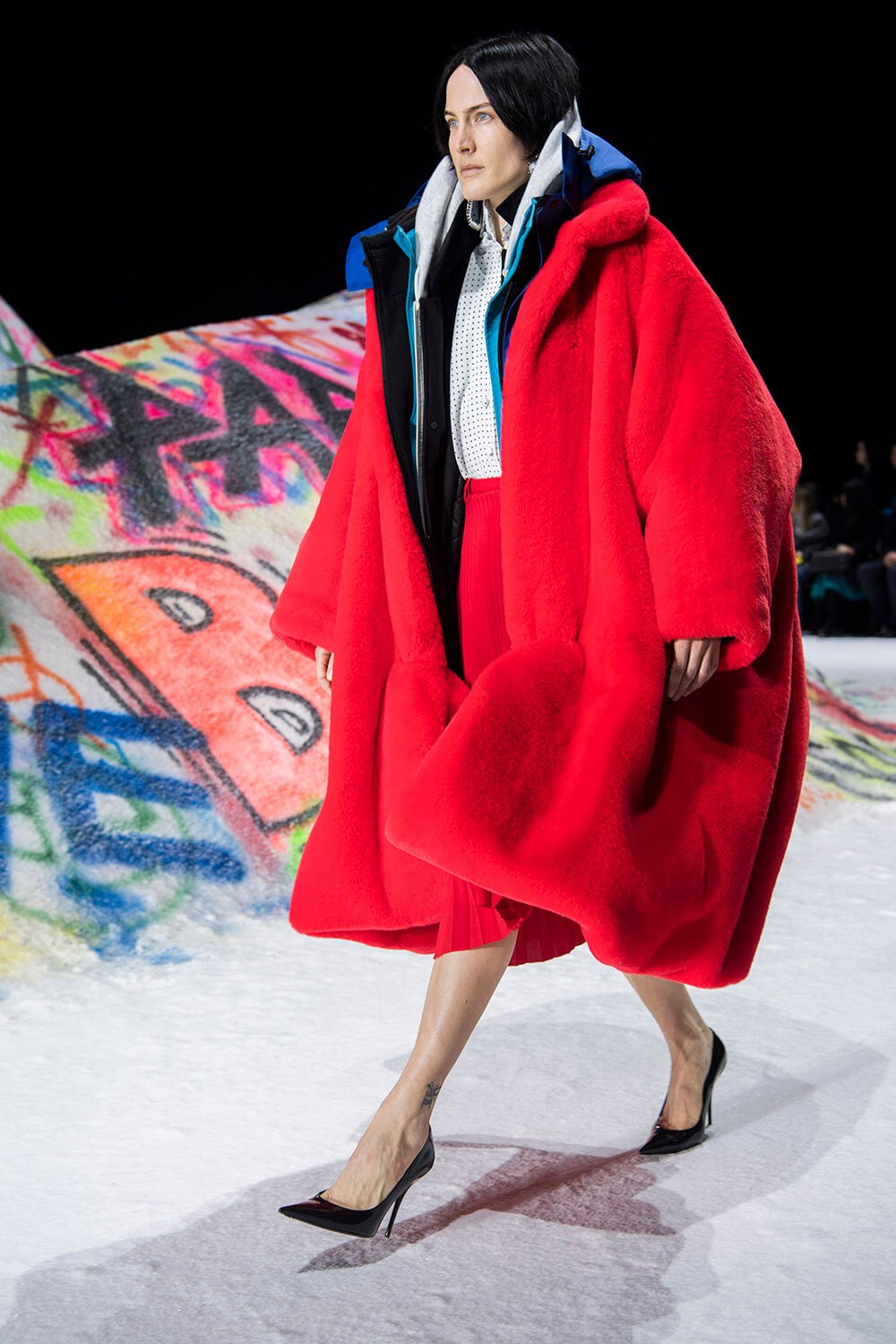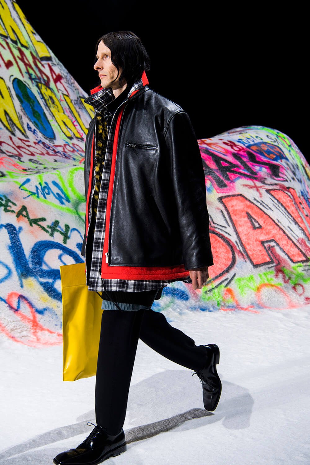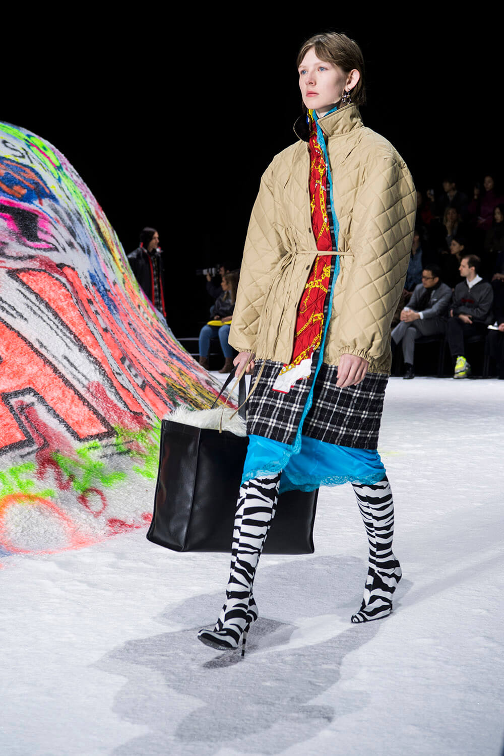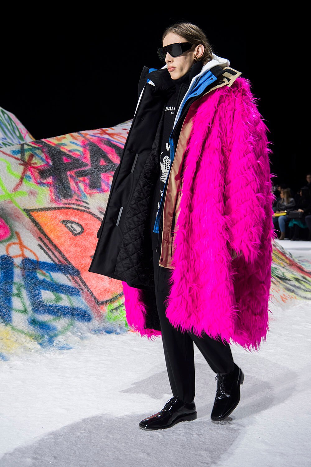 Boom. Balenciaga is booming. In the eye of the snow storm sat a graffiti mountain, a “snowboarding paradise.” ‘Think Big,’ ’Be Aware,’ and ‘You Are the World’ it told us. Balenciaga is our new advisor. Monstrous and exhilarating, like a Demna collection always is. On fire. Adrenaline rushing. Today the women’s and men’s collections were officially unified and digitally fitted. Oh yes, Balenciaga went there. 3-D body scans and digital fittings to recreate Cristobal Balenciaga’s pristine tailoring through high tech moulding. It’s truly 2018.