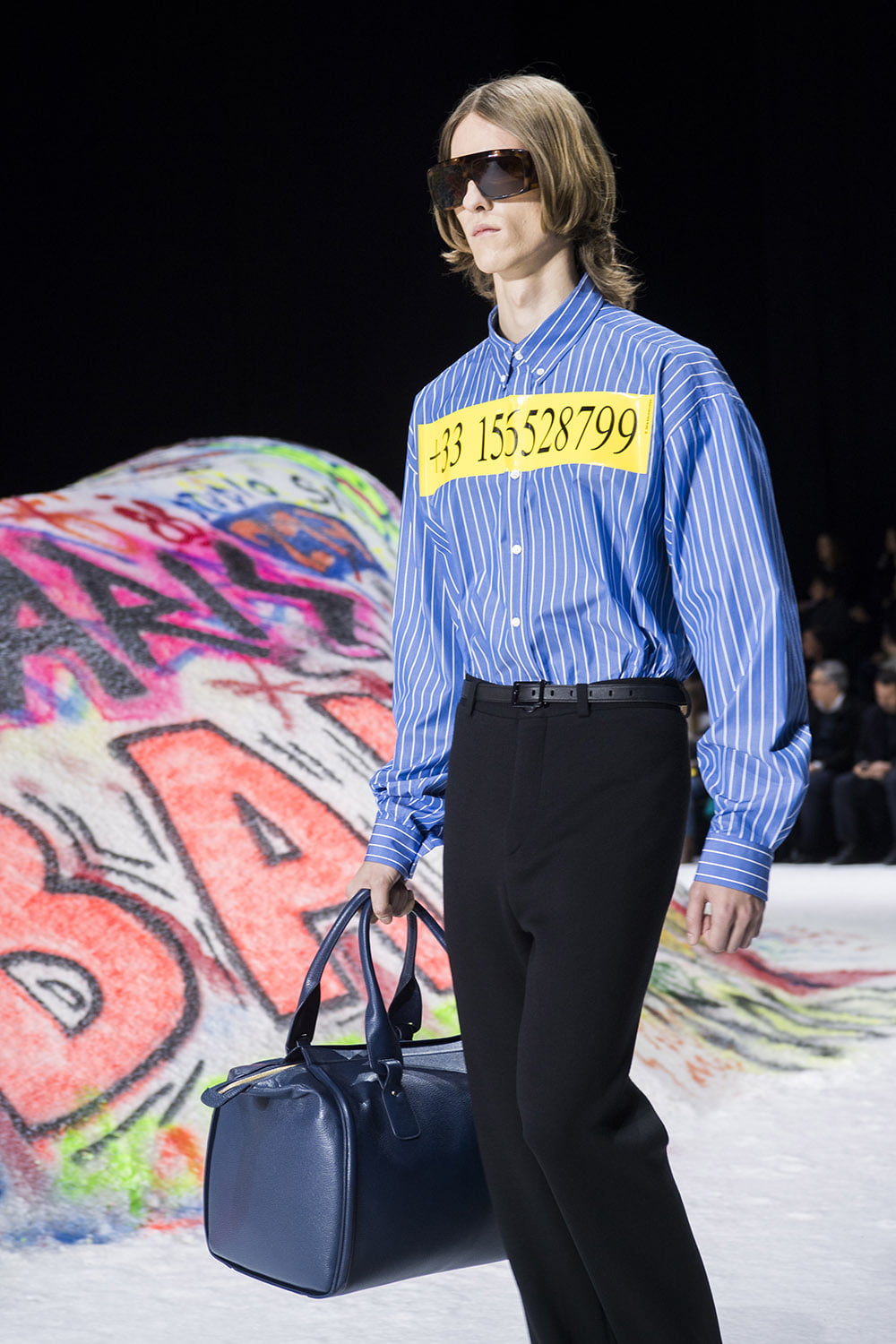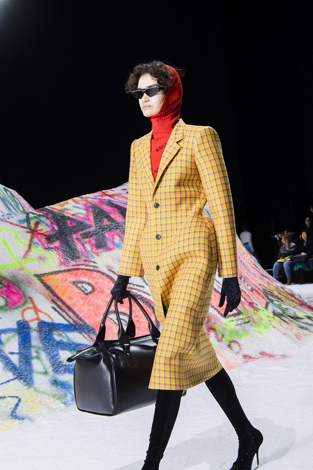 It was filled with all that Balenciaga swag in headscarves, thick gold chains and keys hanging off belts. New, totally practical accessories. Hoodies read ‘World Food Programme’ the “largest humanitarian organisation fighting hunger worldwide,” supported by Balenciaga. Hell yeah. 10% from every AW18 item sold will be donated to the programme, on top of the €250,000 the brand has already donated. This collection is everything we want, and want to do. Look good, do good. A rush of fuzzy bags, sci fi sunglasses, fringing flicking and the new Track sneaker. We’re overwhelmed. Demna Gvasalia is thriving at Balenciaga. Full (controlled) throttle down that snowboarding paradise slope. Hearts are pounding.