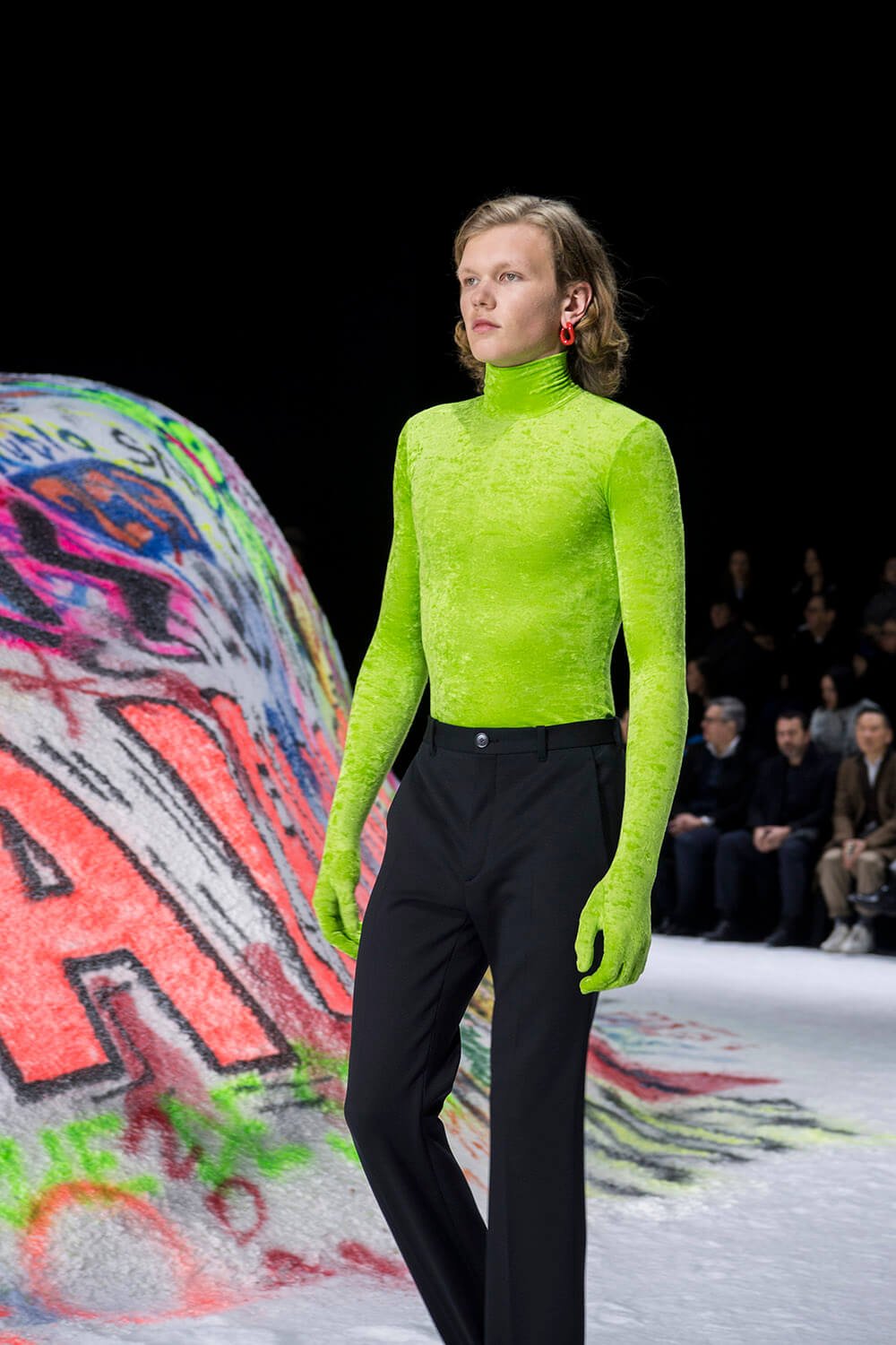 Almost hypnotic, this was the Artificial Intelligence. The next future. It began completely controlled, serious hourglass shaped suit jackets were sculpted to perfection. They walked replicant style, robotically, the men in all those vivid velvet turtle necks that turned into gloves, an evolution of the iconic pant shoe. Neon peeked out from under jackets and on boots, yet a darkness in all that black lace draping over floral chiffon skirts flowing felt a little more human. Menacing strokes of the violin, terminator style, led the way for bigger and better. Ramping it up. Just when we thought he’d gone slimline, layer upon layer of tailored coats, jumpers, shirts, animal printed fur bulked up. Demna is still King of the puffa jacket – he cuts the best one and gives it that right amount of volume. Ultimate. Thrilling.