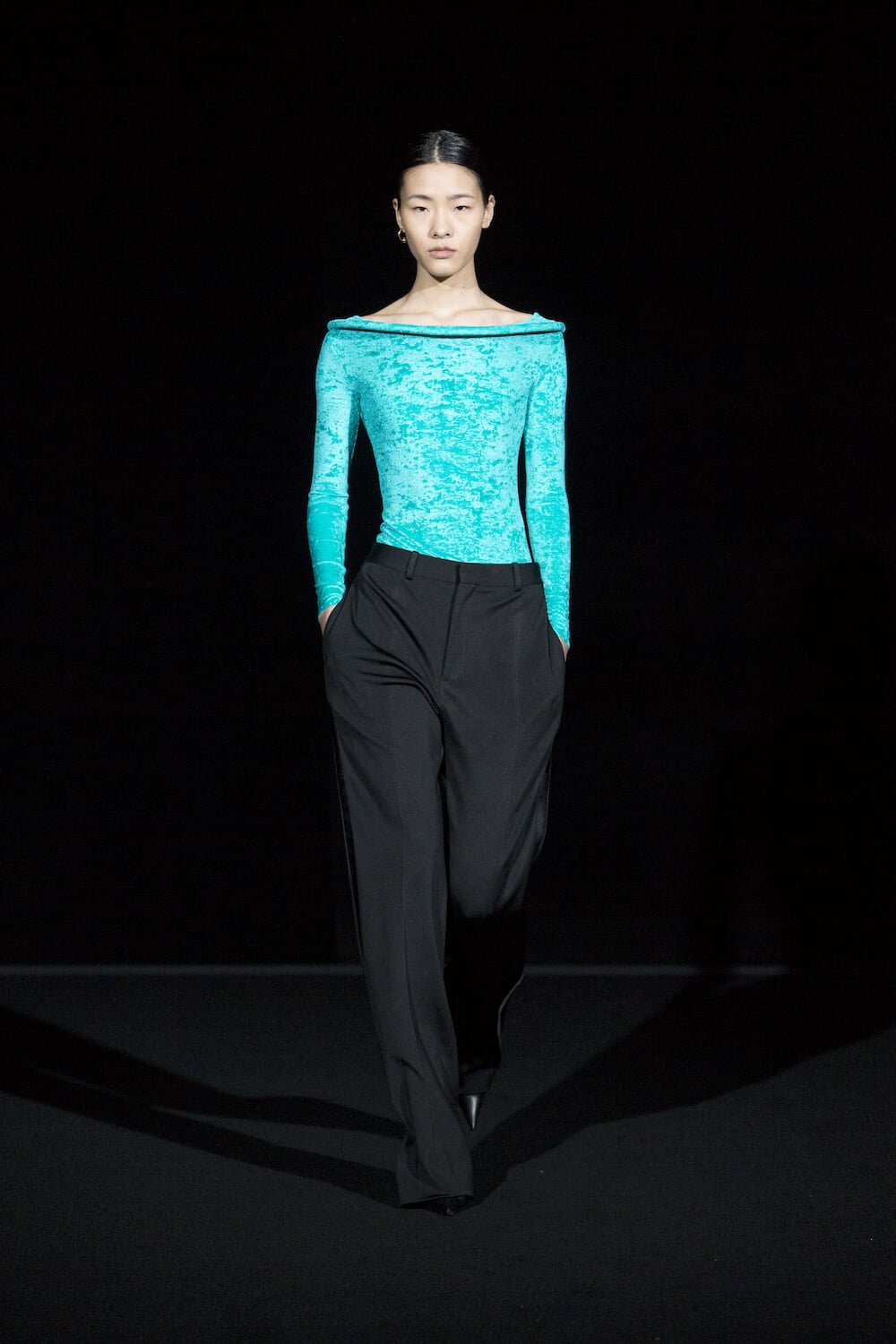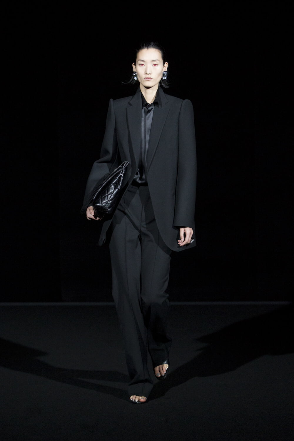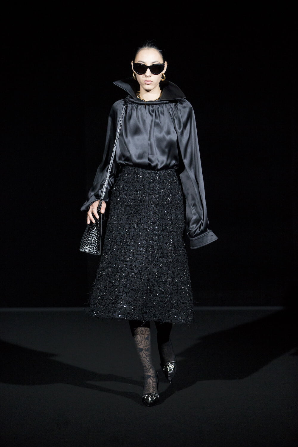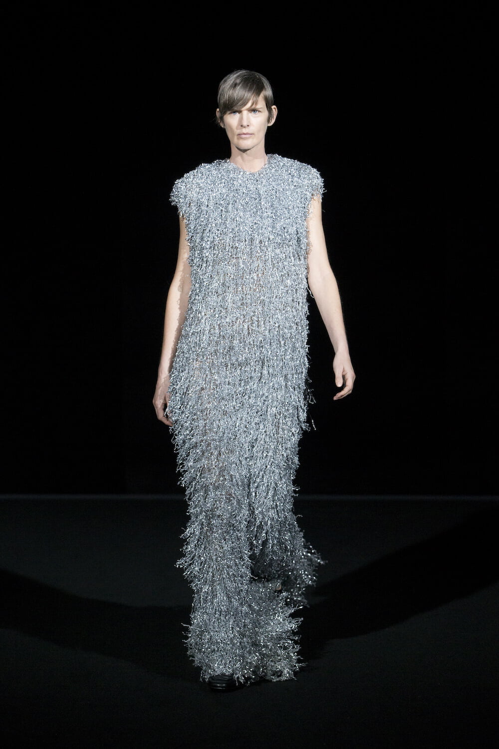 A blouse which fell to the floor at the front was tucked into sharp-cut trousers at the back for a modern take on cocktail dressing. The precision of the cuts, the decisiveness of the line, the power of the shoulders made for a show that felt as shoppable as it was definitive. The show’s dim lights weren’t to everyone’s tastes. One esteemed critic was heard booing. No, we couldn’t see the decoration, but we could see the silhouette. Perhaps that was the point.