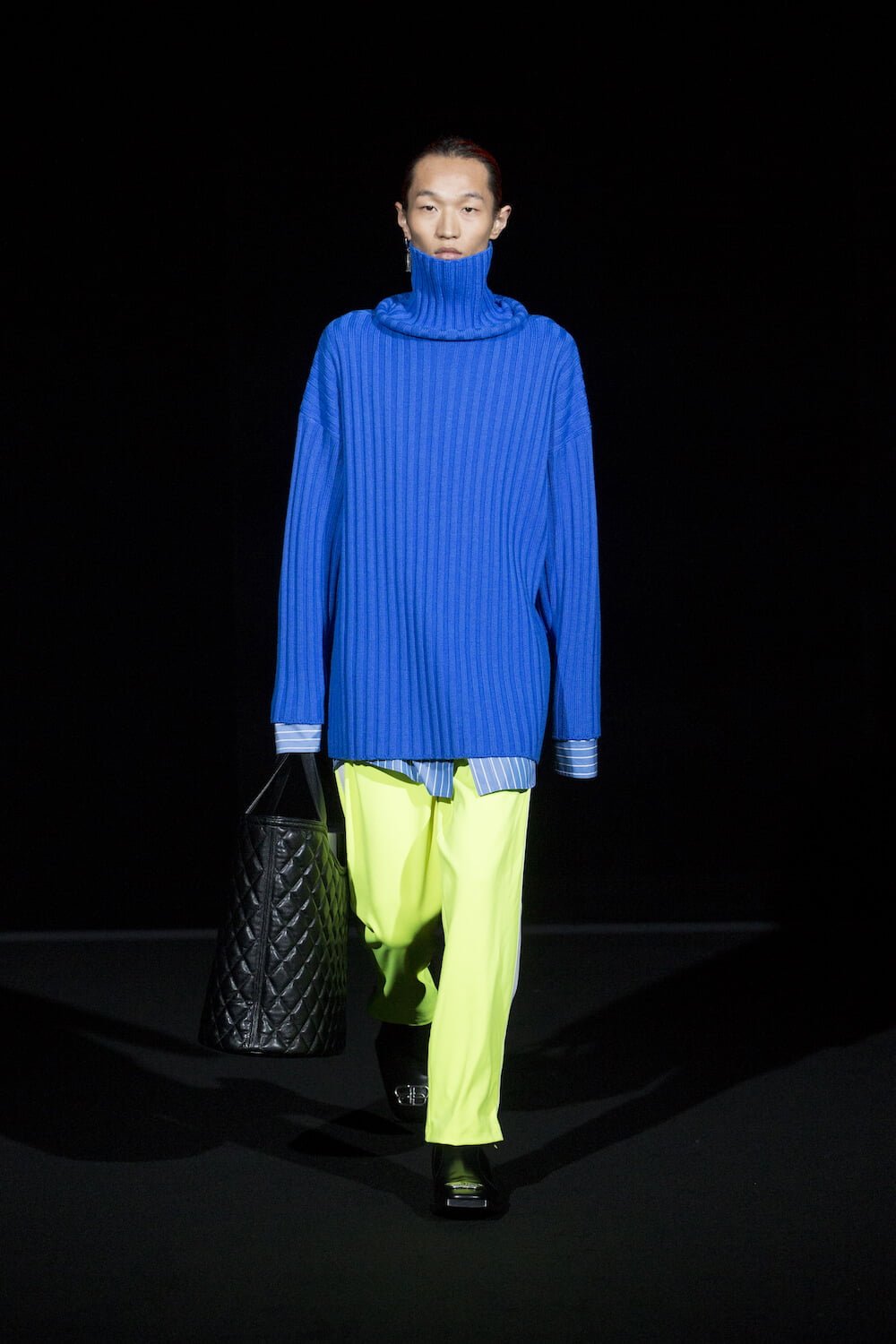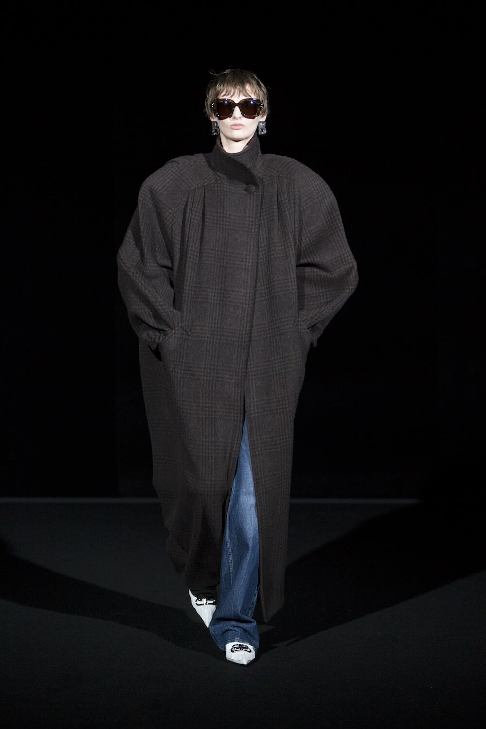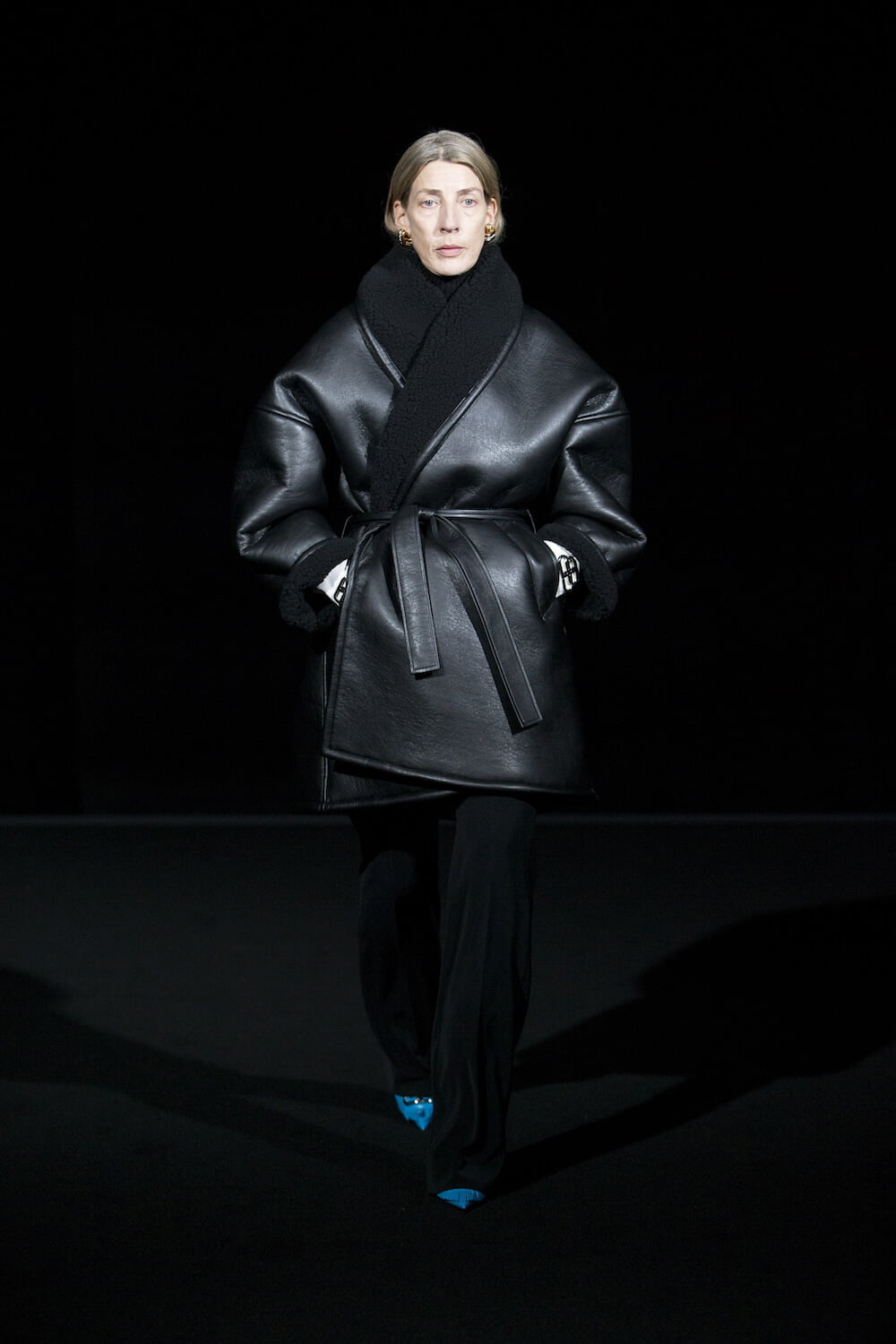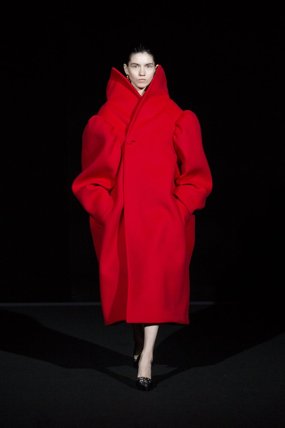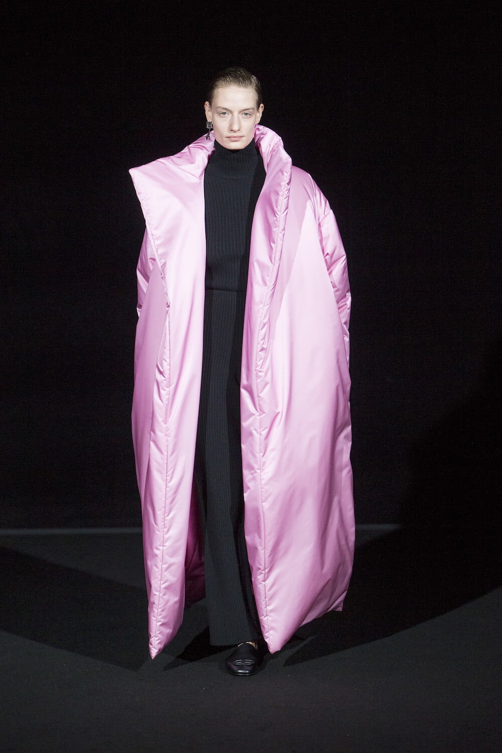 Whereas other designers rely on surface and decoration, Demna Gvasalia brings it back to the line – a tradition at the house. He has created the ultimate modern wardrobe and it all stems from stellar silhouettes. Broadly shouldered coats belted macs with sculptural, stand-up collars (they called them incognito collars), blazer dresses, belted stripper macs, a double-breasted grey trouser suit with no visible fastening that felt modern, not corporate. Jackets had suspended shoulders which lifted the line away from the body. Knits had vase necks. Enveloping duvet coats reached all the way to the floor.