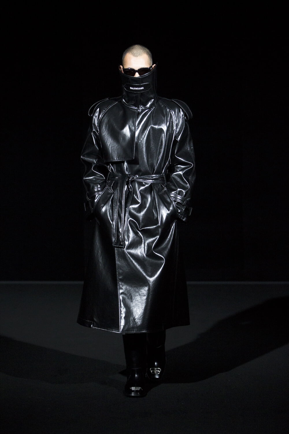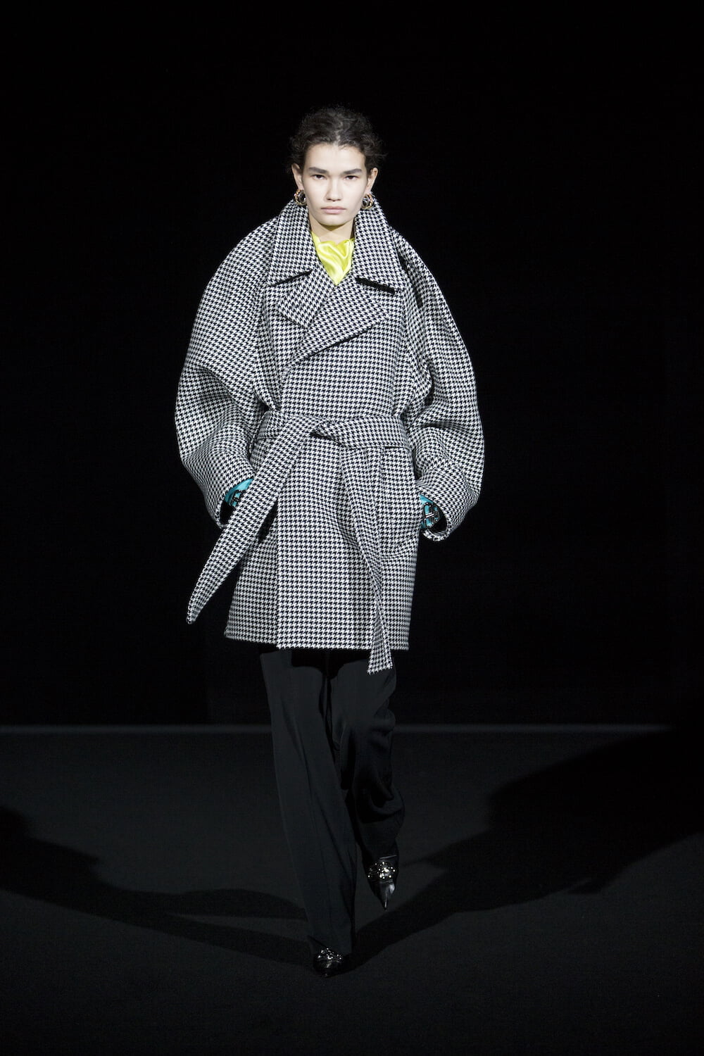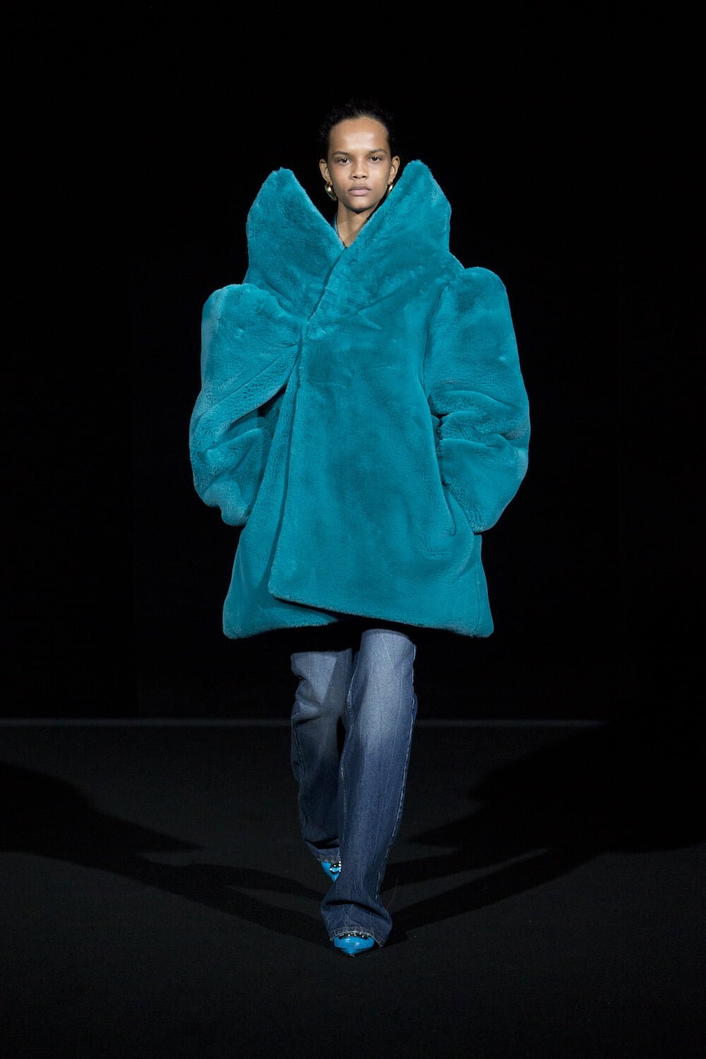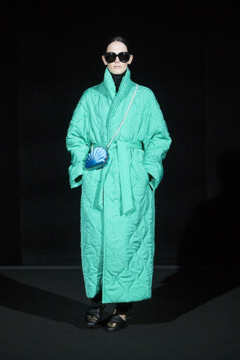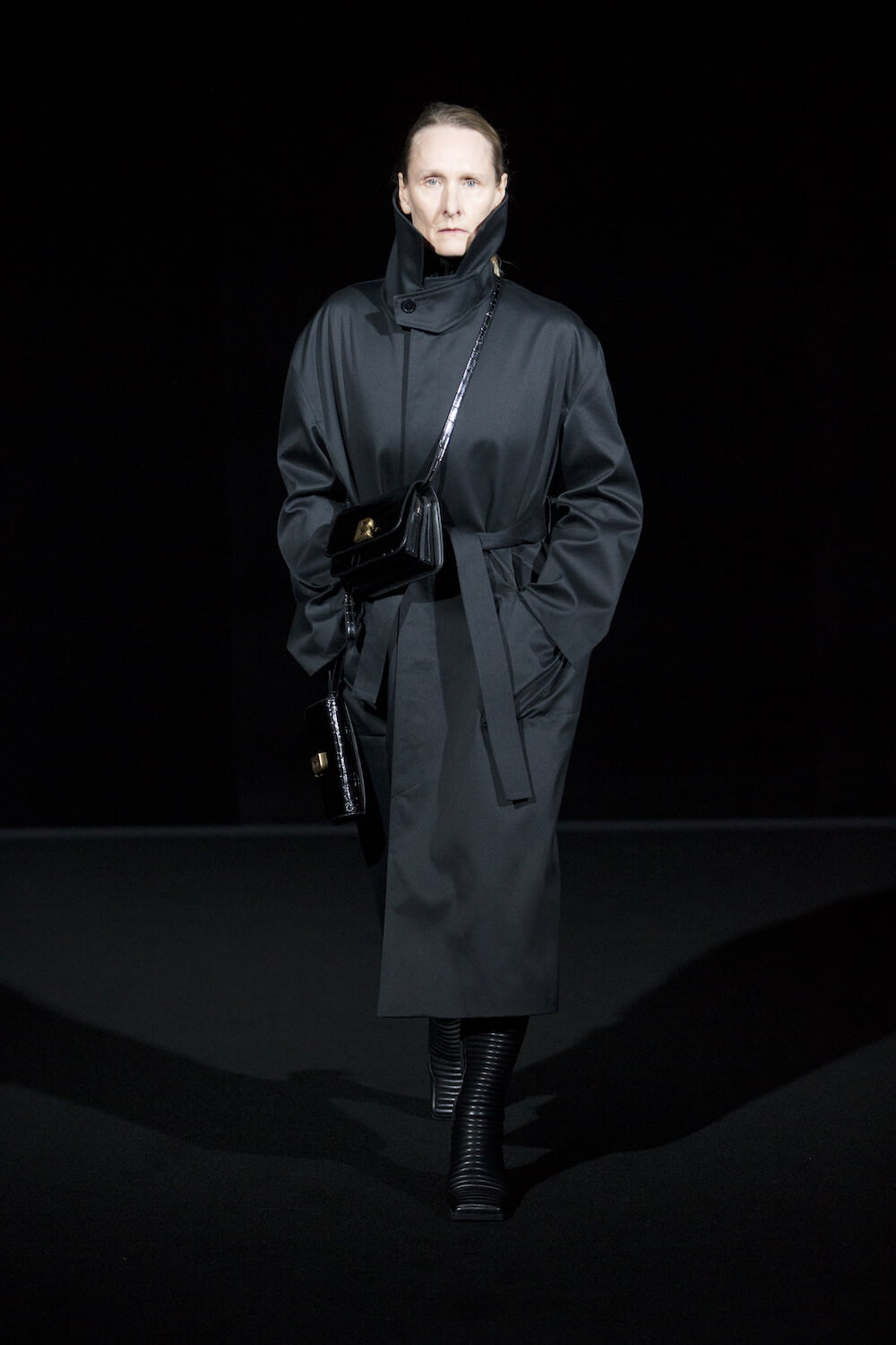Whereas other designers rely on surface and decoration, Demna Gvasalia brings it back to the line – a tradition at the house. He has created the ultimate modern wardrobe and it all stems from stellar silhouettes. Broadly shouldered coats belted macs with sculptural, stand-up collars (they called them incognito collars), blazer dresses, belted stripper macs, a double-breasted grey trouser suit with no visible fastening that felt modern, not corporate. Jackets had suspended shoulders which lifted the line away from the body. Knits had vase necks. Enveloping duvet coats reached all the way to the floor.