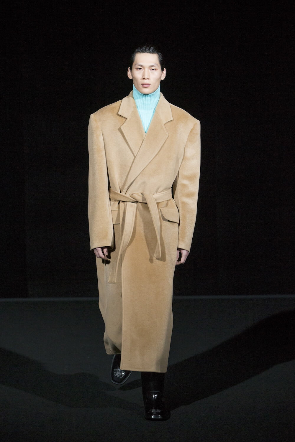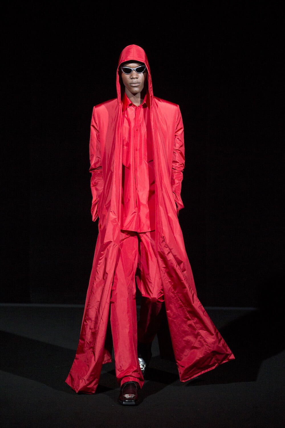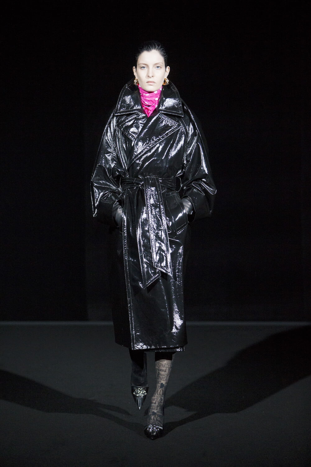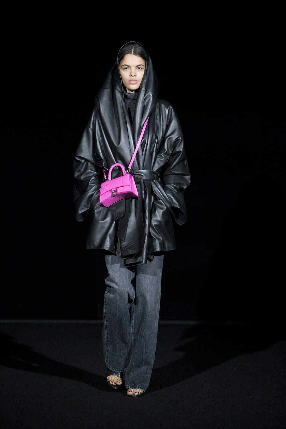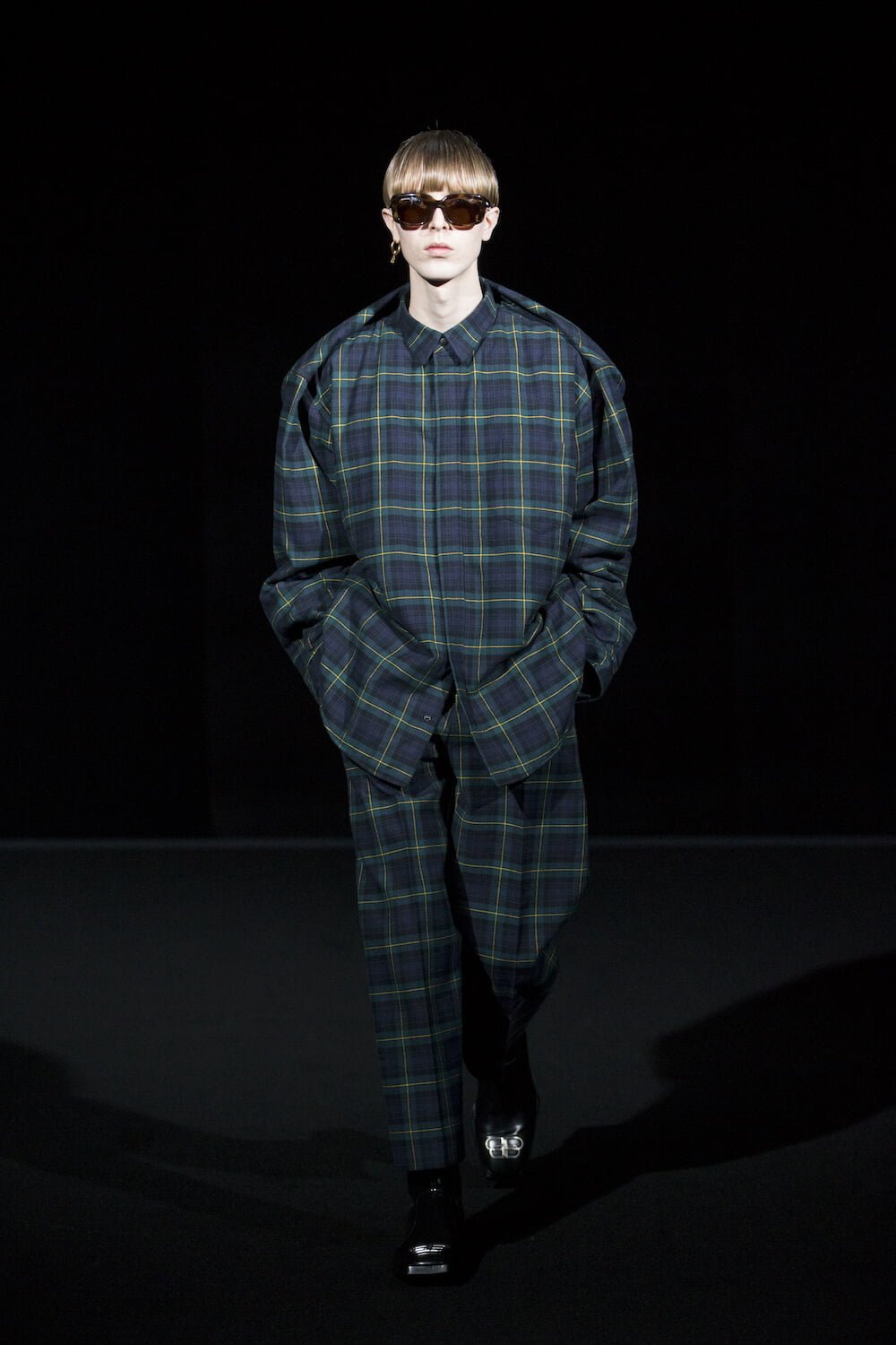 Whereas other designers rely on surface and decoration, Demna Gvasalia brings it back to the line – a tradition at the house. He has created the ultimate modern wardrobe and it all stems from stellar silhouettes. Broadly shouldered coats belted macs with sculptural, stand-up collars (they called them incognito collars), blazer dresses, belted stripper macs, a double-breasted grey trouser suit with no visible fastening that felt modern, not corporate. Jackets had suspended shoulders which lifted the line away from the body. Knits had vase necks. Enveloping duvet coats reached all the way to the floor.