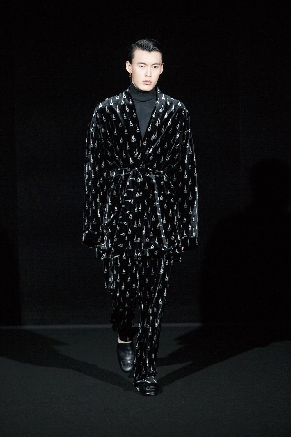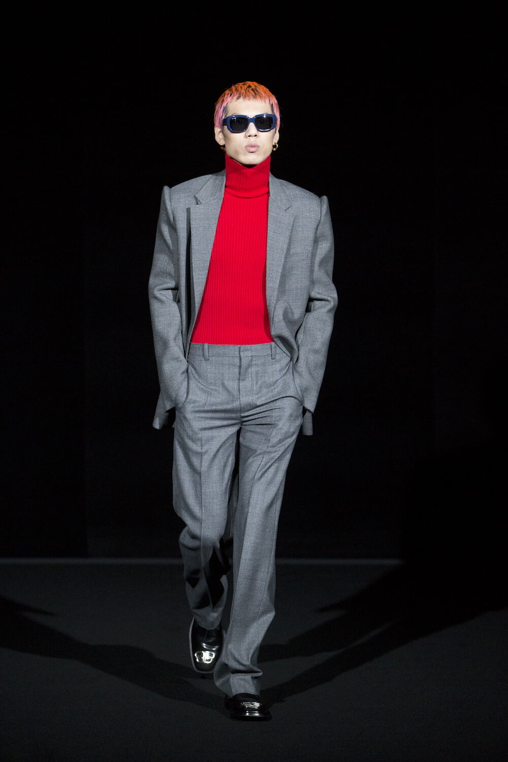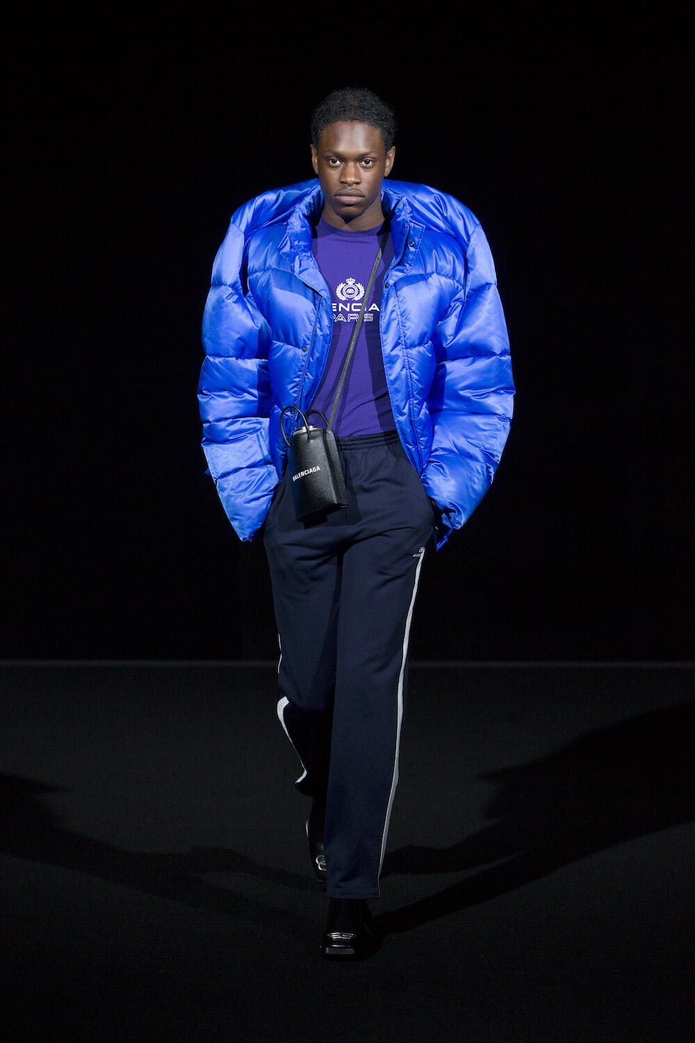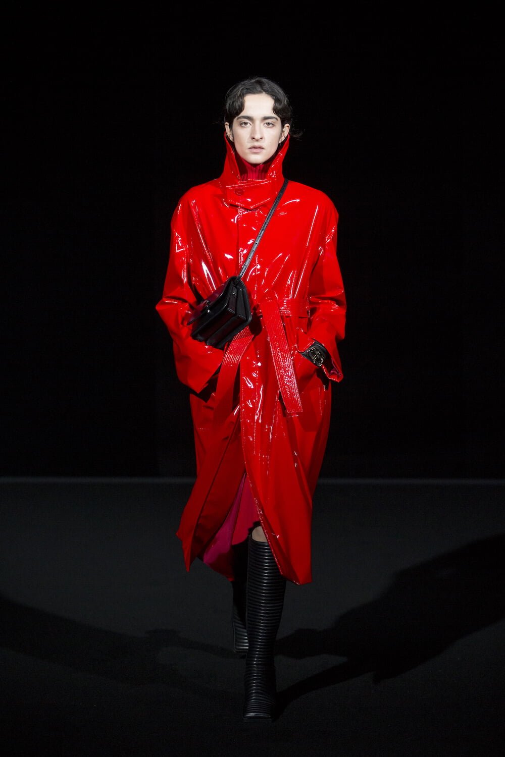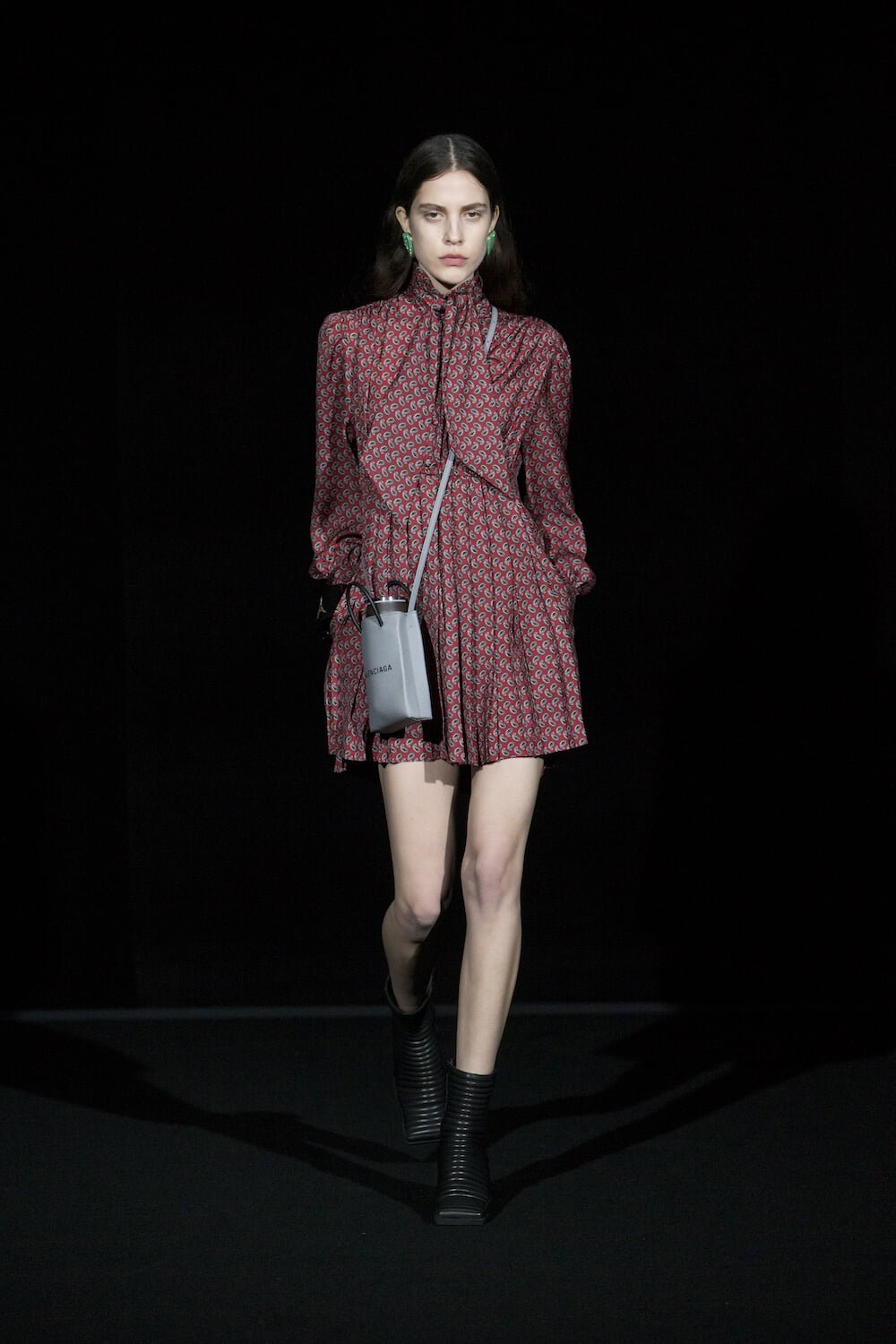 Whereas other designers rely on surface and decoration, Demna Gvasalia brings it back to the line – a tradition at the house. He has created the ultimate modern wardrobe and it all stems from stellar silhouettes. Broadly shouldered coats belted macs with sculptural, stand-up collars (they called them incognito collars), blazer dresses, belted stripper macs, a double-breasted grey trouser suit with no visible fastening that felt modern, not corporate. Jackets had suspended shoulders which lifted the line away from the body. Knits had vase necks. Enveloping duvet coats reached all the way to the floor.