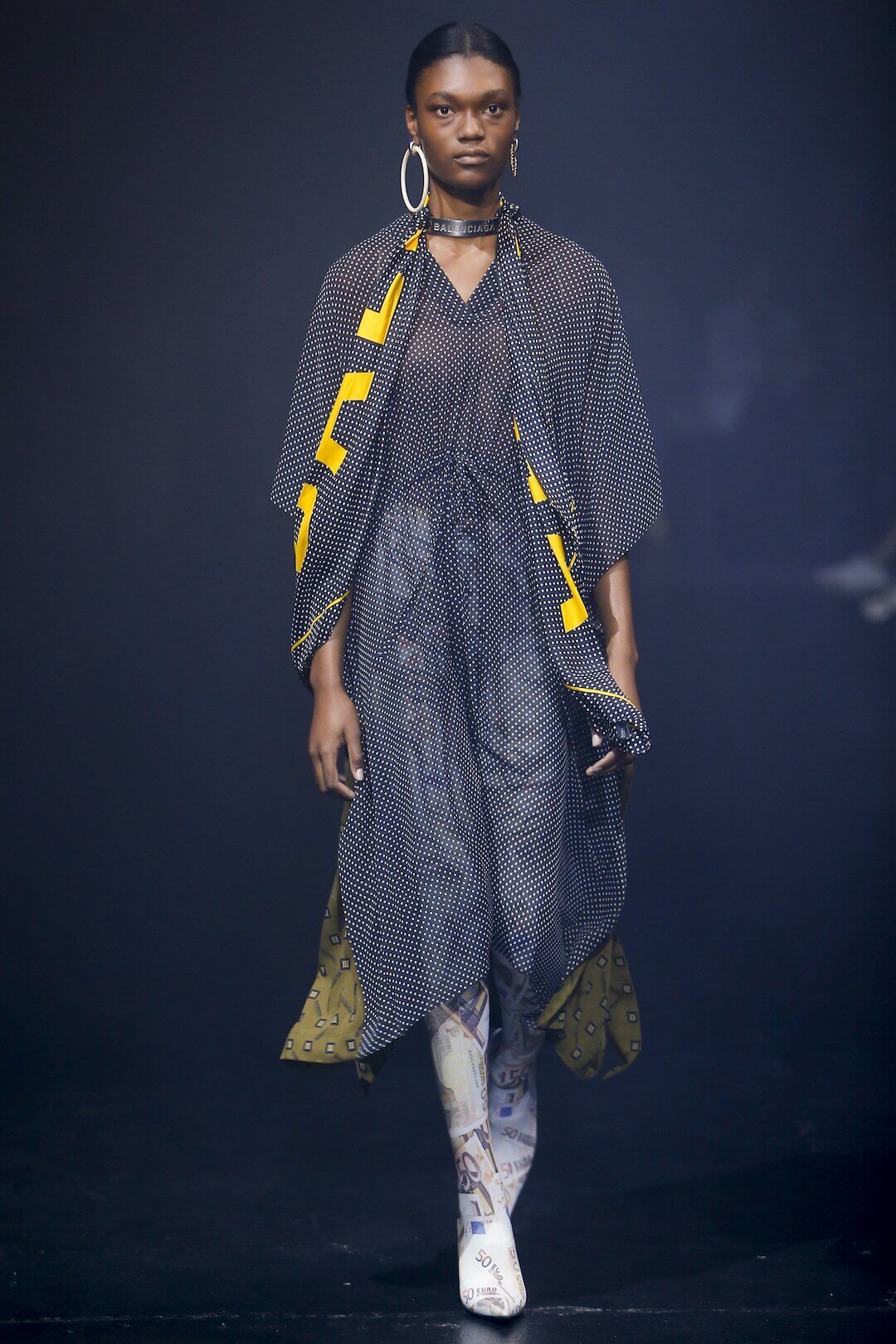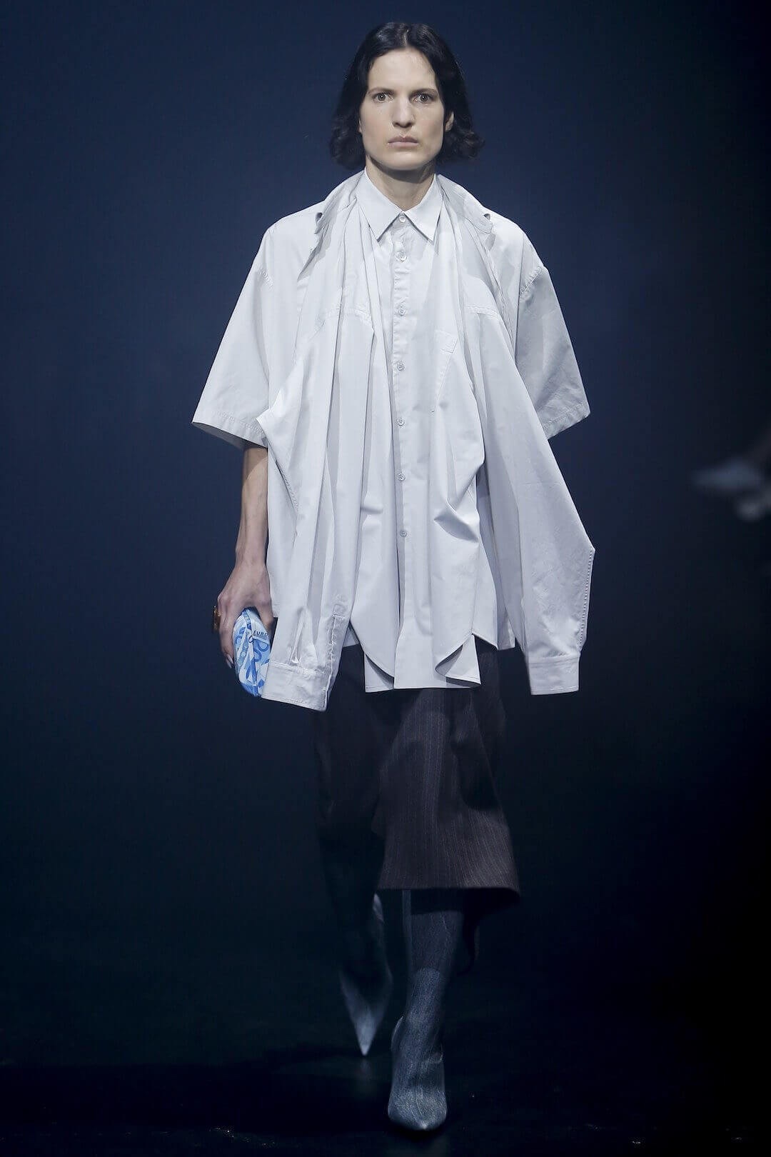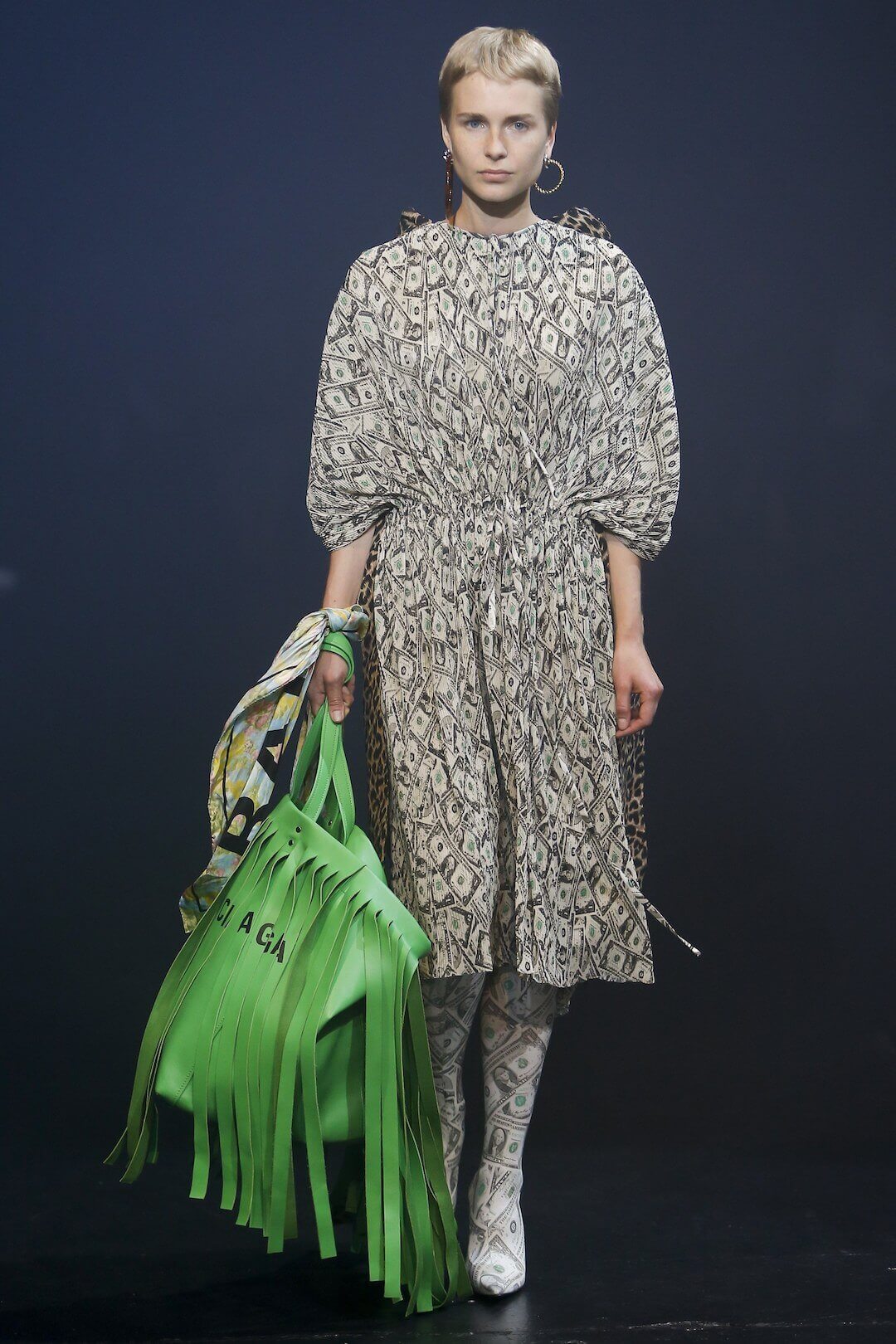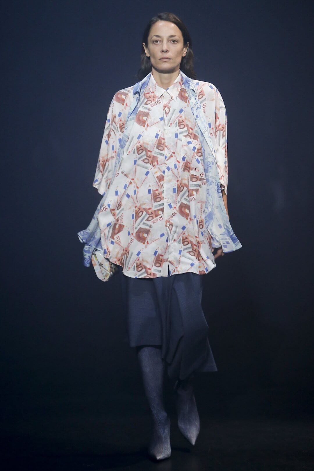 What we *thought* was a cardigan elegantly draped over the shoulders of a model’s shirt in that gorgeous way ladies do, was, in fact, fused to it. What about that for a “garment union”. Designer Demna, said backstage, that he looked closely at the world of the bourgeoisie; “…something I don’t know a great deal about”. He then fused it with that which he does know: streetwear. Et voila! New garments. Beautiful strange exciting new garments. The bags were mad. They had odd-looking leather coverings over them like covers on a bird cage when it’s nighttime. Quite fabulous. Quite mad. And the money references, the Euro print on a dress? “Money is all around us!” added Demna.