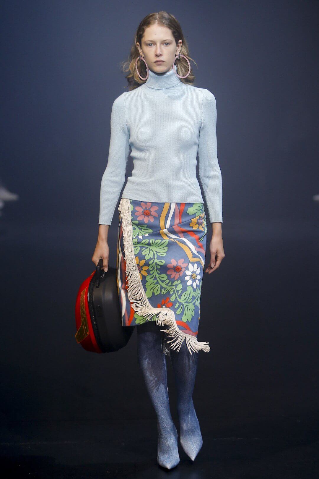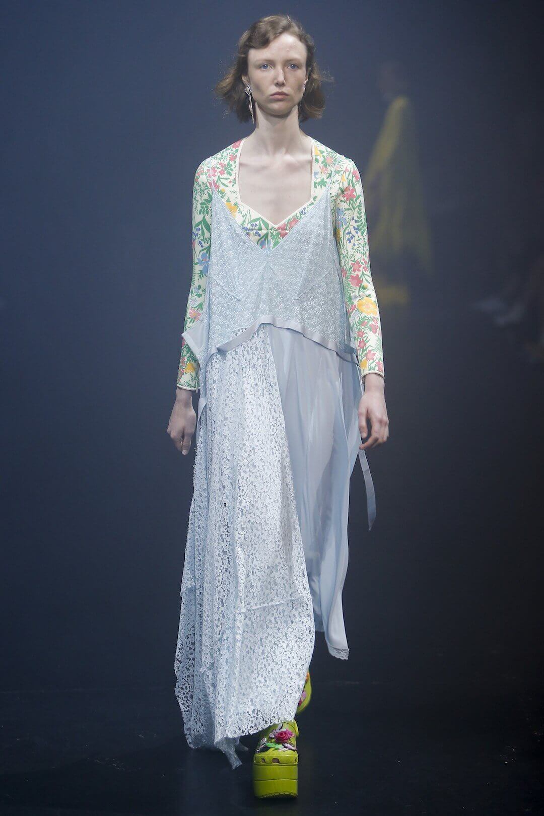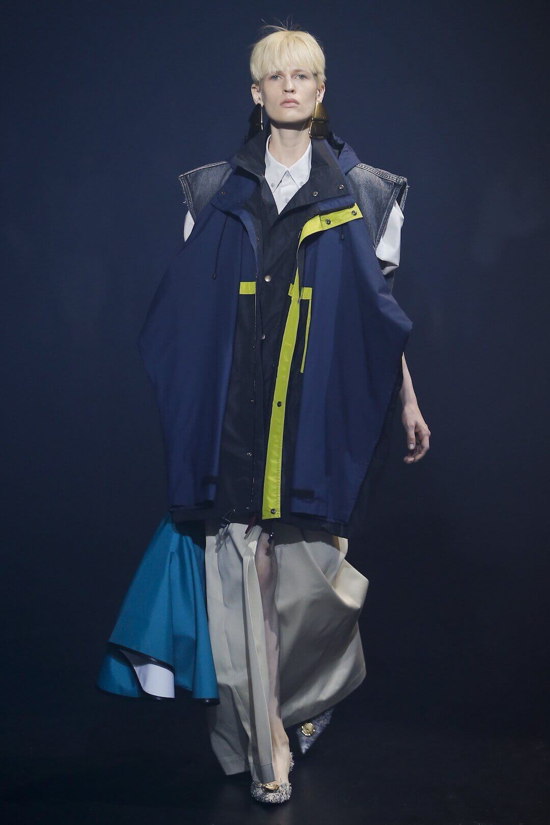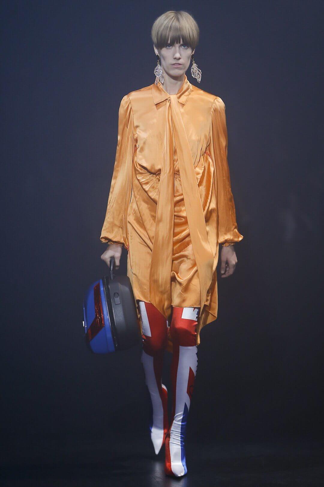 What we *thought* was a cardigan elegantly draped over the shoulders of a model’s shirt in that gorgeous way ladies do, was, in fact, fused to it. What about that for a “garment union”. Designer Demna, said backstage, that he looked closely at the world of the bourgeoisie; “…something I don’t know a great deal about”. He then fused it with that which he does know: streetwear. Et voila! New garments. Beautiful strange exciting new garments. The bags were mad. They had odd-looking leather coverings over them like covers on a bird cage when it’s nighttime. Quite fabulous. Quite mad. And the money references, the Euro print on a dress? “Money is all around us!” added Demna.