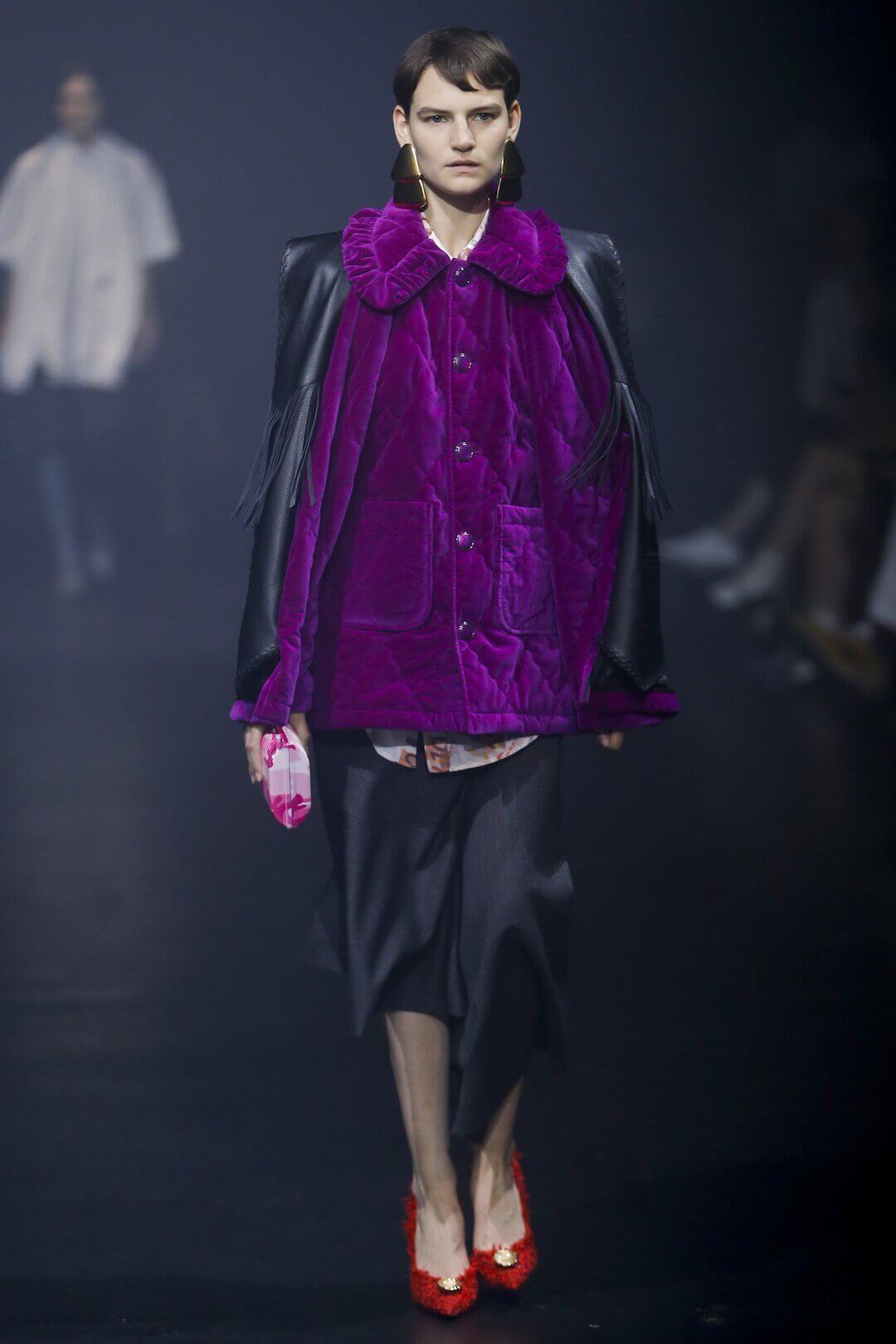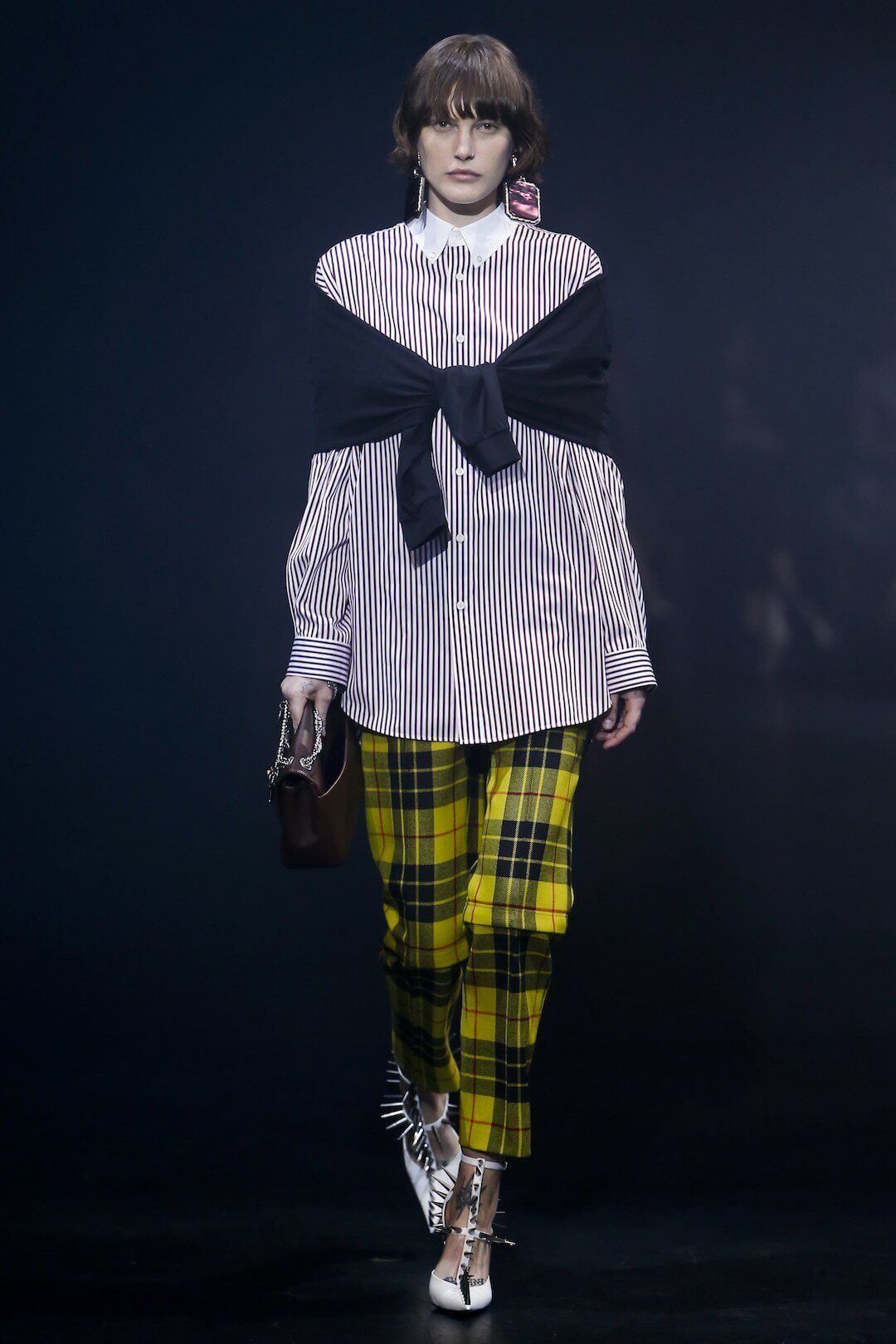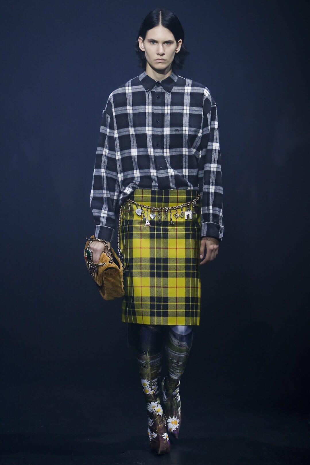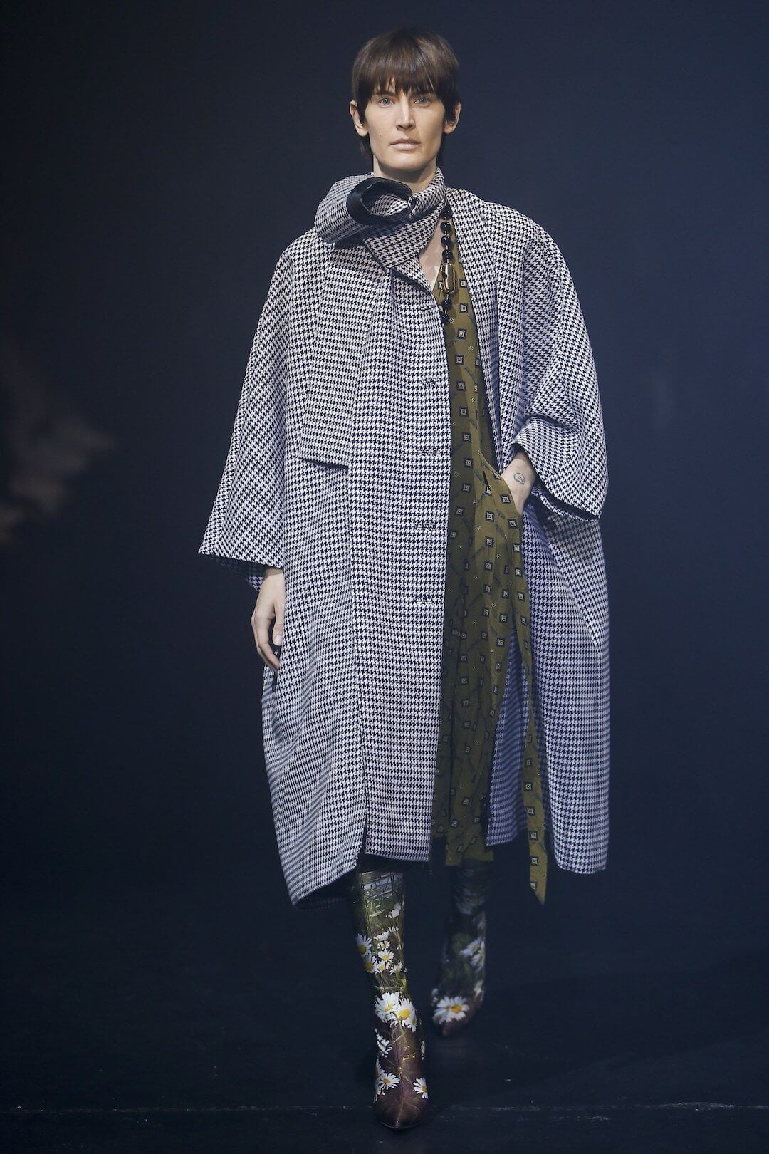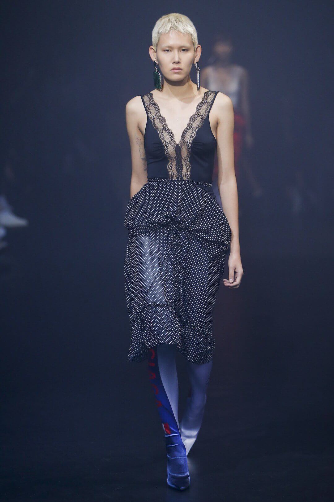 What we *thought* was a cardigan elegantly draped over the shoulders of a model’s shirt in that gorgeous way ladies do, was, in fact, fused to it. What about that for a “garment union”. Designer Demna, said backstage, that he looked closely at the world of the bourgeoisie; “…something I don’t know a great deal about”. He then fused it with that which he does know: streetwear. Et voila! New garments. Beautiful strange exciting new garments. The bags were mad. They had odd-looking leather coverings over them like covers on a bird cage when it’s nighttime. Quite fabulous. Quite mad. And the money references, the Euro print on a dress? “Money is all around us!” added Demna.