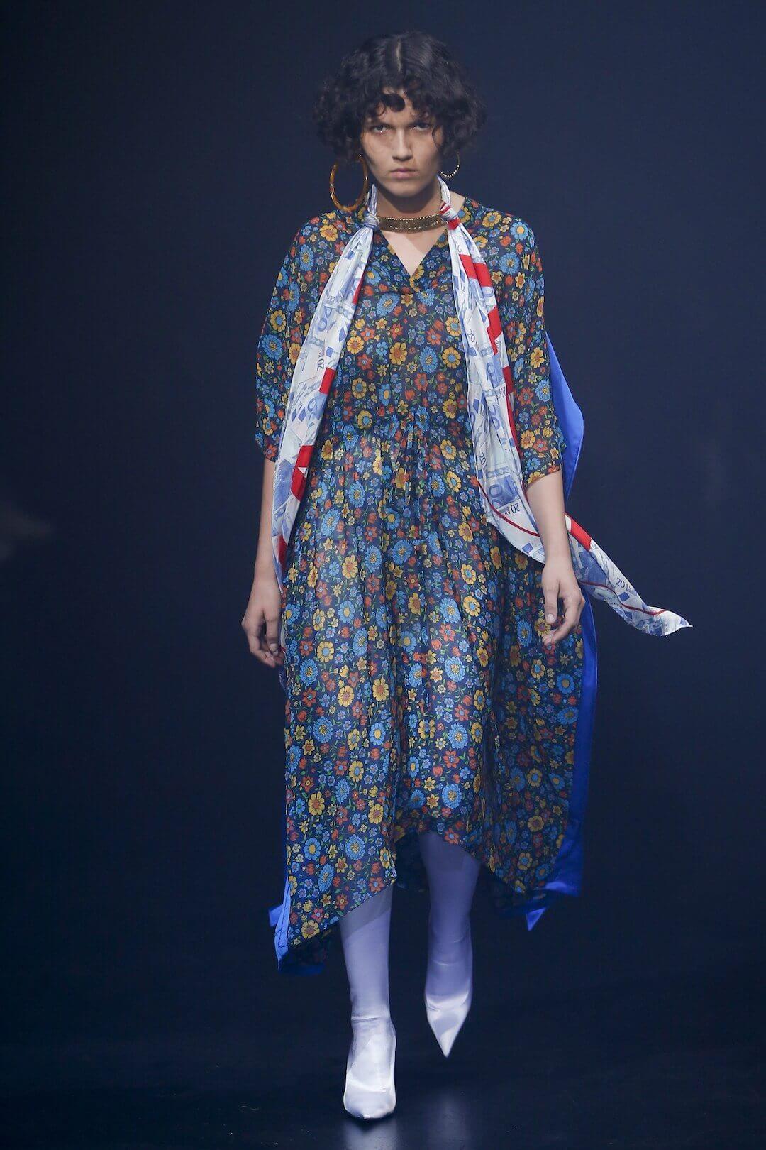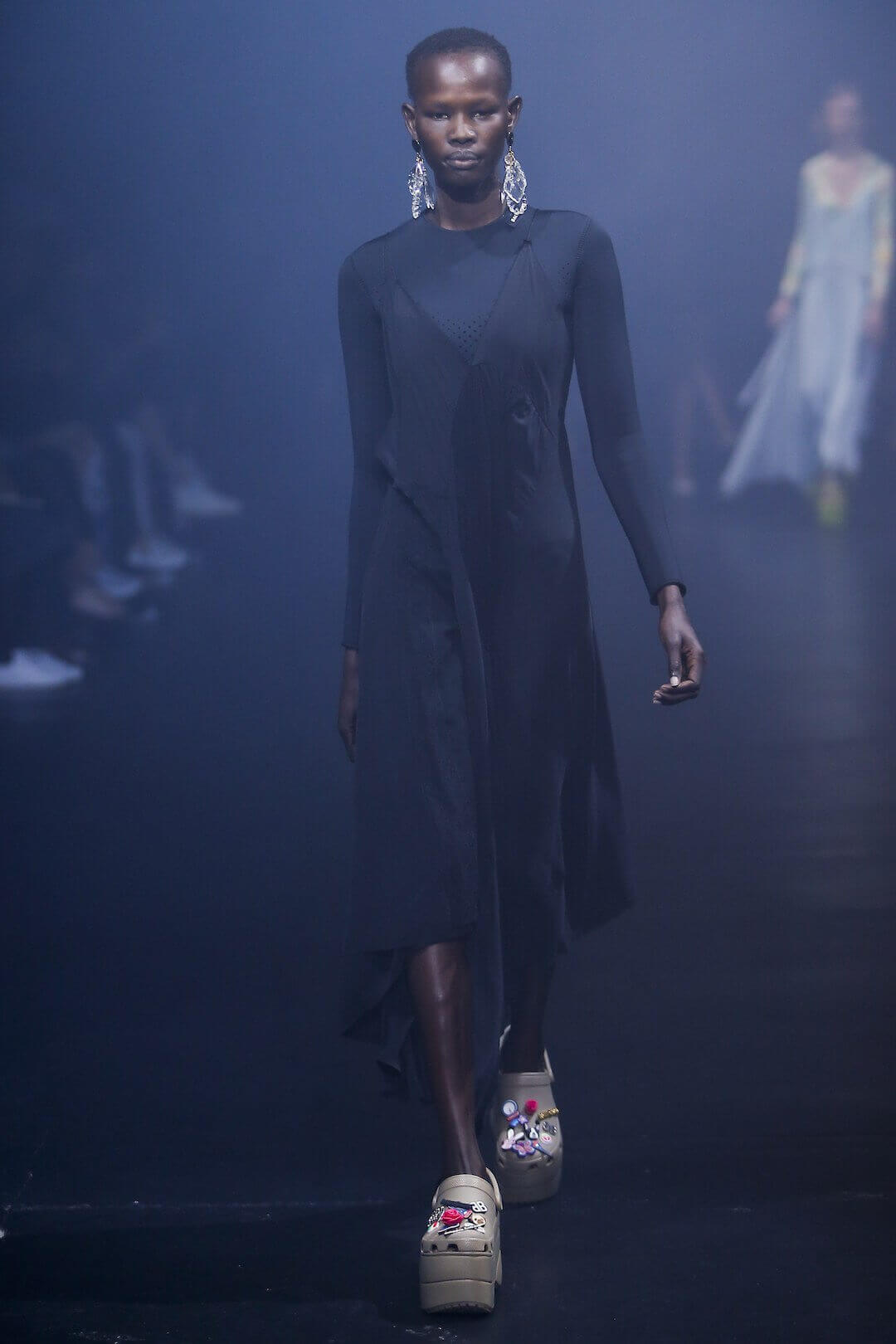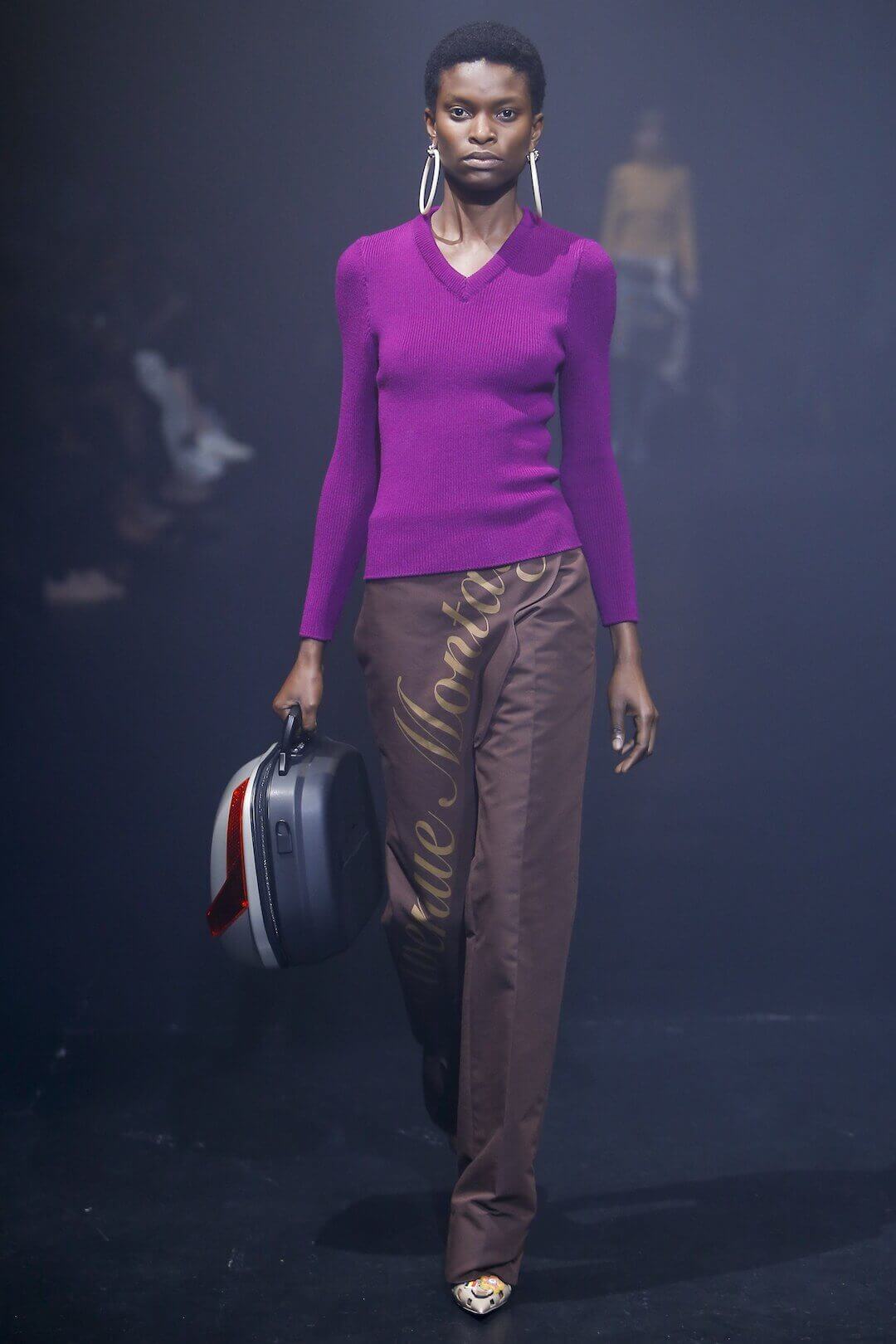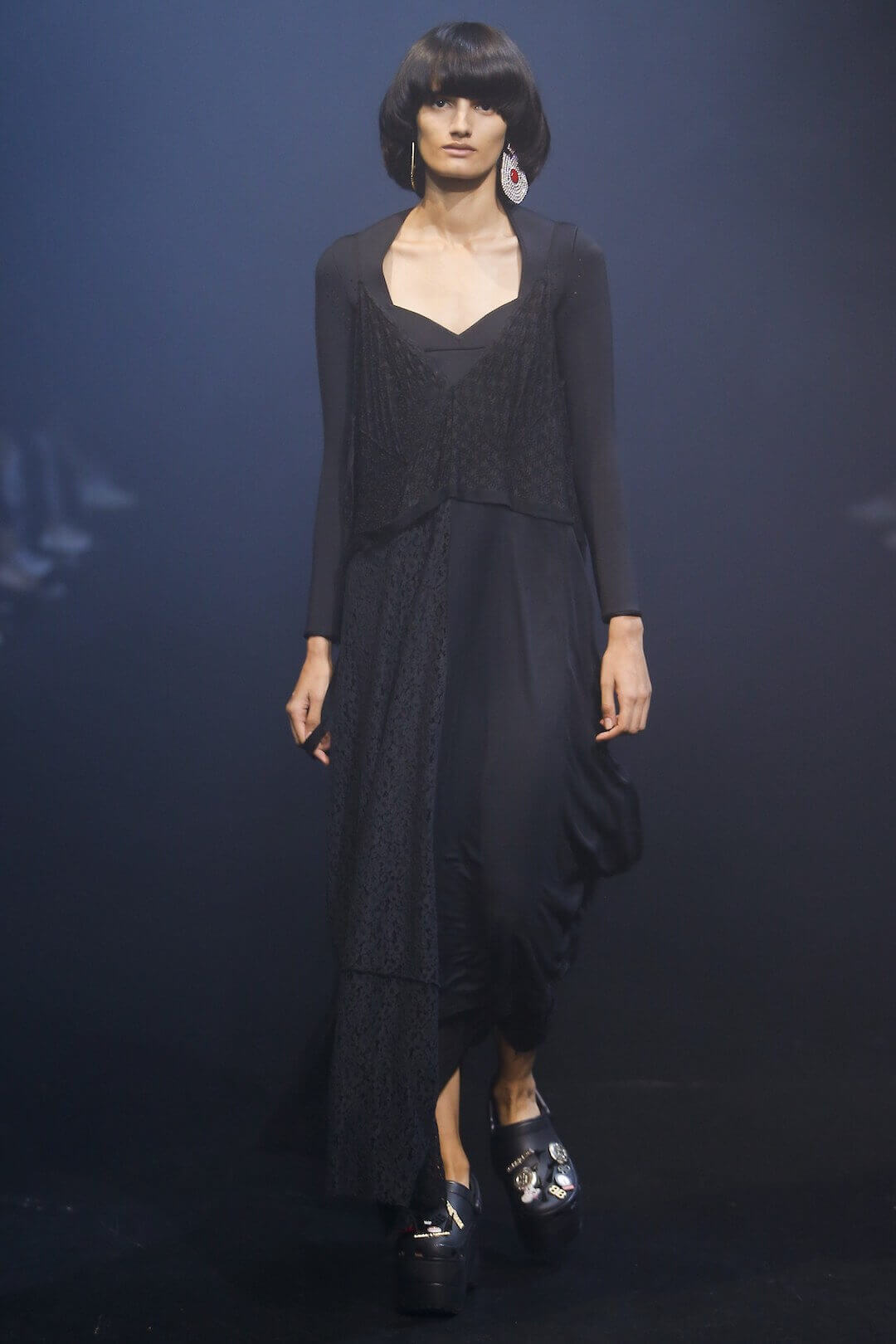 What we *thought* was a cardigan elegantly draped over the shoulders of a model’s shirt in that gorgeous way ladies do, was, in fact, fused to it. What about that for a “garment union”. Designer Demna, said backstage, that he looked closely at the world of the bourgeoisie; “…something I don’t know a great deal about”. He then fused it with that which he does know: streetwear. Et voila! New garments. Beautiful strange exciting new garments. The bags were mad. They had odd-looking leather coverings over them like covers on a bird cage when it’s nighttime. Quite fabulous. Quite mad. And the money references, the Euro print on a dress? “Money is all around us!” added Demna.