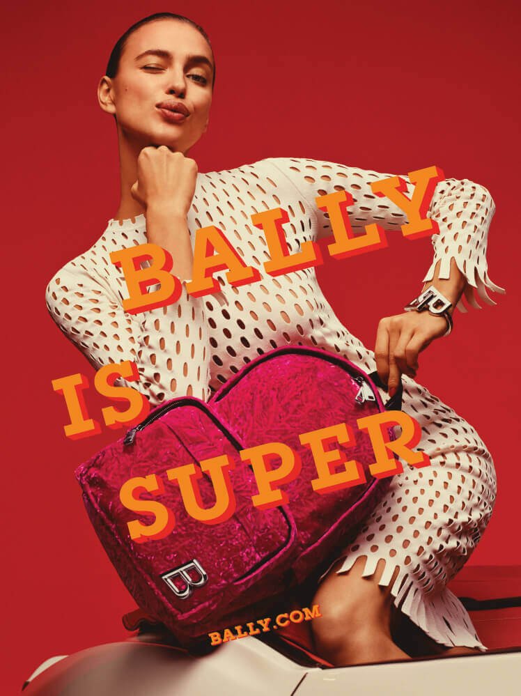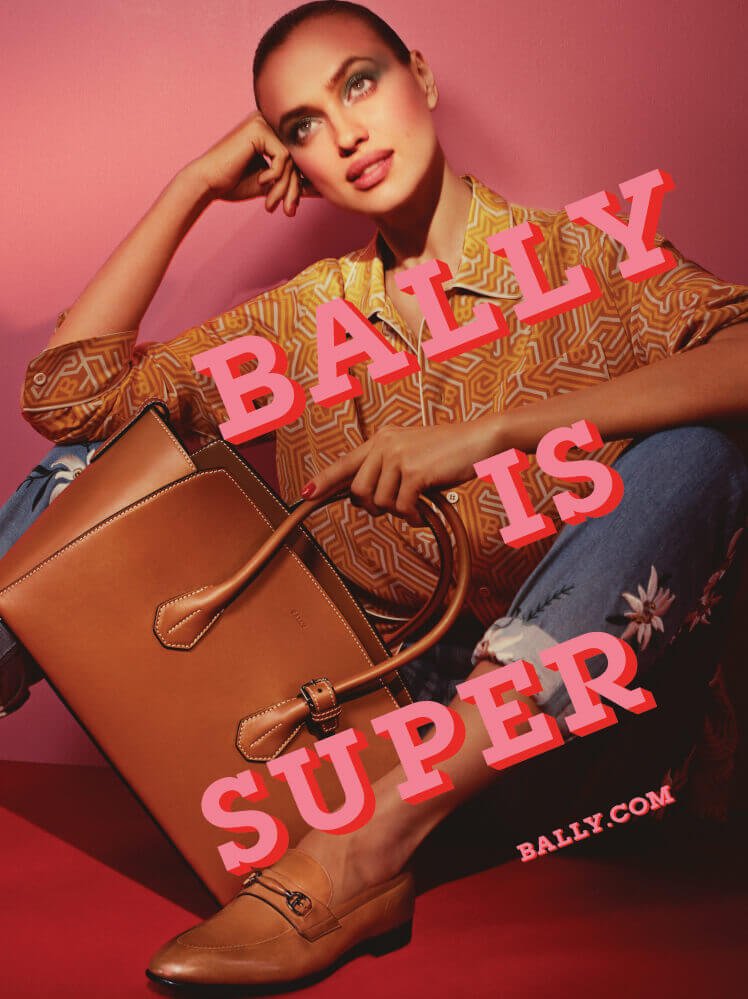 Always good to be upfront we say. If you know you’re super, why not tell the world you are? And super are Bally, and super is this campaign, which also (sorry for the slight repetition here) says BALLY IS SUPER across it. Which is, in fact, an old Bally slogan from 1979. Basically the Eighties – something we reference because here the lovely Irina Shayk is serving up a hot dose of 1980s supermodel, working the life out of those two large Bally bags. Let’s call it a full body smize. Work, sashay, shante!