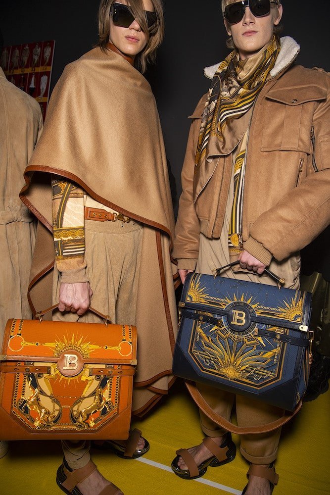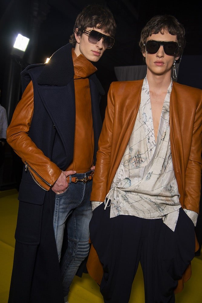 Soundtracked to Florence and the Machine’s Spectrum, the Balmain boys trecked against a sand dunes backdrop in only the finest of fabrics. Layers of cashmere came draped upon one another in earthy browns and rustic oranges. Each wore slightly sagged trousers that fell into creases at the pockets – paired with sand-hued dessert boots and chunky sandals. A dazzling chorus of eyewear with newfound collaborators, Akoni, shielded the Balmain army as they made their excursion, some clad in wrapped and warped tailoring, others in fantastic trompe-l’œil shirting.