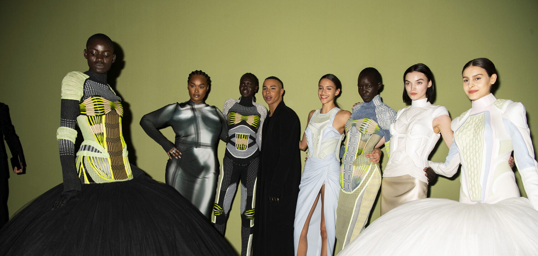 Olivier Rousteing has spent the last decade creating party dresses with the properties of armour. Structural, sharp and emblazoned in embellishments, he designs with the intention of making his loyal clientele, who he has long dubbed the Balmain army, feel strong and courageous through their day-to-day.