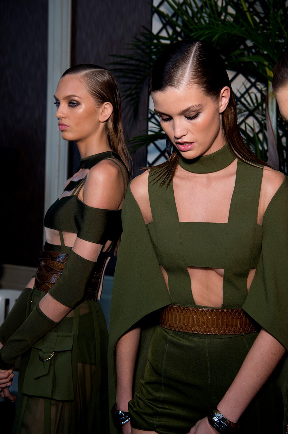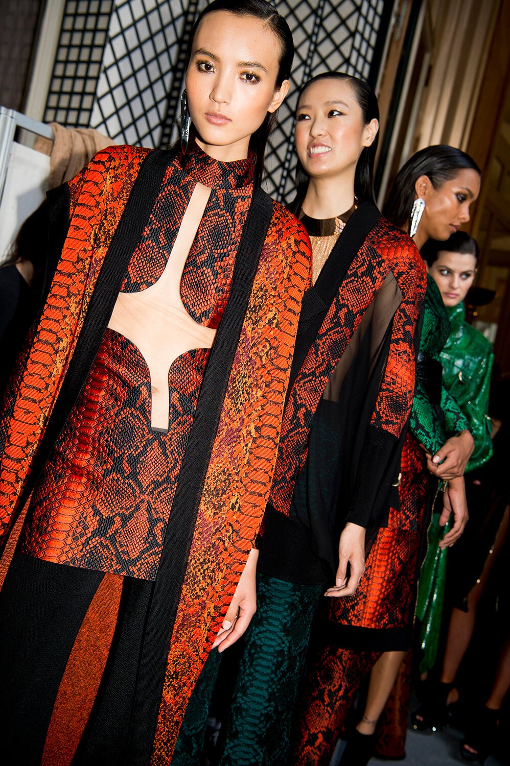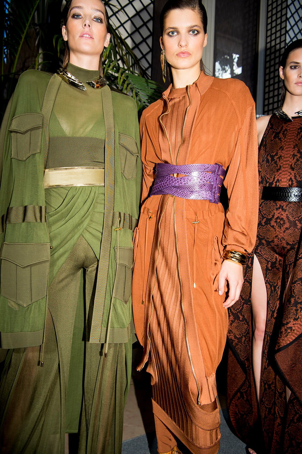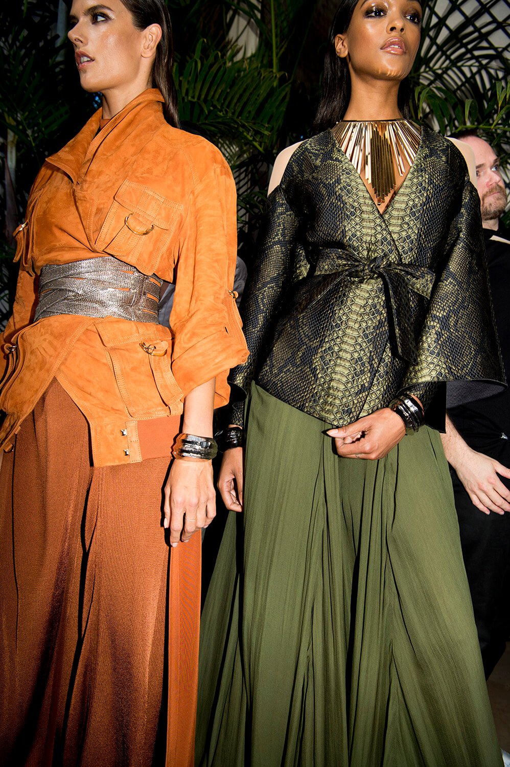 If you’ve read the press notes, you’ll probably find that what we’re about to say has little to do with them, but then we didn’t read then, because we were far too busy using our eyes for the more important task of feasting on Balmain’s most fabulous SS17 offering, presented this afternoon at Hotel Potocki. So, imagine a seventies Jerry Hall, draped in satin, slashed across her chest and slashed to where angels fear to tread. It was softer this season, the Balmain army in repose. Well, everyone needs a break from being fierce. Not that they weren’t fierce, more feminine would be a more fitting description. With a safari slant. Well, if, as the setting would suggest, they’re in the jungle, a safari pocket does make sense. As does freshly oiled snakeskin. Floor length silks, some sheerer than others, in a palette of army greens ands rich peaches were draped and wrapped around the body, almost kimono, or ballet leotard like, falling loosely to the floor, cinched in at the waist, and worn with metal collars or cuffs that gave the models an air of tribal queen, something further underscored by the lurex kaftans. Or would that give them more an air of Elizabeth Taylor? She was fond of a kaftan after all, and you can imagine her on safari dressed in anything less than Balmain? I mean it may not be the most practical but then glamour was never meant to be, and lets be real, this wasn’t designed for an actual jungle, this was made for the urban jungle. One where palazzo pants and chainmail are de rigueur. One that ever so slightly resembles a disco era New York.