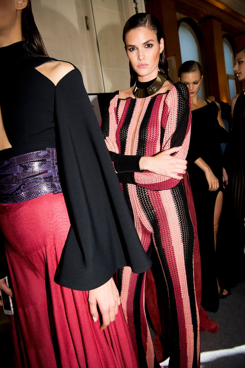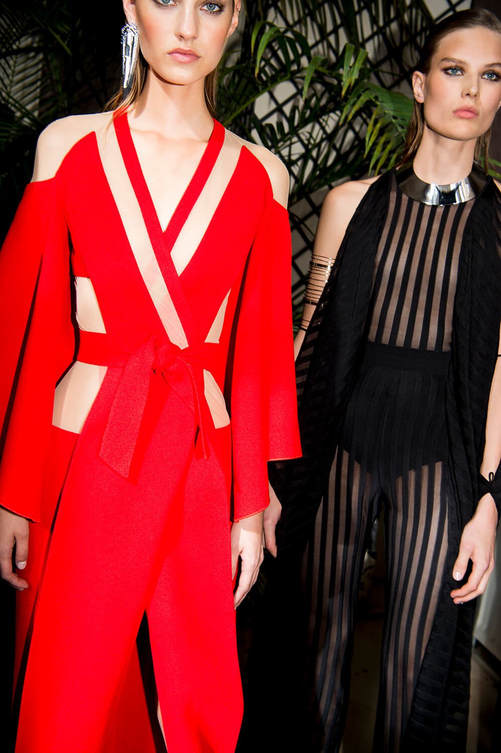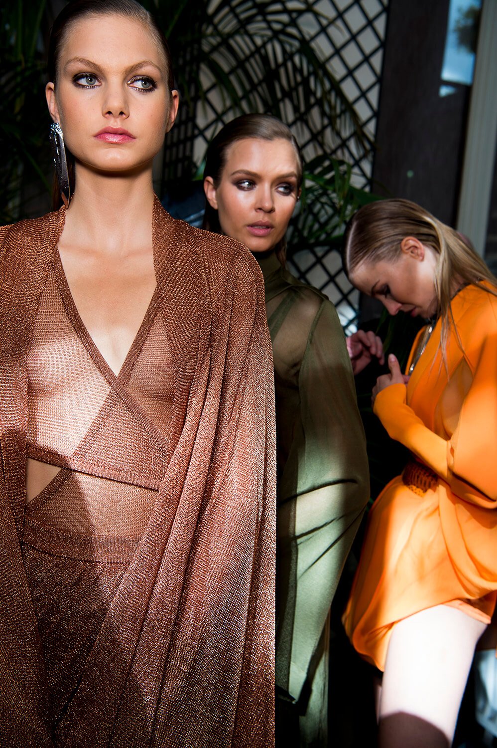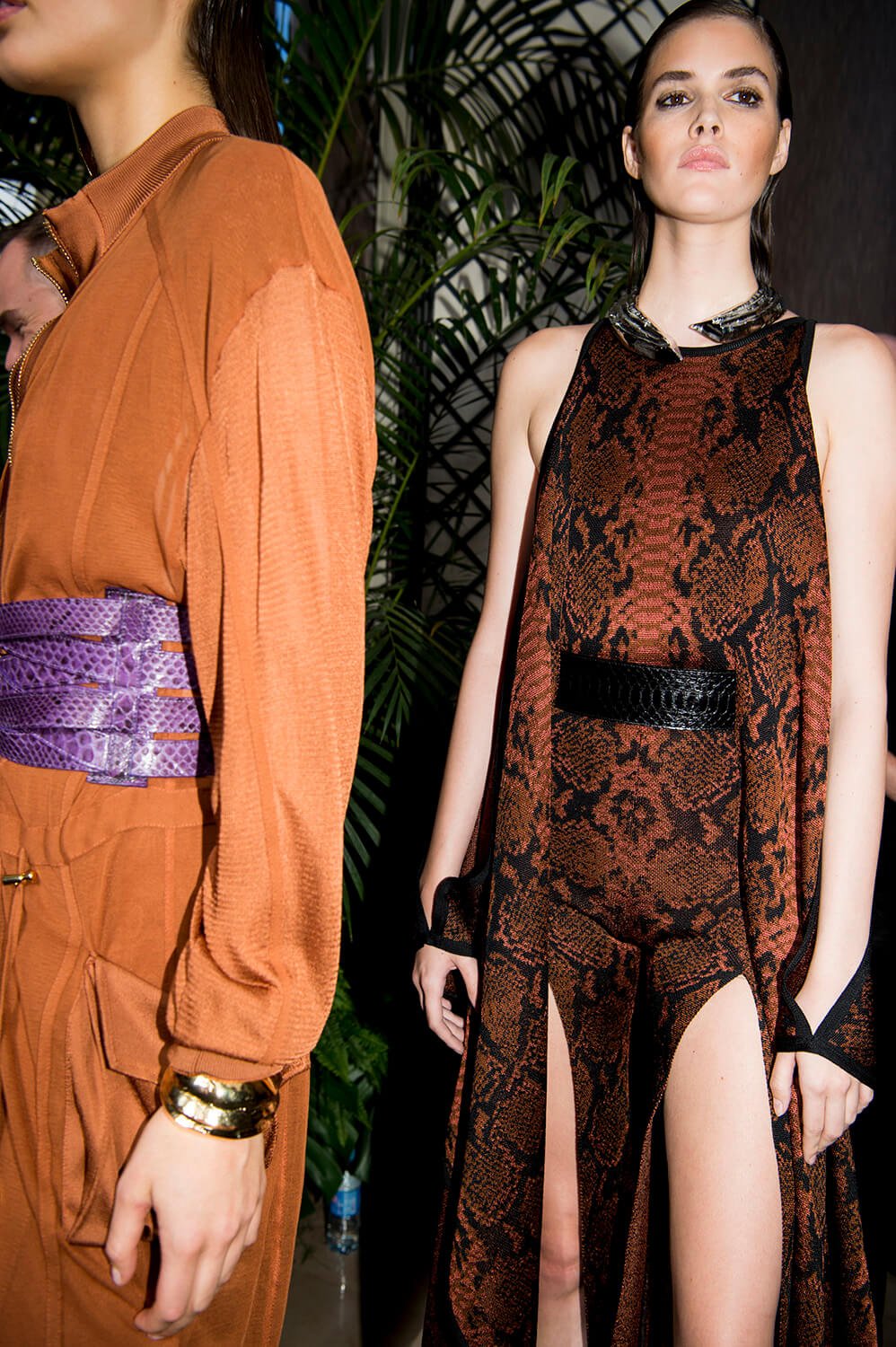If you’ve read the press notes, you’ll probably find that what we’re about to say has little to do with them, but then we didn’t read then, because we were far too busy using our eyes for the more important task of feasting on Balmain’s most fabulous SS17 offering, presented this afternoon at Hotel Potocki. So, imagine a seventies Jerry Hall, draped in satin, slashed across her chest and slashed to where angels fear to tread. It was softer this season, the Balmain army in repose. Well, everyone needs a break from being fierce. Not that they weren’t fierce, more feminine would be a more fitting description. With a safari slant. Well, if, as the setting would suggest, they’re in the jungle, a safari pocket does make sense. As does freshly oiled snakeskin. Floor length silks, some sheerer than others, in a palette of army greens ands rich peaches were draped and wrapped around the body, almost kimono, or ballet leotard like, falling loosely to the floor, cinched in at the waist, and worn with metal collars or cuffs that gave the models an air of tribal queen, something further underscored by the lurex kaftans. Or would that give them more an air of Elizabeth Taylor? She was fond of a kaftan after all, and you can imagine her on safari dressed in anything less than Balmain? I mean it may not be the most practical but then glamour was never meant to be, and lets be real, this wasn’t designed for an actual jungle, this was made for the urban jungle. One where palazzo pants and chainmail are de rigueur. One that ever so slightly resembles a disco era New York.