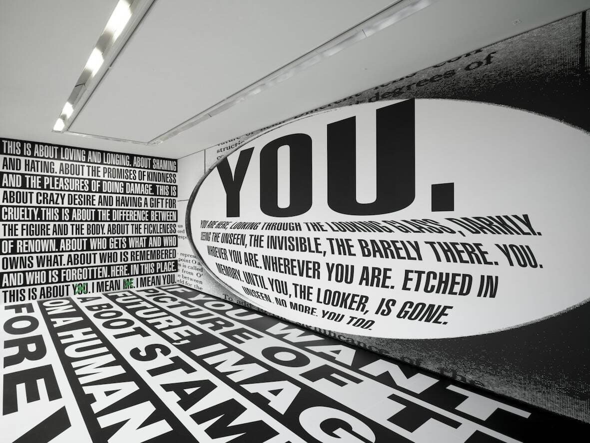 With an enclosed chamber to the main exhibition space, the work ‘Barbara Kruger, Forever’ shows the artist’s exploration of methods of advertising, frequently using architecture to overwhelm viewers, surrounding them in her installations and imposing a direct address. In this immersive installation covering all the walls and floor of the gallery, Kruger again combines her words with those of others. A quote from George Orwell’s 1984 is installed on the floor, while a work featuring a quote by Virginia Woolf from a 1928 lecture appears on the longest wall. Presented as though looking through a magnifying glass, the first word, ‘YOU’, appears monumental. “Architecture is my first love. I try to spatialise ideas,” she says.