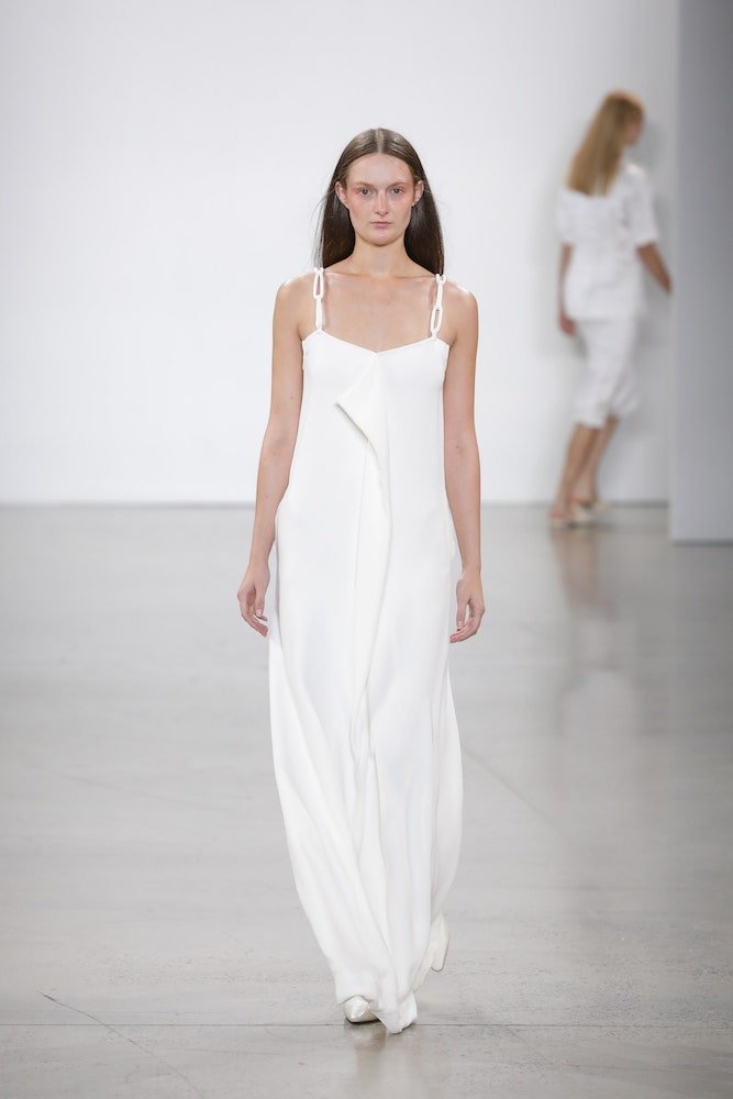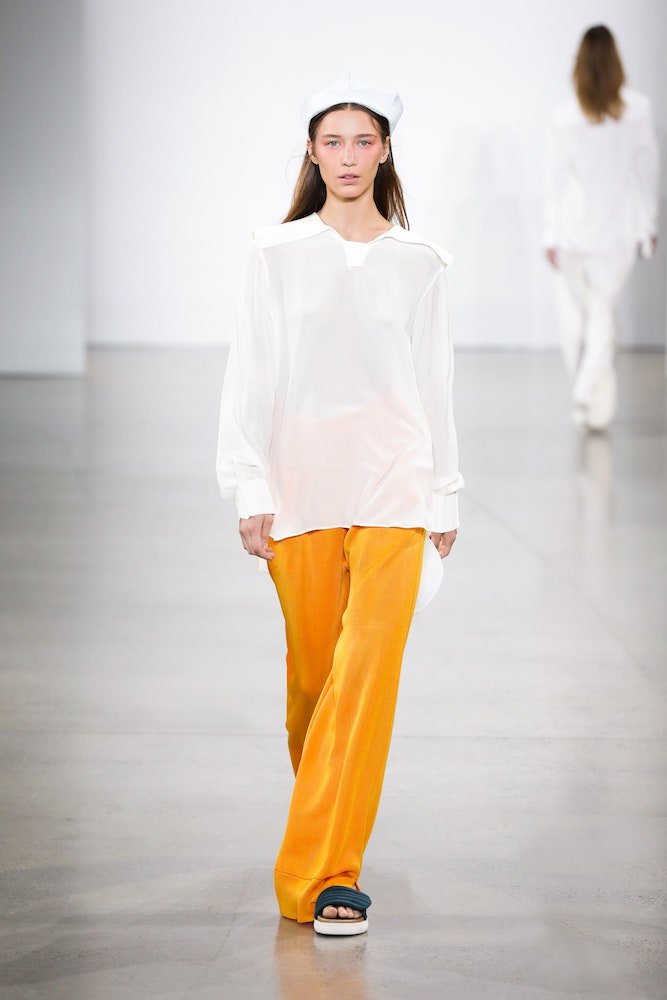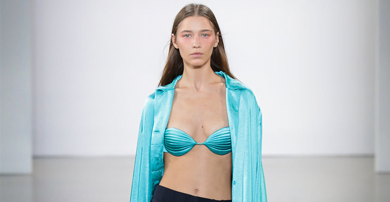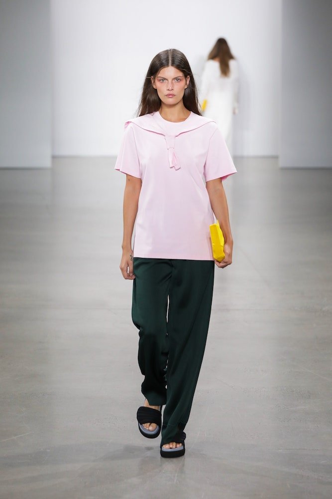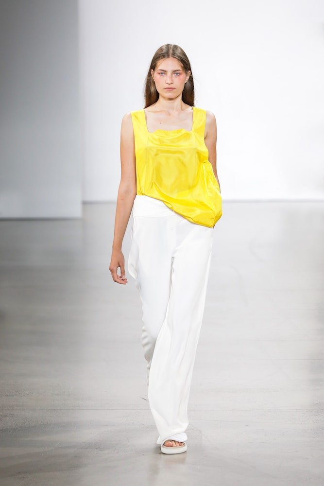 This season’s look doesn’t just give a slight nod to the marine, but taps into the world’s current eco-crisis. Bevza’s sustainable mentality has grown each season and now Svitlana Bevza presents boxy sleeveless tops meant to resemble plastic shopping bags and patchwork dresses crafted from old fabric leftovers. This season, Bevza strayed away from its traditional muted tones and sneaked in some bright hues of marigold, turquoise, light blue and baby pink. Small handheld clutches were accompanied by oversized beach bags and paired with open-toed summery sandals and slides.