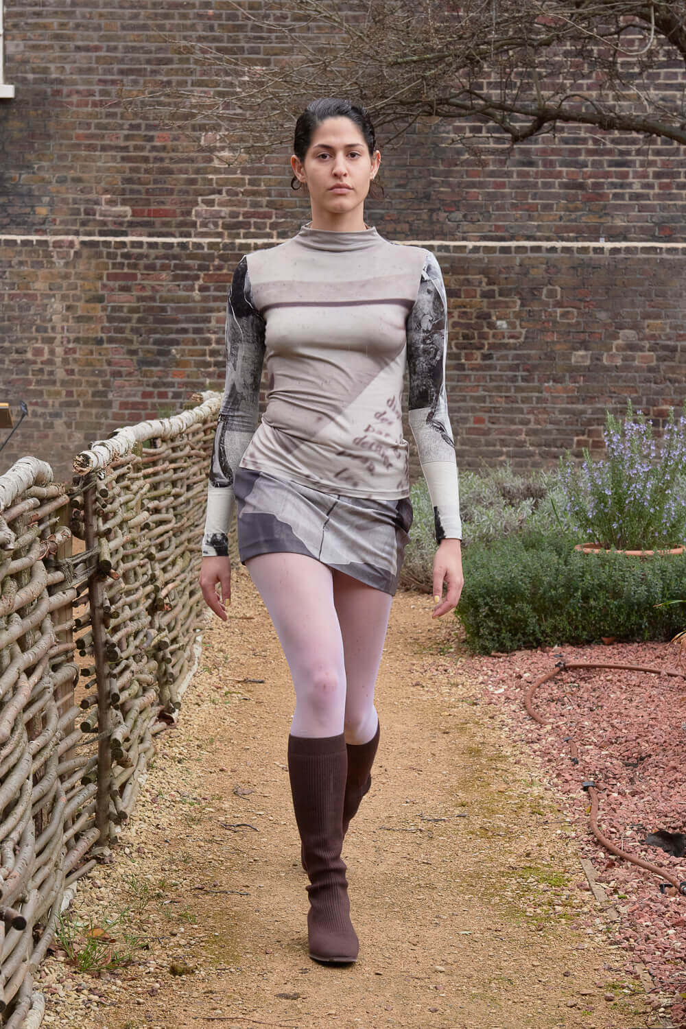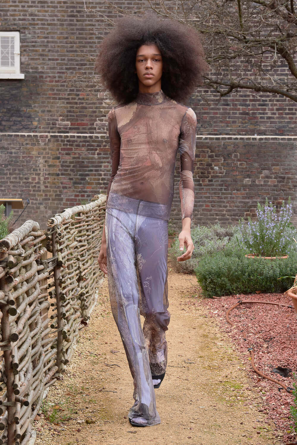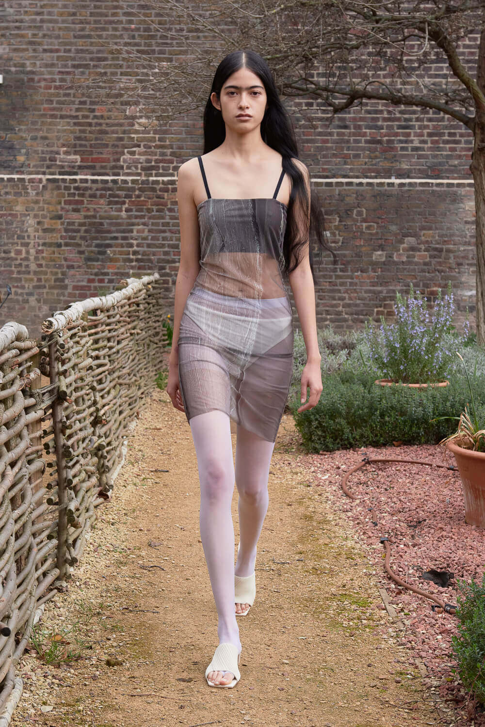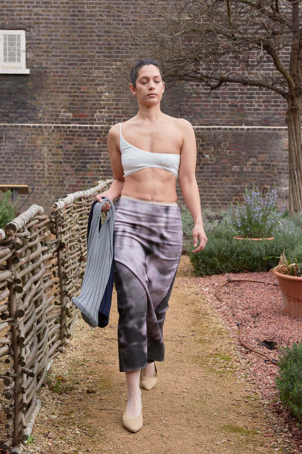 Wildflower marks a pivotal moment for eponymous London label Elliss, which unveiled its tranquil, plant-based AW23 assortment with its first ever runway show in East London last week. Elliss Solomon’s signature collagescape designs emerged on the diverse figures of the democratic cast, inspired this time around by both nature and the risqué. Vintage fetish editorial imagery mingled with sublime, blown-up rock formation prints, branches and leaves, on mesh midi dresses, denim mini skirts and plain bra tops. Elsewhere, new asymmetric knits paired with slinky skirts and novel knitted Elliss “Droplet” bags.