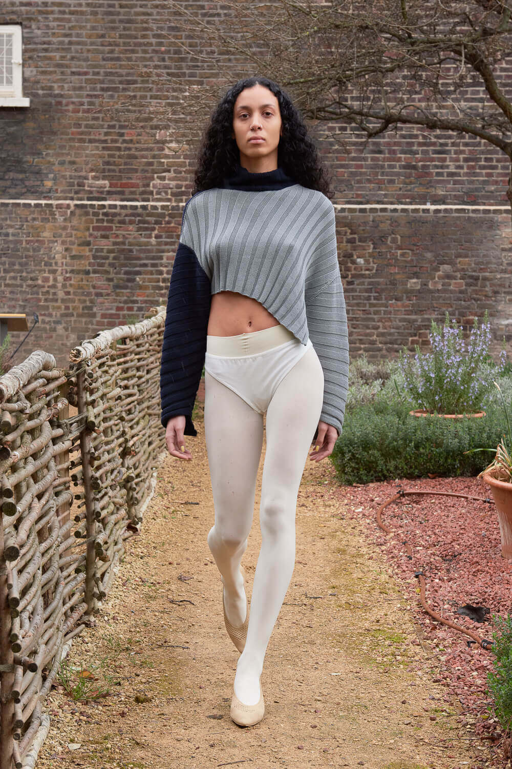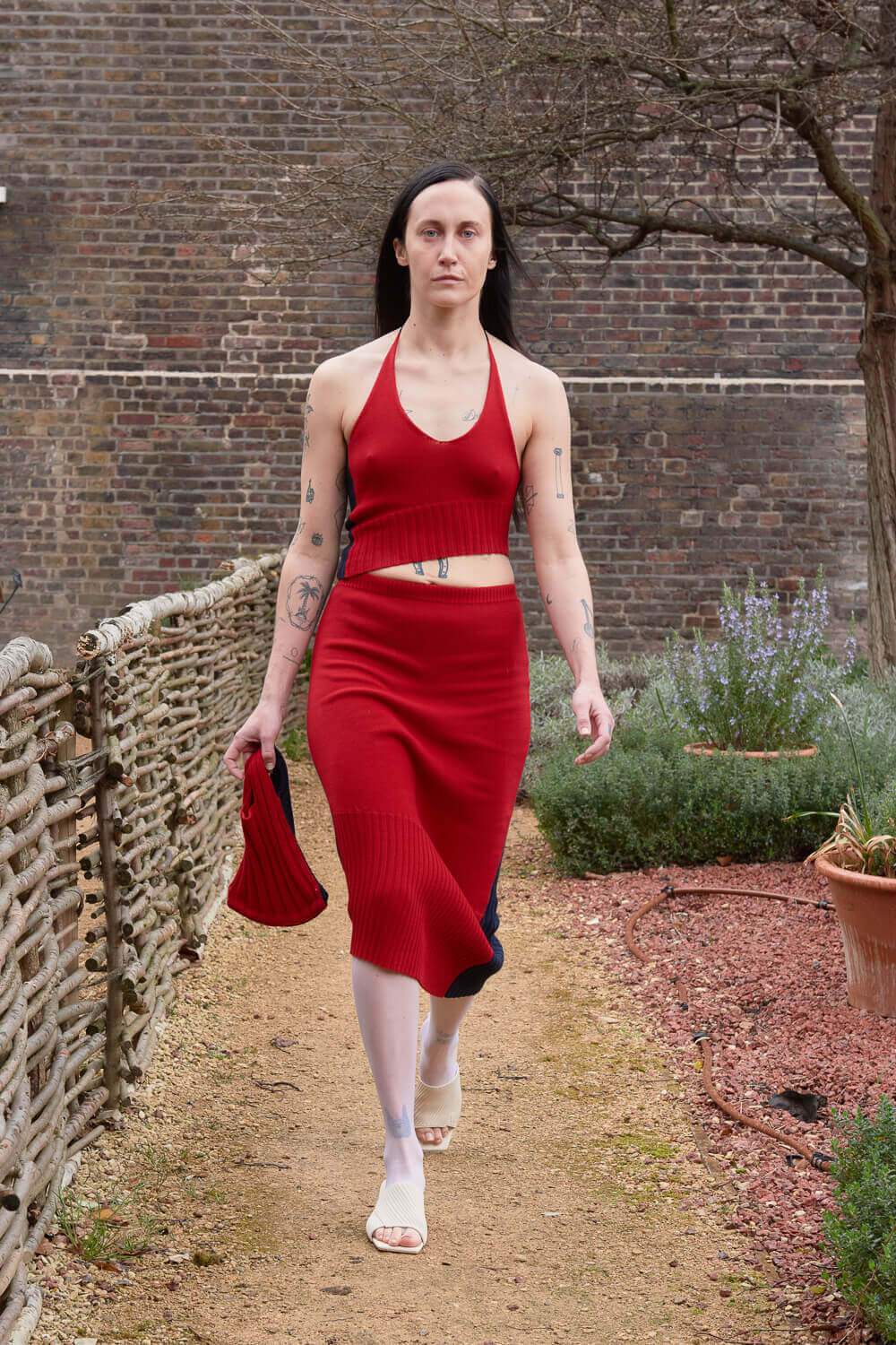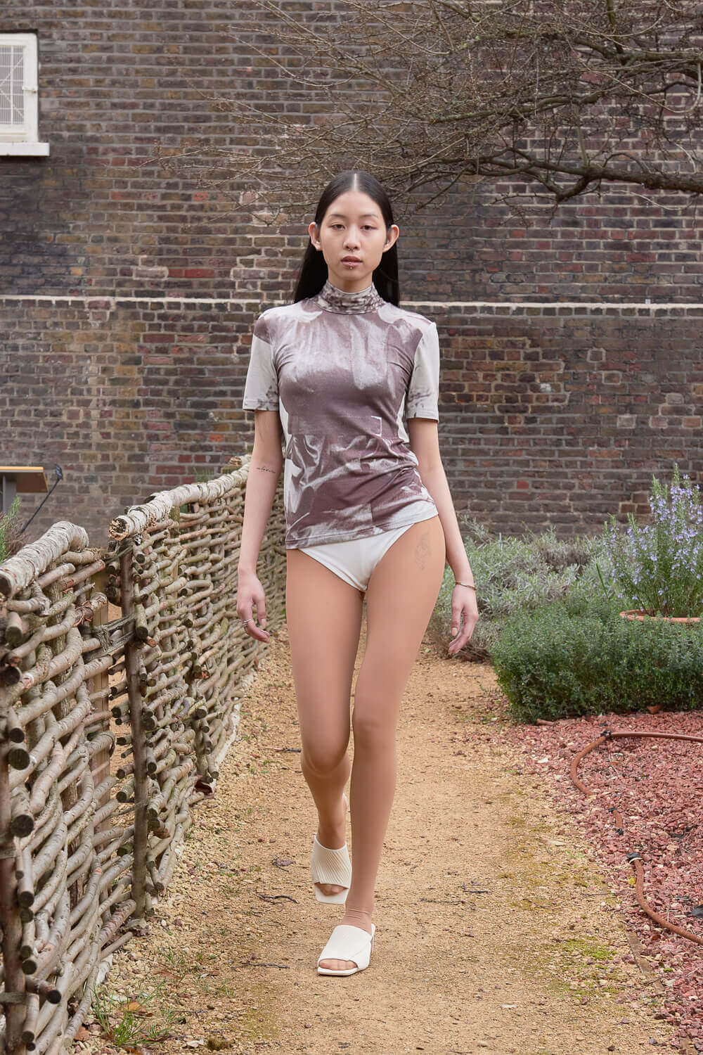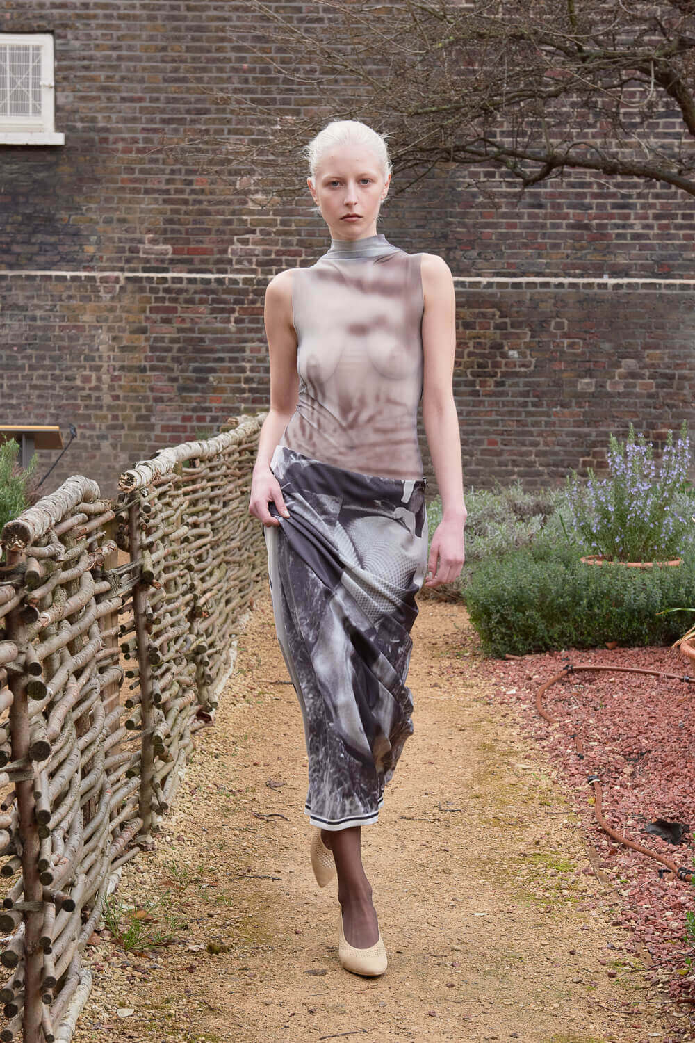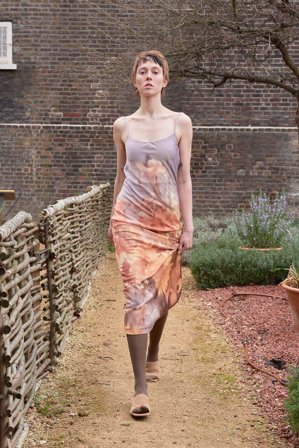 Wildflower marks a pivotal moment for eponymous London label Elliss, which unveiled its tranquil, plant-based AW23 assortment with its first ever runway show in East London last week. Elliss Solomon’s signature collagescape designs emerged on the diverse figures of the democratic cast, inspired this time around by both nature and the risqué. Vintage fetish editorial imagery mingled with sublime, blown-up rock formation prints, branches and leaves, on mesh midi dresses, denim mini skirts and plain bra tops. Elsewhere, new asymmetric knits paired with slinky skirts and novel knitted Elliss “Droplet” bags.