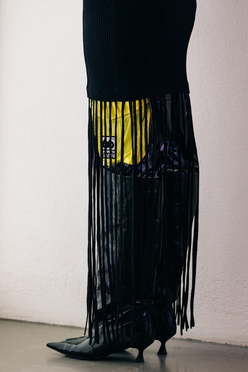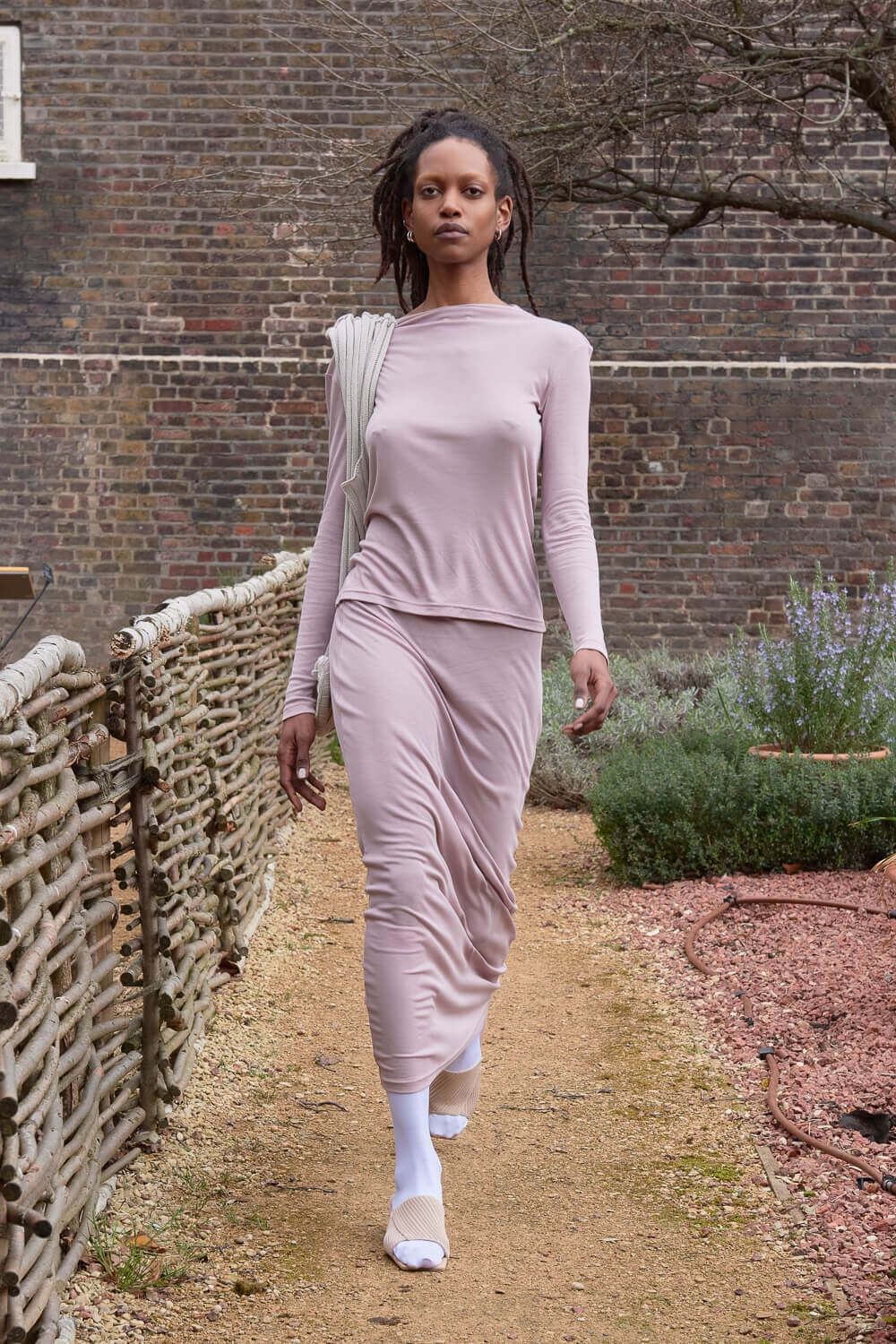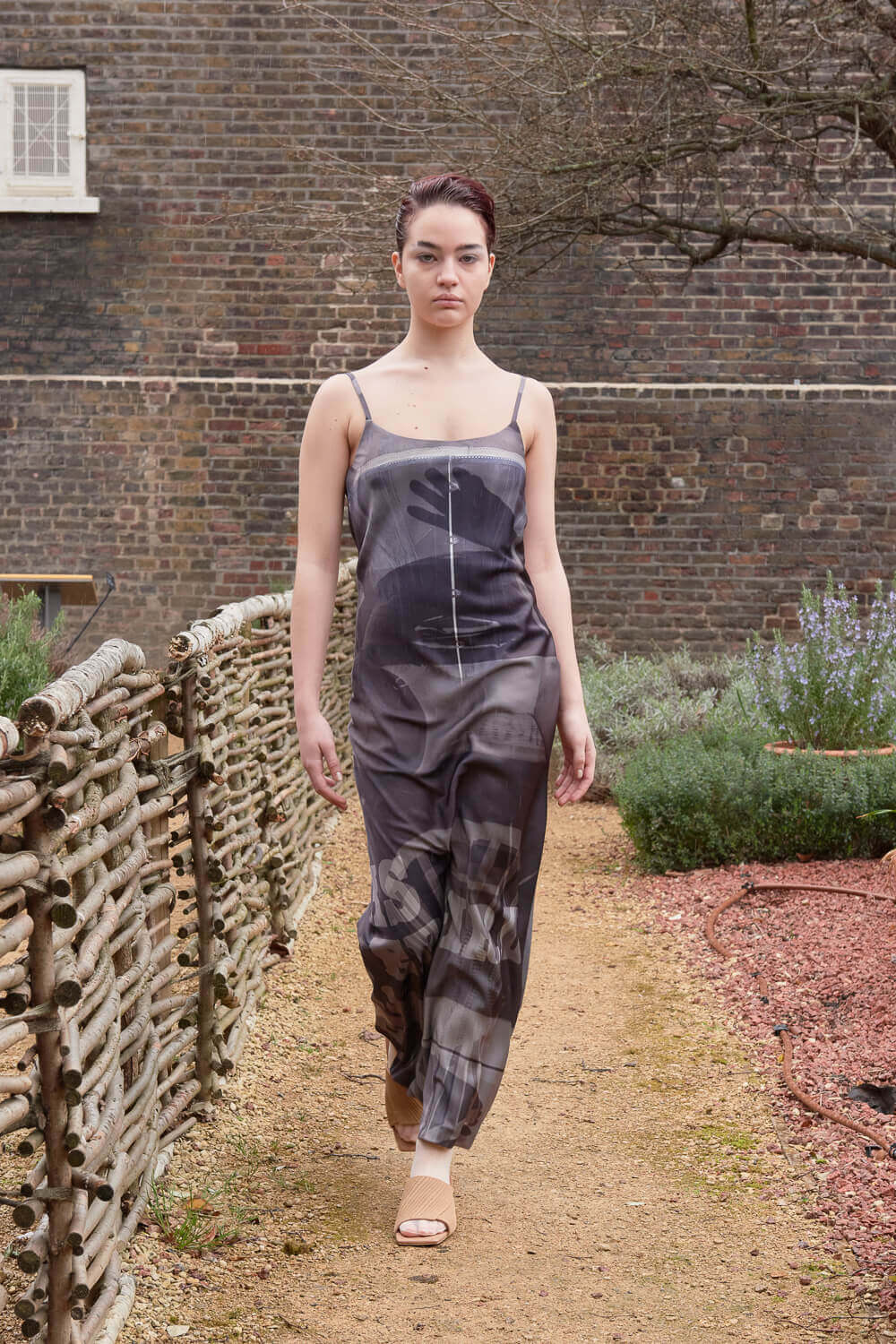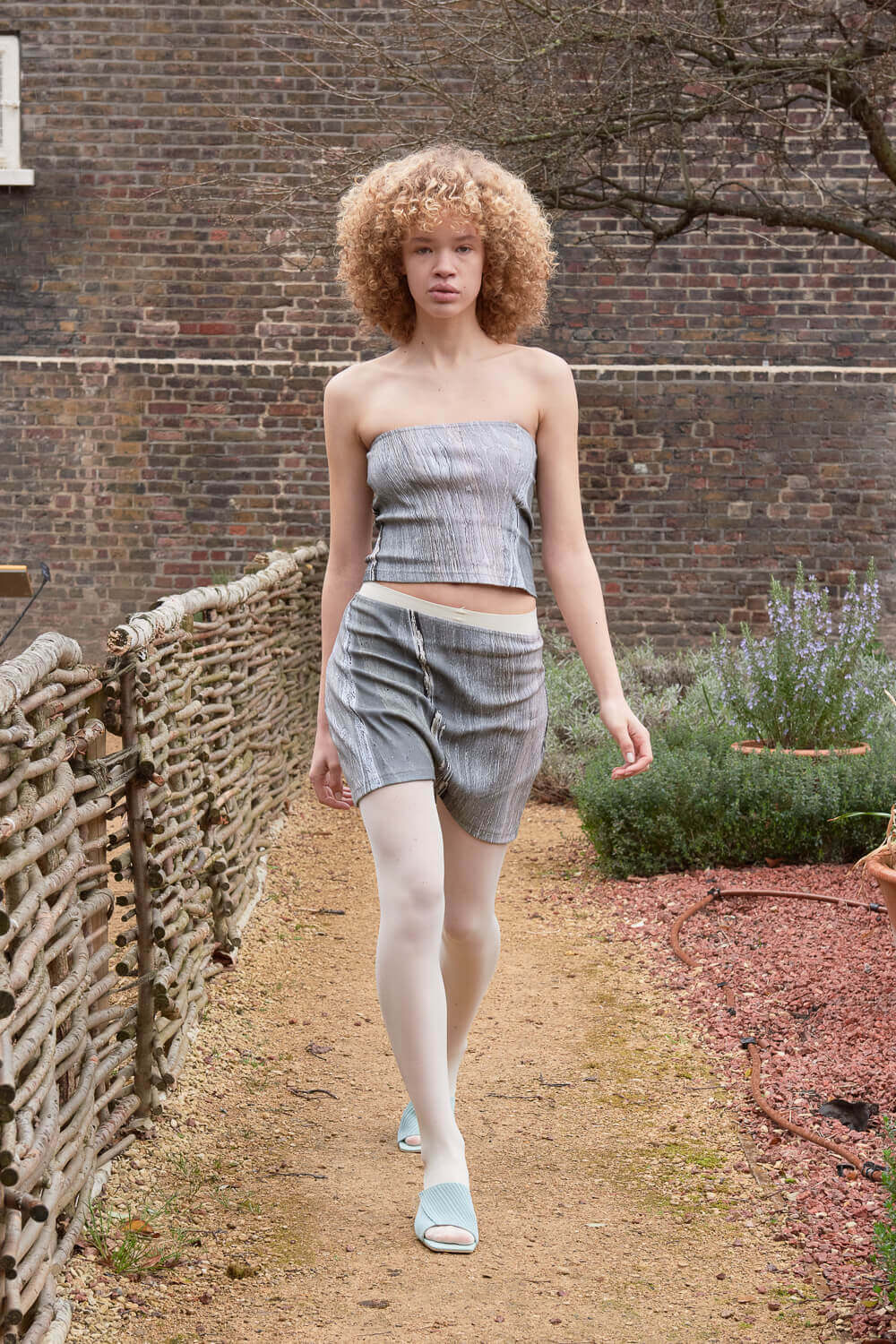 Wildflower marks a pivotal moment for eponymous London label Elliss, which unveiled its tranquil, plant-based AW23 assortment with its first ever runway show in East London last week. Elliss Solomon’s signature collagescape designs emerged on the diverse figures of the democratic cast, inspired this time around by both nature and the risqué. Vintage fetish editorial imagery mingled with sublime, blown-up rock formation prints, branches and leaves, on mesh midi dresses, denim mini skirts and plain bra tops. Elsewhere, new asymmetric knits paired with slinky skirts and novel knitted Elliss “Droplet” bags.