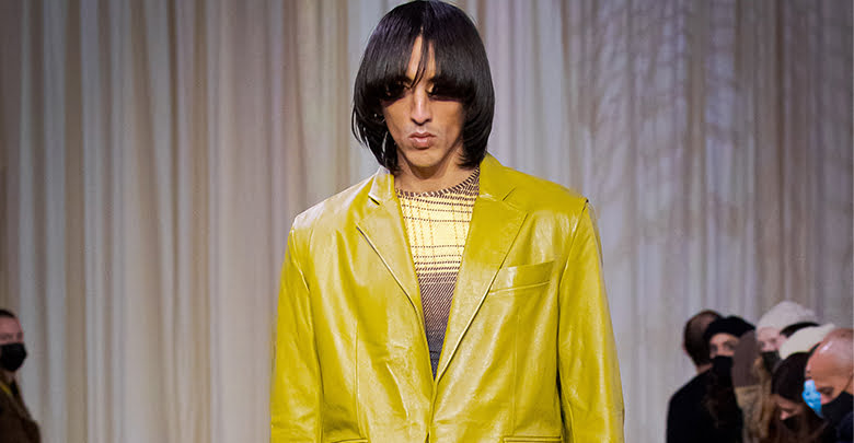 Louche suiting fashioned from citrus yellow leather sat alongside swollen trousers and puffers that are held in place as if caught in motion. For Saunders, the truth is in the details, and notched necklines, warped 3D checkered prints and her now-signature, accentuated shoulder represent years cutting finesse. “I want the collection to be timeless,” the designer said, carving a handsome uniform for the everyday bloke. “It could be now, it could be the past, it could be the future. It’s not just about one person – I want everyone to see a part of themselves in it.”