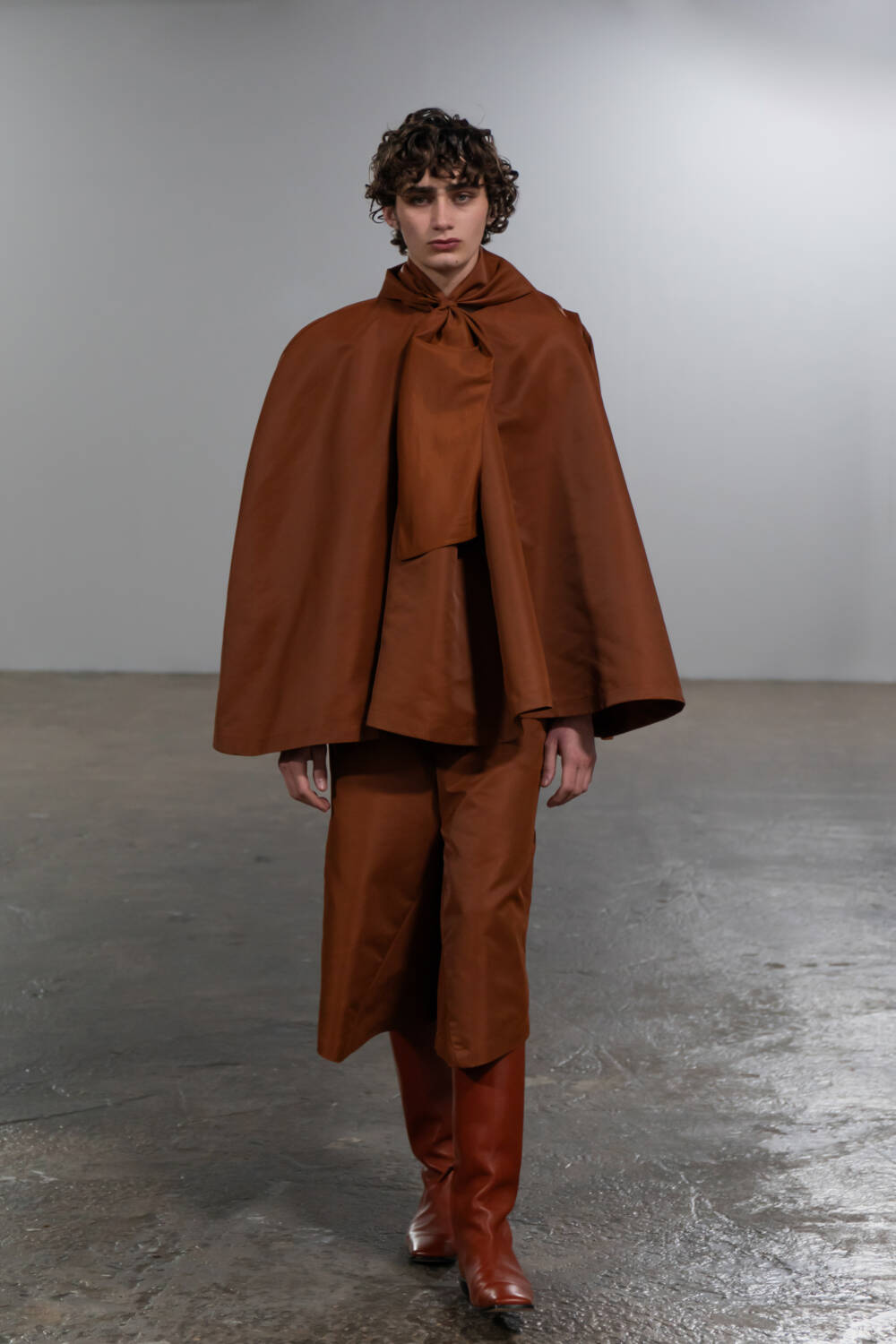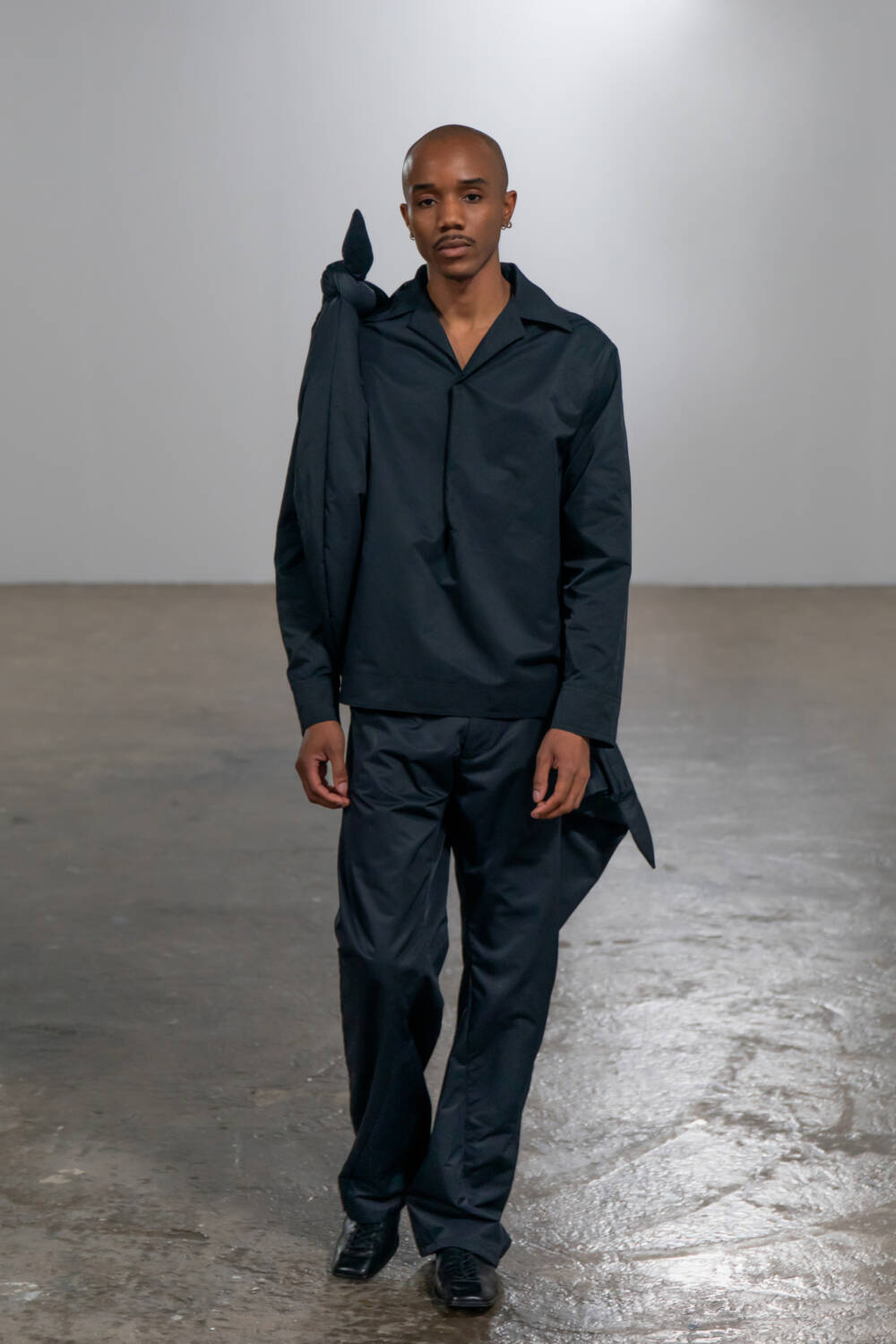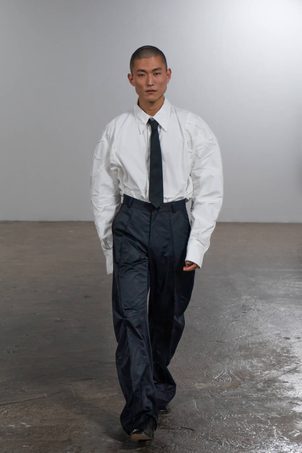 Saunders’s partnership with multidisciplinary artist, Shanti Bell, this season, added another layer of subversion to this collection. Her immersive set design further underscored themes of movement and non-conformity, with weighted materials and sculptural elements tethered to the models, creating a striking interplay between their bodies, the clothing and the space. Twisted inseams and bonded fabrics in the collection evoked a sense of deliberate deconstruction, also echoing the influence of late modernist artist Steven Parrino.