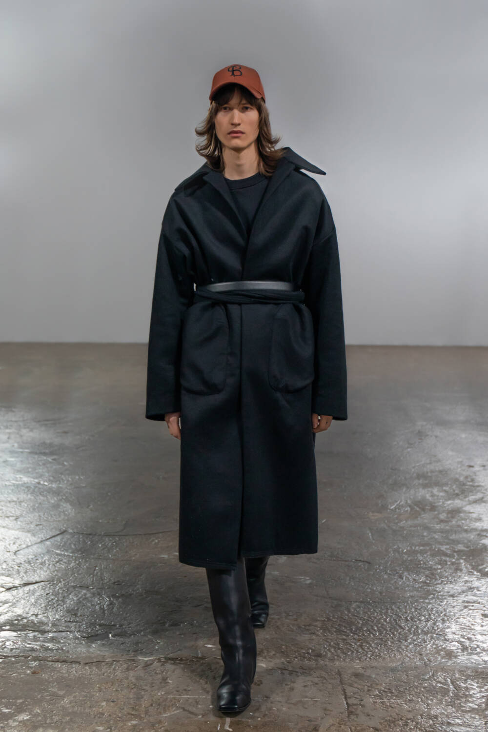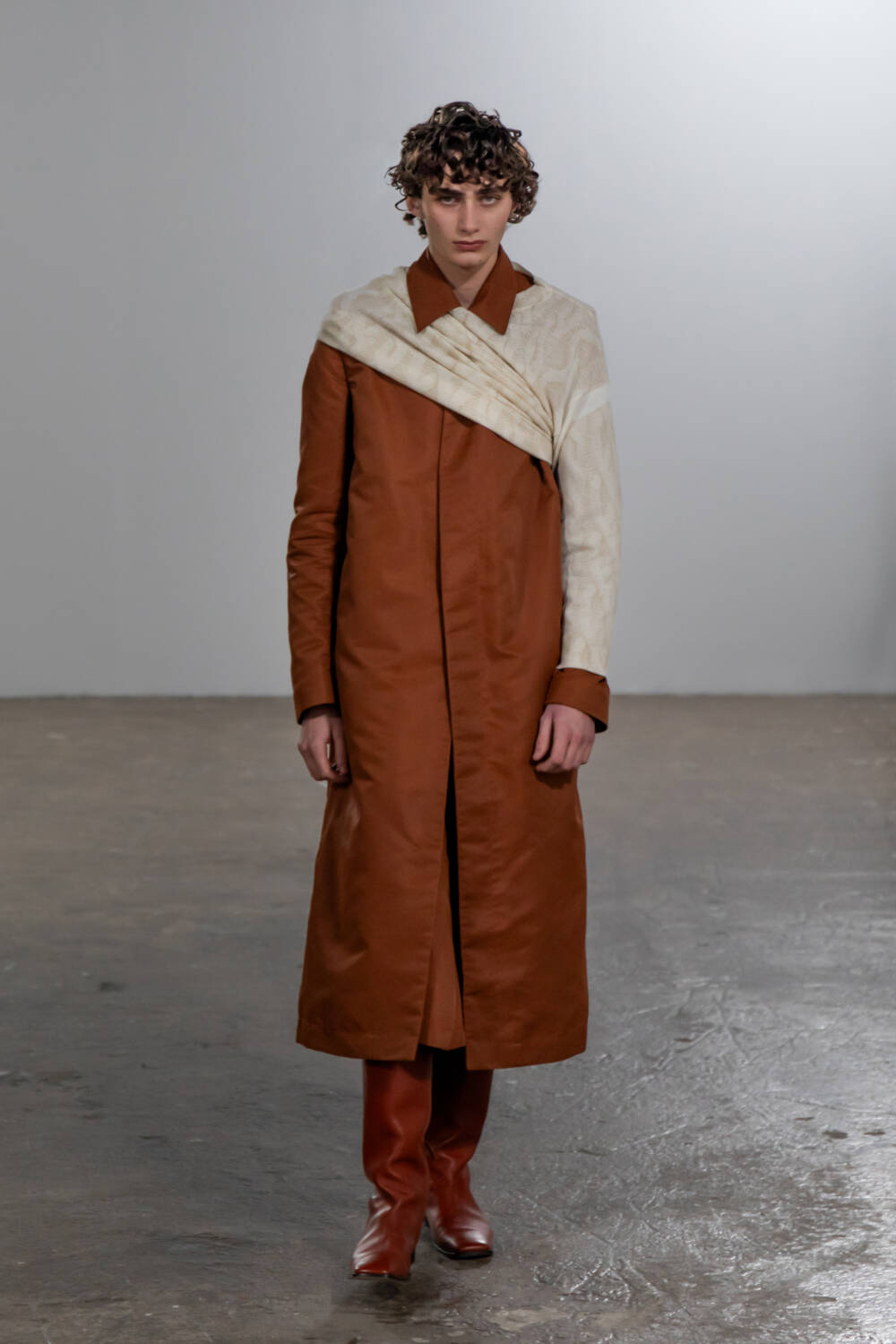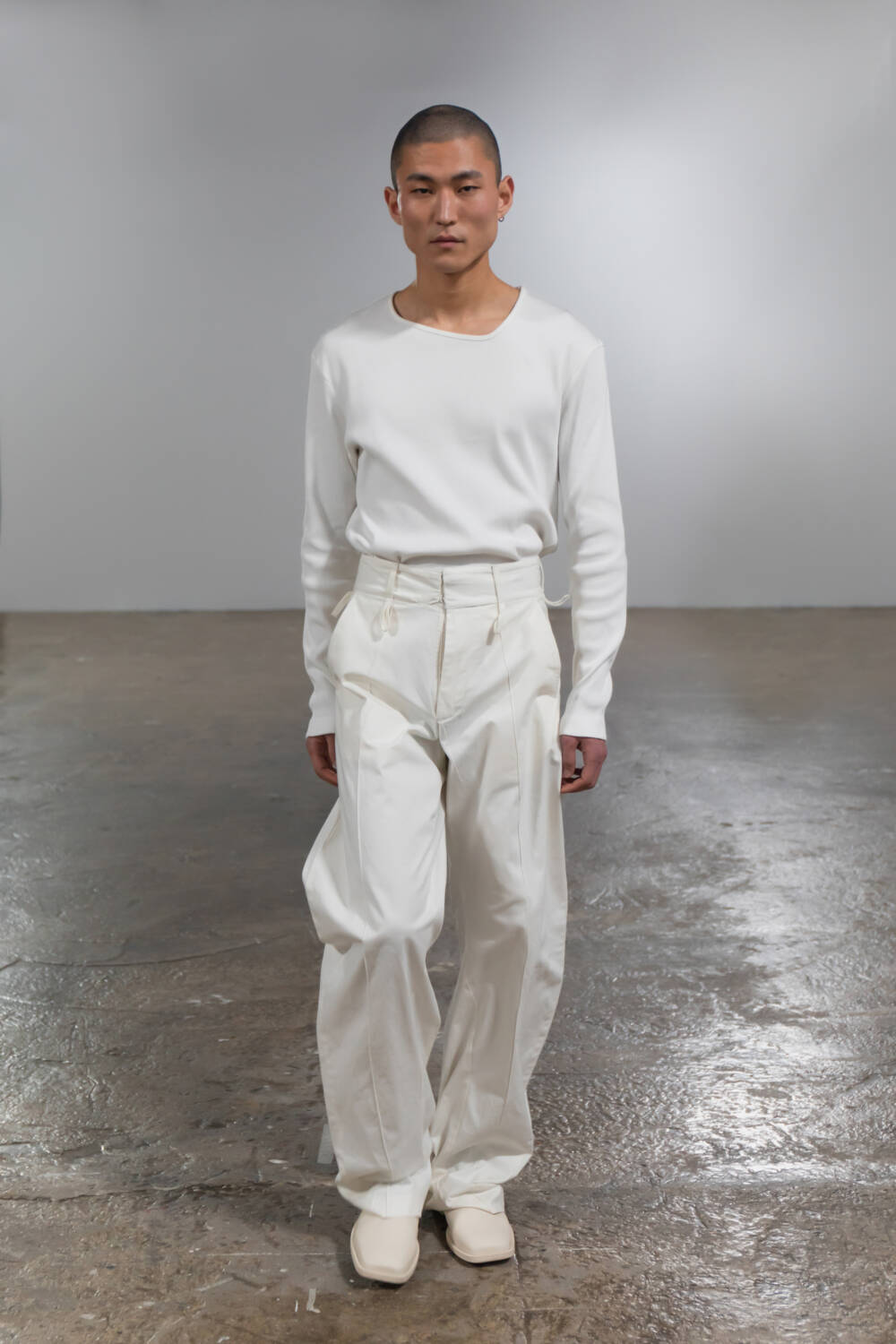 Saunders’s partnership with multidisciplinary artist, Shanti Bell, this season, added another layer of subversion to this collection. Her immersive set design further underscored themes of movement and non-conformity, with weighted materials and sculptural elements tethered to the models, creating a striking interplay between their bodies, the clothing and the space. Twisted inseams and bonded fabrics in the collection evoked a sense of deliberate deconstruction, also echoing the influence of late modernist artist Steven Parrino.