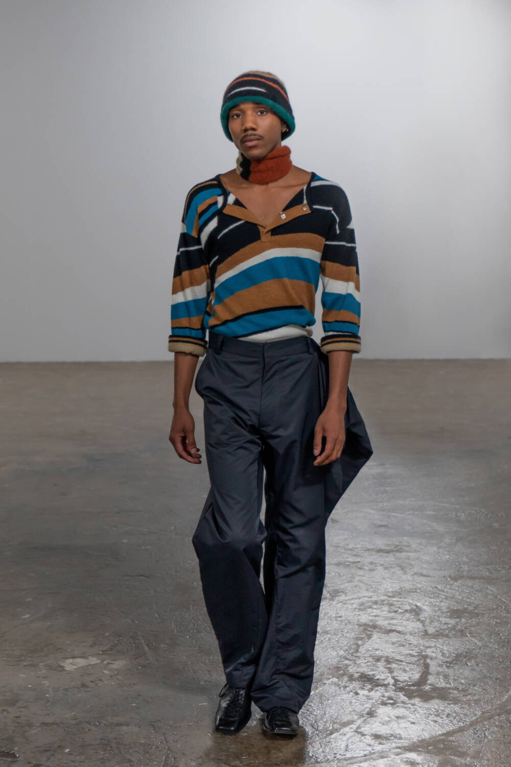 Dichotomy celebrated duality in every respect. Soft alpaca knits were juxtaposed with water-repellent nylons and crushed textures, while bold accessories, including padded knot bags and square-toe pastel shoes, were paired with classic tailoring, adding a functional flair to more traditional looks.