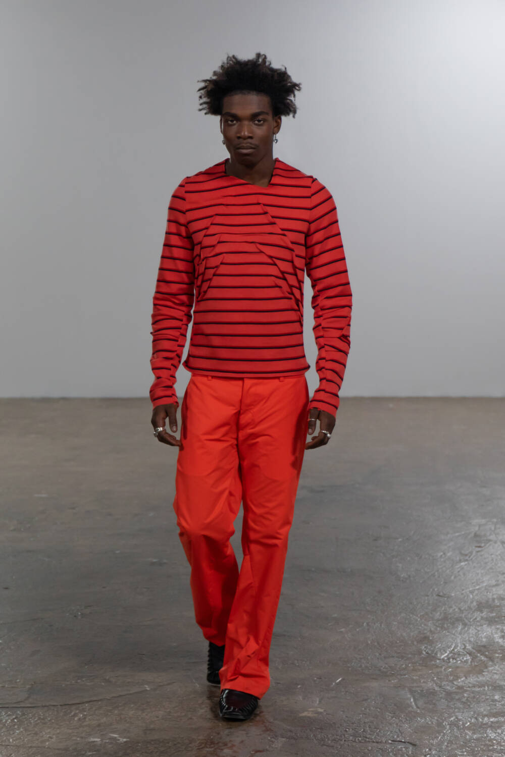 The reimagining of Saunders’s signature silhouettes in this collection again showed an attempt to push boundaries. Her oversized, bow-legged Manner trousers and Y-neck long-sleeve shirts appeared in bold pinks and dynamic, geometric patterns. It provided profound evidence for the innovative and creative capacity of menswear when a designer dares to go beyond its limitations.