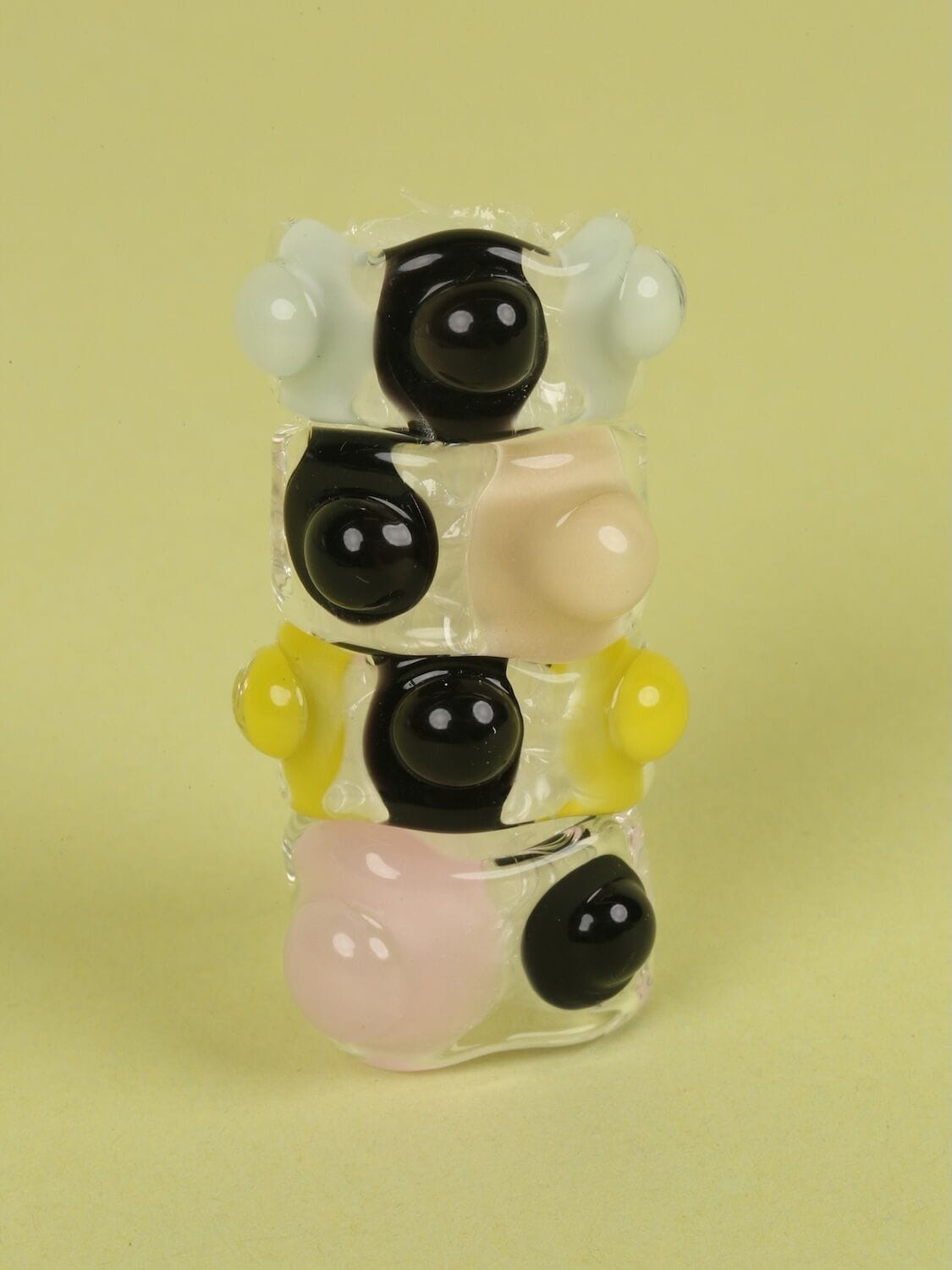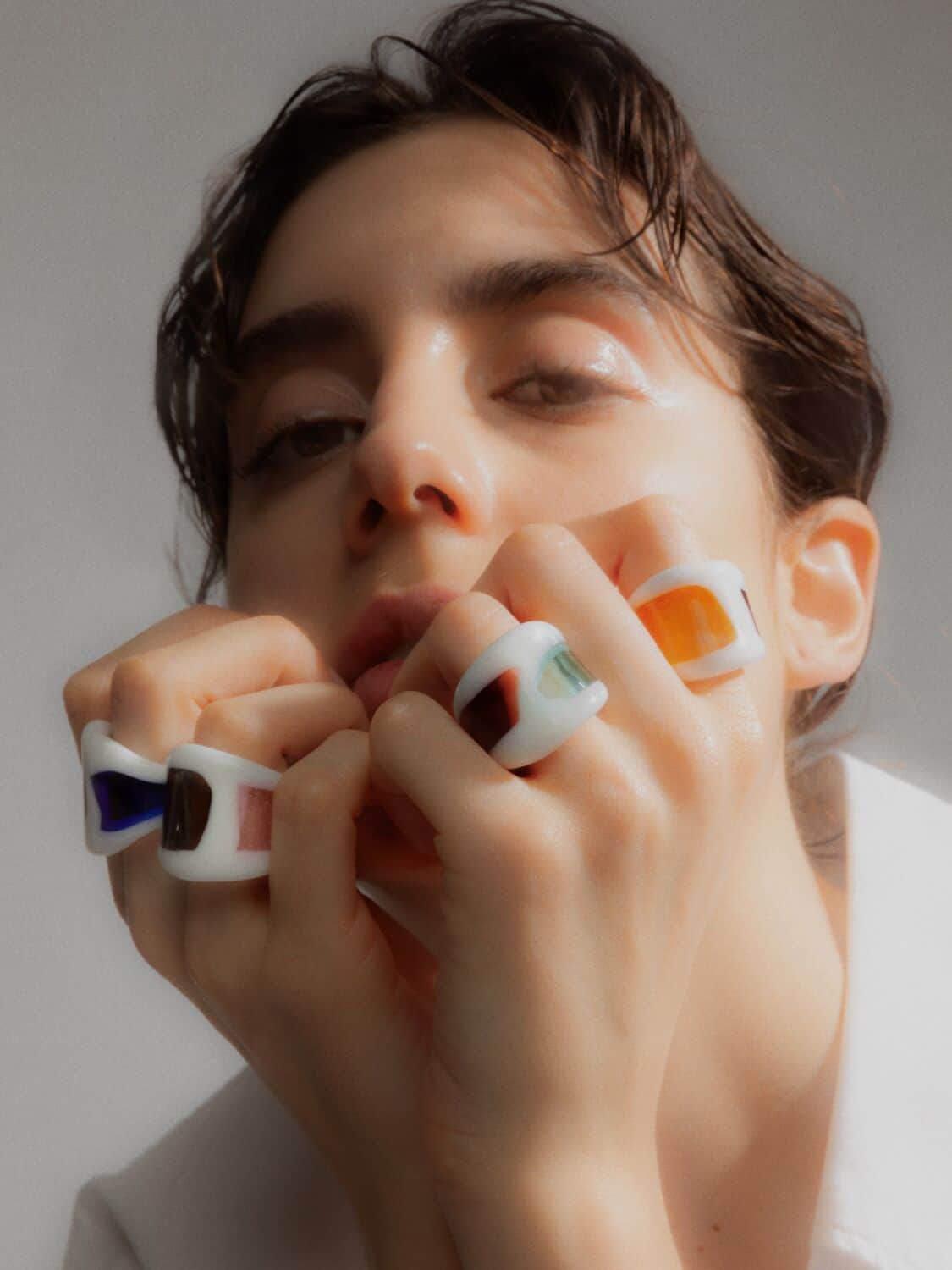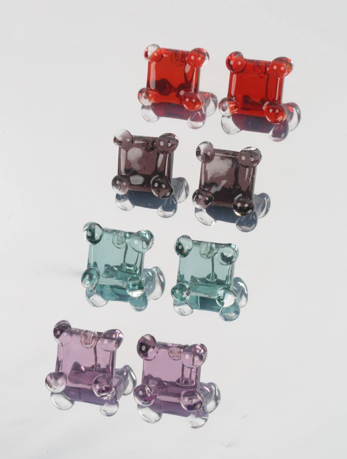 Each made-to-order piece, crafted in Keane’s Brooklyn studio, is made from borosilicate glass on a bench torch using a technique called lamp working. What this entails is solid rods or tubes of material that are then manipulated into spherical or twisted forms, resulting in the illusion of liquid frozen in time. Adding colour with what Keane Lynch calls a “flame-activated brush” – a method of fusing pigments directly into the molten glass – brings dimension and depth to every curve and contour. From idea to completed piece, the jeweller guides every step with near-meditative precision.