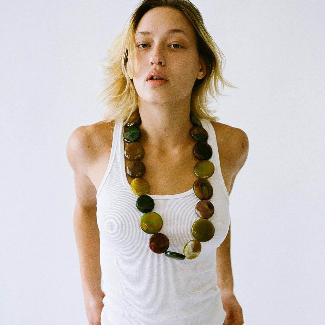 Perhaps the innately ornate feel of Vertigo is reflective of Sade not actually stringing beads together until 2021, meaning her skill for the art blossomed naturally whilst practicing on her bed. It’s clear the brand is rooted in a homegrown independent ethos, you only need to glance at the novelty in shape, texture and pattern across the many designs to see this. Sade, who’s just 24, not only strings precious stones together, but has strung herself an entire brand that’s beginning to boil over with support from celebrities like Emily Ratajkowski and Suki Waterhouse who are popularising the Vertigo look.