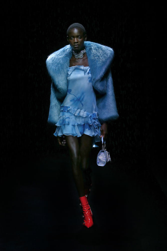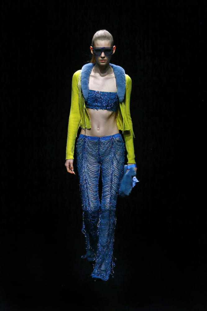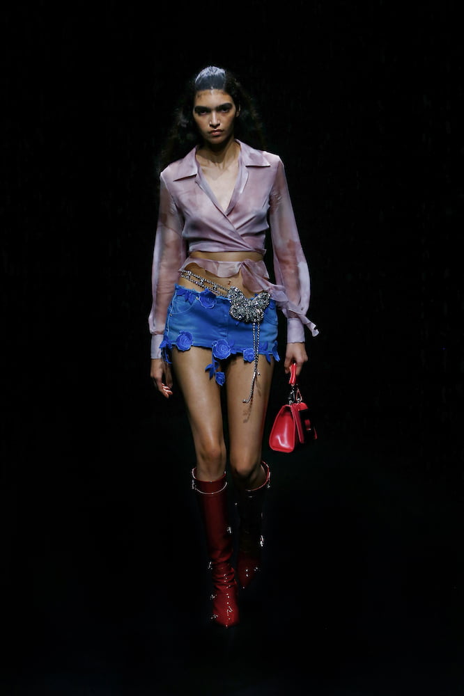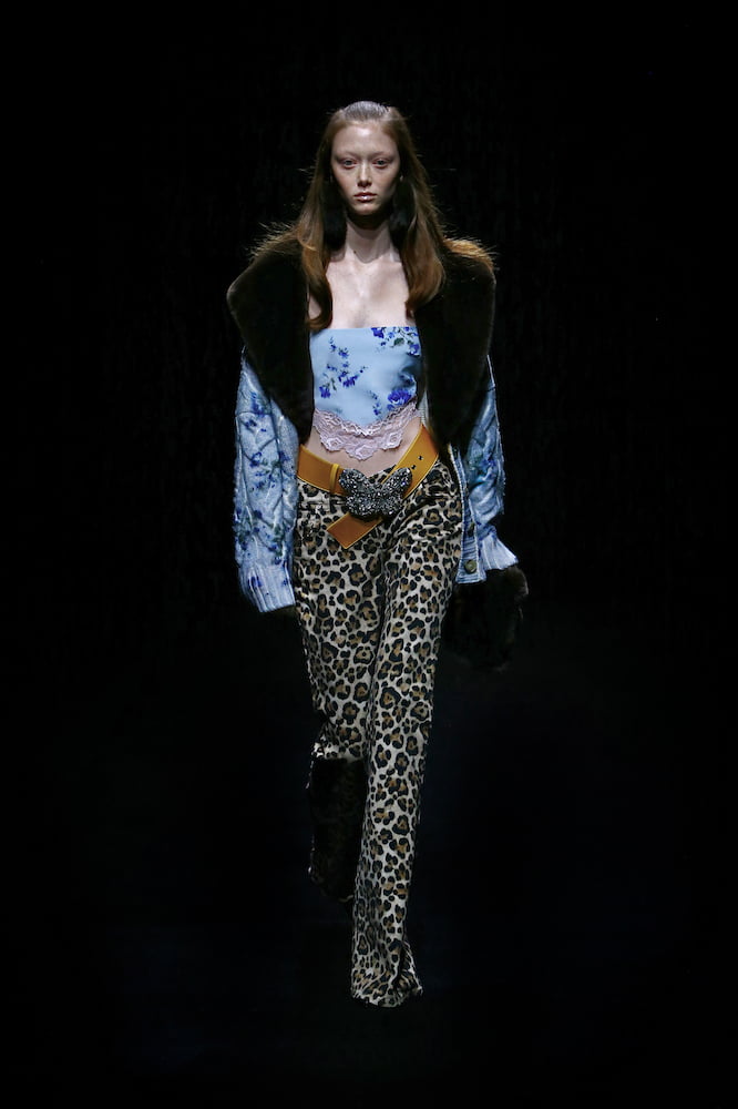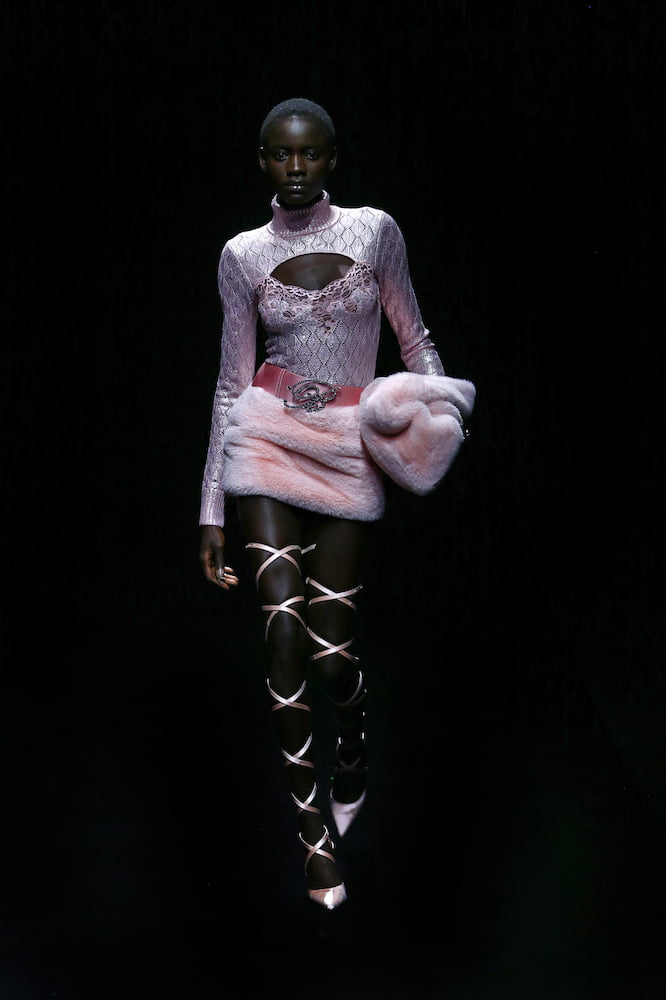 Showcased in a catwalk-cum-teen bedroom – art directed by Harley Weir – the brand’s signature faux fur-trimmed cardies come both cropped and fuzzy, and in knee-length, hand-knitted variations. They’re worn over low-slung bellbottoms with glistening butterfly belt buckles and barely-there miniskirts adorned with roses. “These are all reinterpretations of Blumarine codes, just now for a new generation,” adds Brognano, who says thigh-hugging satin heels, belly-baring blouses and belted tulle dresses with serious flounce is the sort young-minded clobber the Blumarine girl wants to head back to the club in. With a Vodka-Red Bull in hand, she’ll be the dancefloor darlin’ everyone wants to know the name of.
