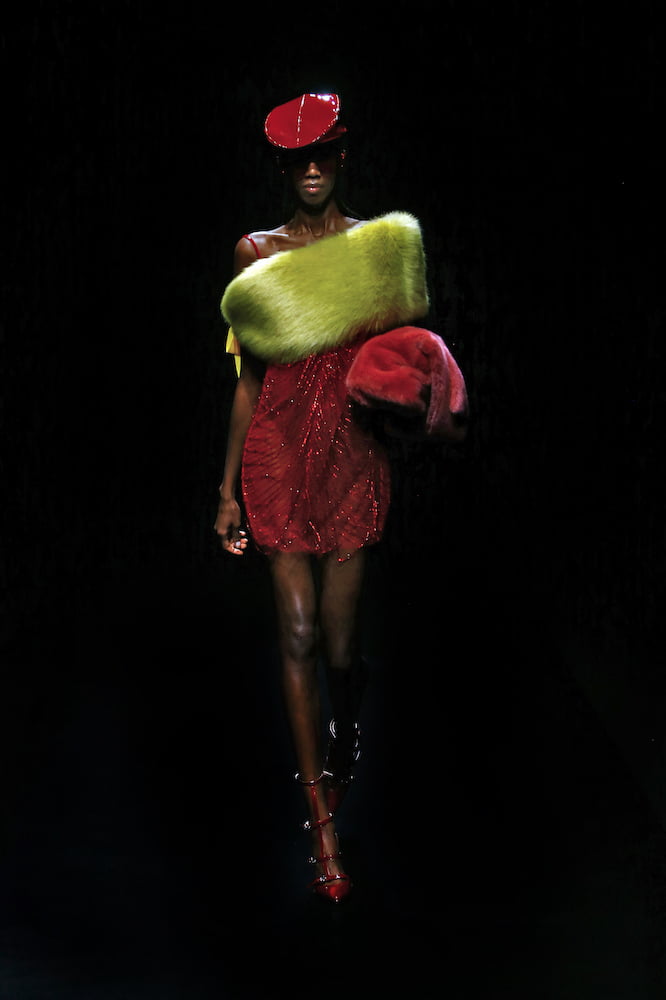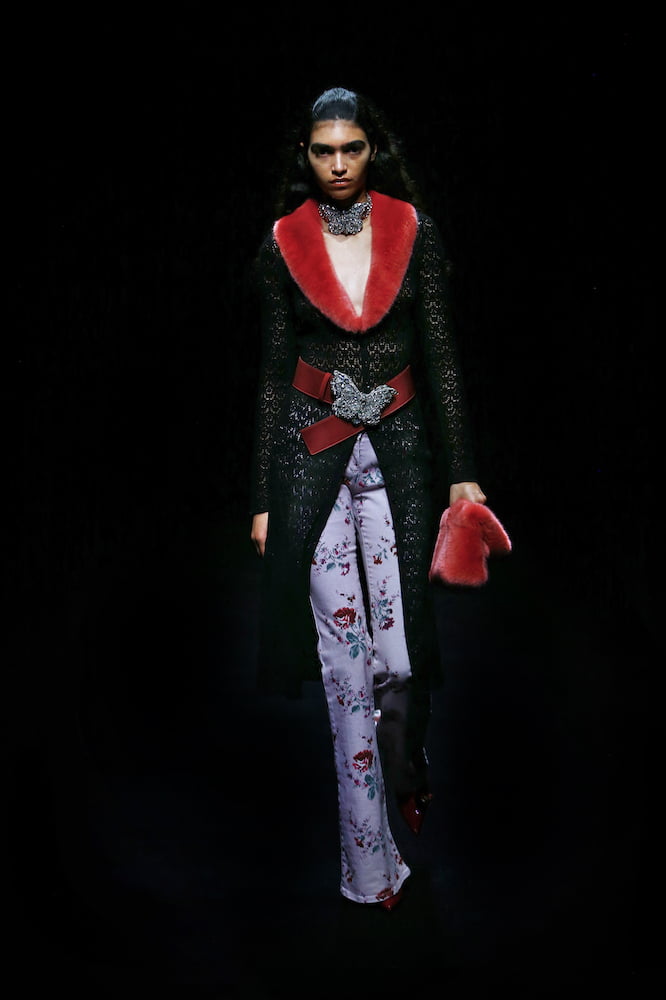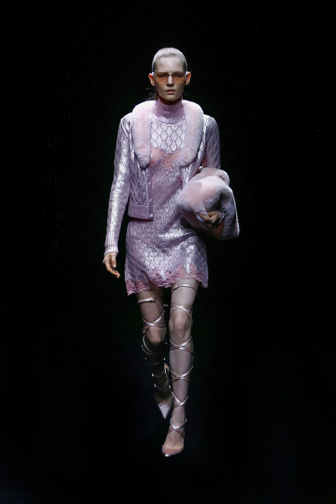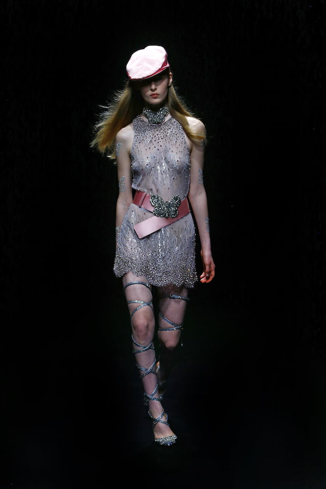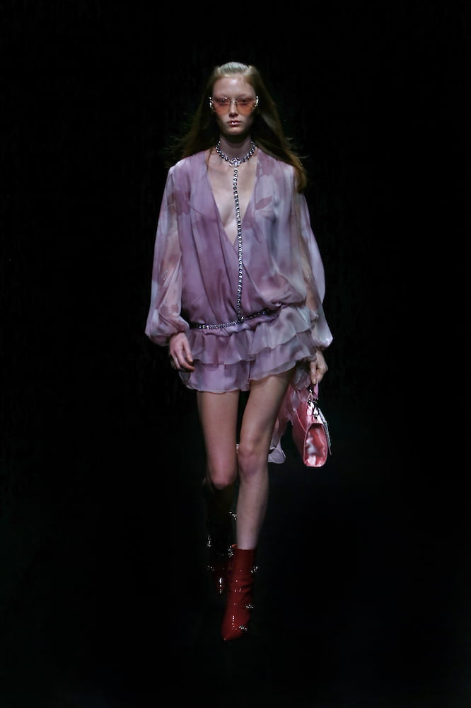 Showcased in a catwalk-cum-teen bedroom – art directed by Harley Weir – the brand’s signature faux fur-trimmed cardies come both cropped and fuzzy, and in knee-length, hand-knitted variations. They’re worn over low-slung bellbottoms with glistening butterfly belt buckles and barely-there miniskirts adorned with roses. “These are all reinterpretations of Blumarine codes, just now for a new generation,” adds Brognano, who says thigh-hugging satin heels, belly-baring blouses and belted tulle dresses with serious flounce is the sort young-minded clobber the Blumarine girl wants to head back to the club in. With a Vodka-Red Bull in hand, she’ll be the dancefloor darlin’ everyone wants to know the name of.