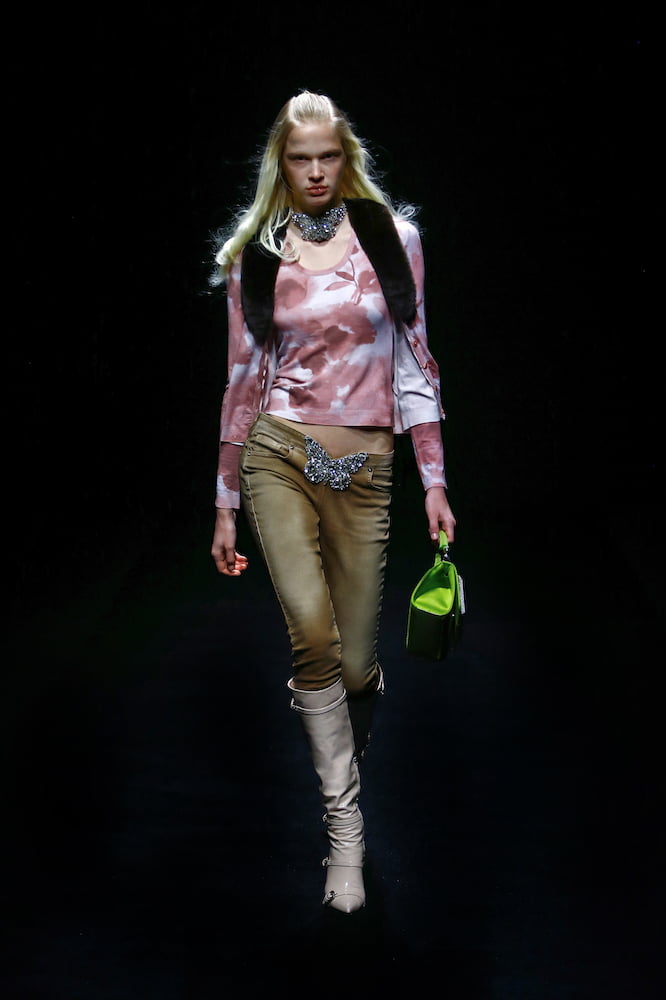 It seems Blumarine’s Nicola Brognano has dug out his Motorola Razr and dialled up the 2000s. Marking his second ready-to-wear collection for the house, the handsome designer looked to the ’00s heydays of Paris Hilton and Britney Spears to guide his sexy, sassy, Y2K vision.