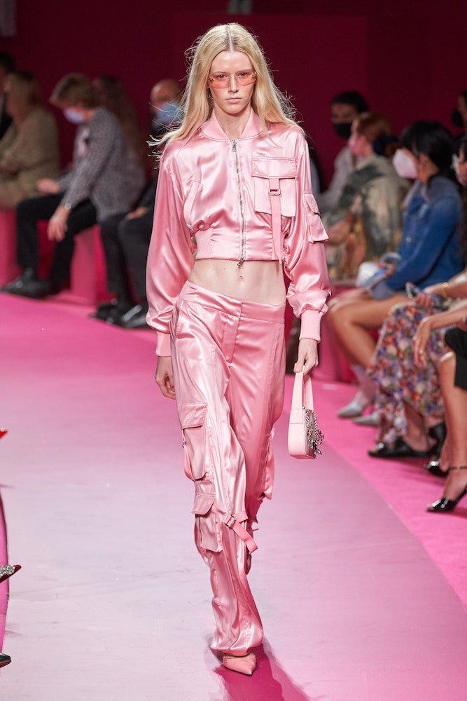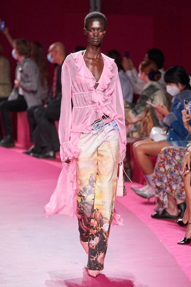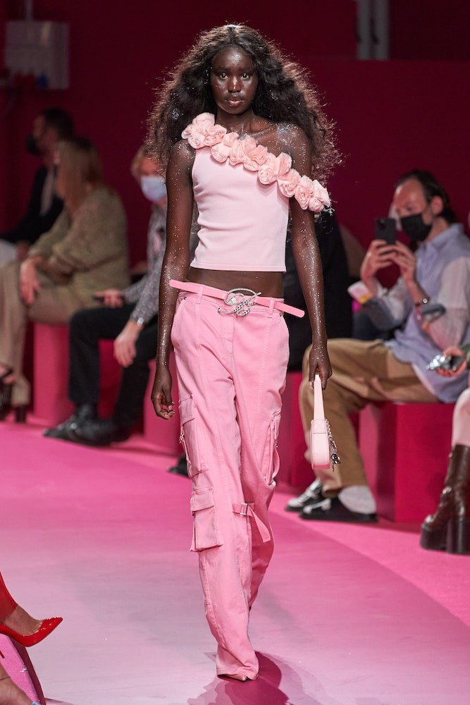 There was plenty of all that, and then some, as the designer sent out glitter-doused models in barely-there daisy dukes, frilly frocks and liquid satin cargo tracksuits. Trompe-l’œil, patchworked denim harked back to that Britney and J-T red carpet moment and sequined fringed twinsets, glossed with tropical florals, are bound to be the brand’s next big hits. Forget the Y2K Bug, the excitement behind Blumarine is infectious.