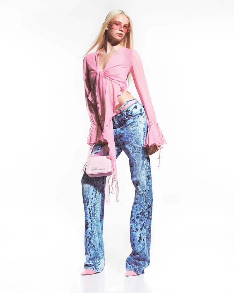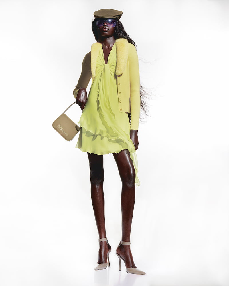 Short, sexy, girly. That’s how Nicola Brognano describes his latest Blumarine collection, which sees the designer continue his revival of all things noughties. It’s safe to say Brognano has officially caught the Y2K bug, channeling the sexy glamour of 2000s pop stars into whispy chiffon wrap dresses, mischievous fake furs, and MTV-worthy satin combat trousers in sugary shades of pink.