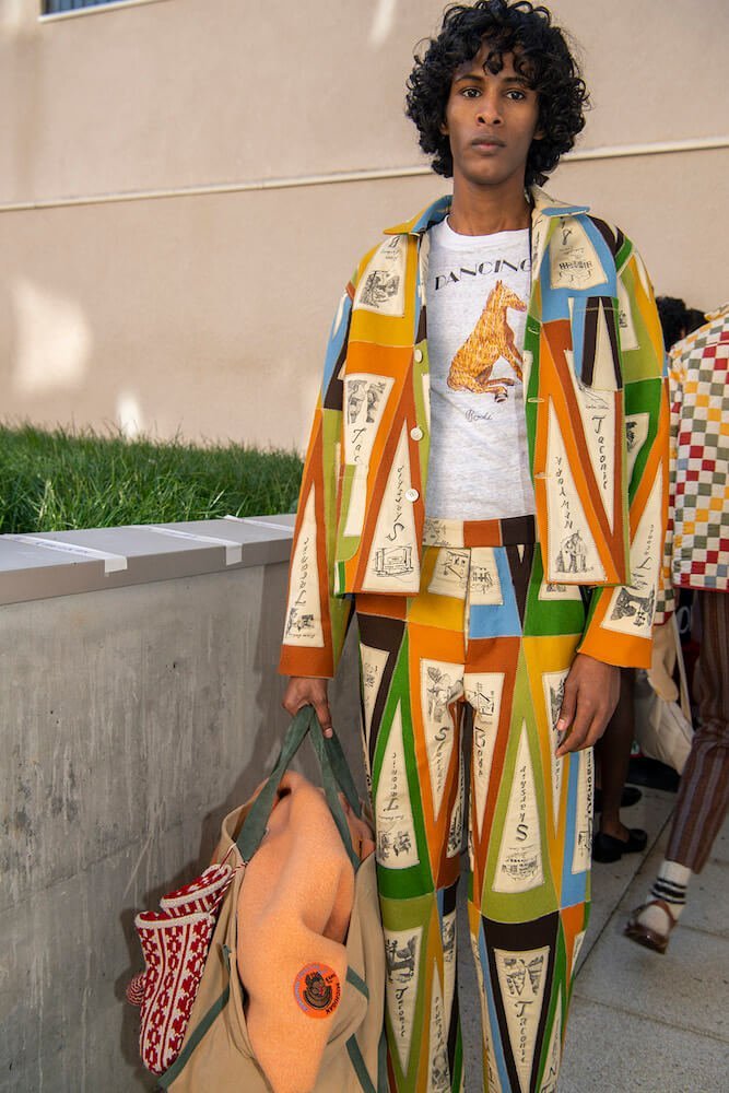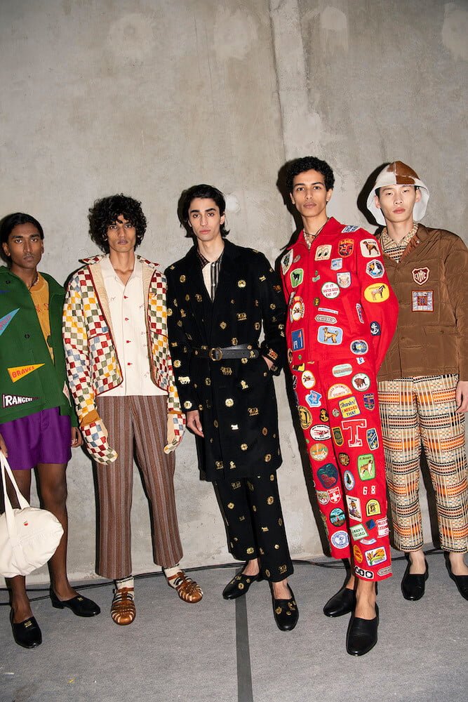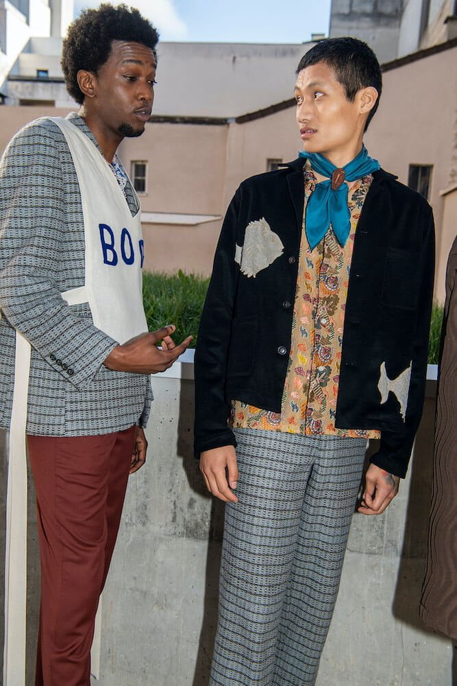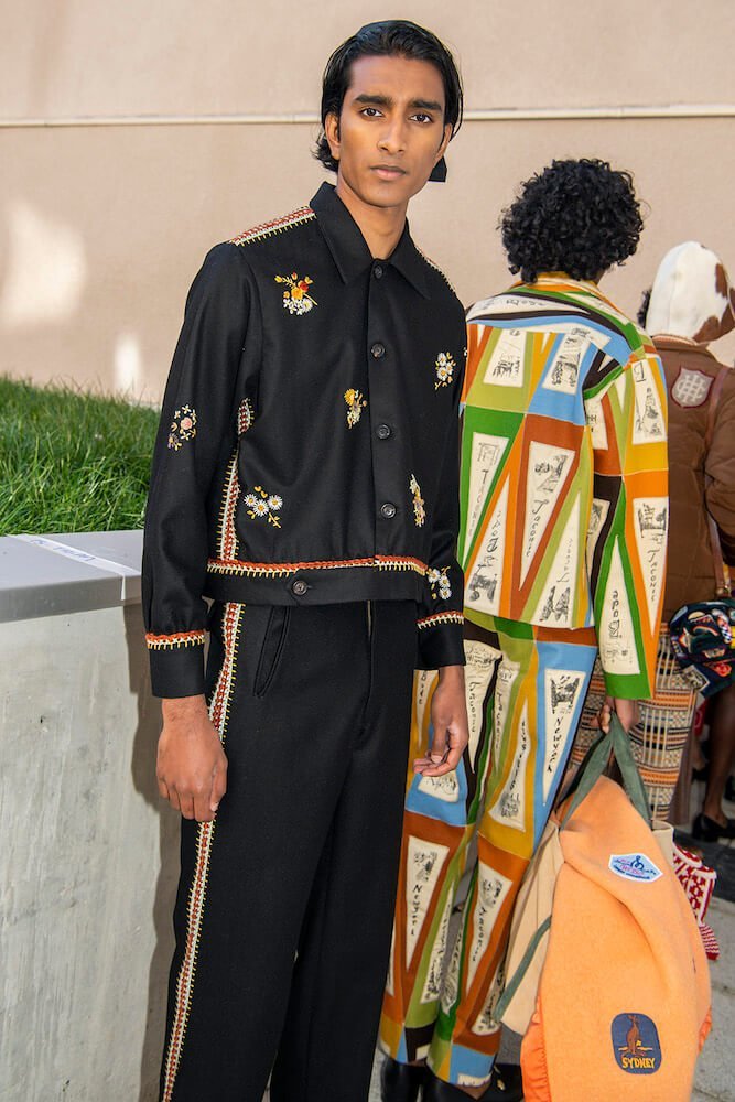 In the show notes, Bode narrated the exciting life Bloomstein experienced – from attending a small alternative school located in an old Shaker Village through writing poetry about dogs and growing up at a Waldorf school and biodynamic farm in upstate New York. And that’s all before he hit his teens. But even if you didn’t know all this information, you could trace the references Bode used to a boyish sensibility thanks to its fine use of details. Flags turned into full twinsets, colourful marbles came clustered as necklaces and fish transformed into holdalls. As part of her effort to win in the 2020 Woolmark Prize finals which are taking place in February, the American designer presented  art-deco-inspired hand-beaded bowling shirts and coats crafted from hundreds of individually crocheted merino wool fleurettes. And something new for all us superfans too – the Bode House Shoe marked the brand’s footwear debut. Inspired by the comfort of domestic interiors, they are part of a partnership with Plasticana, a 100% recyclable hemp-based shoe producer from France.