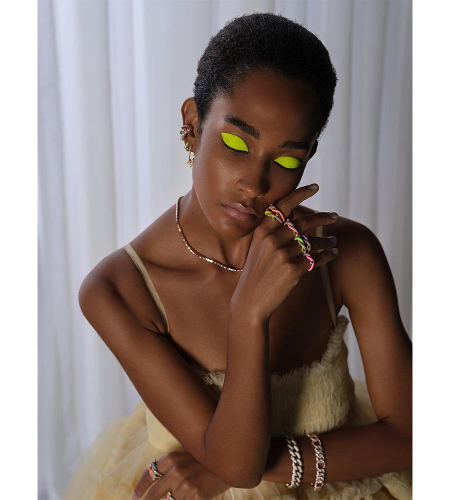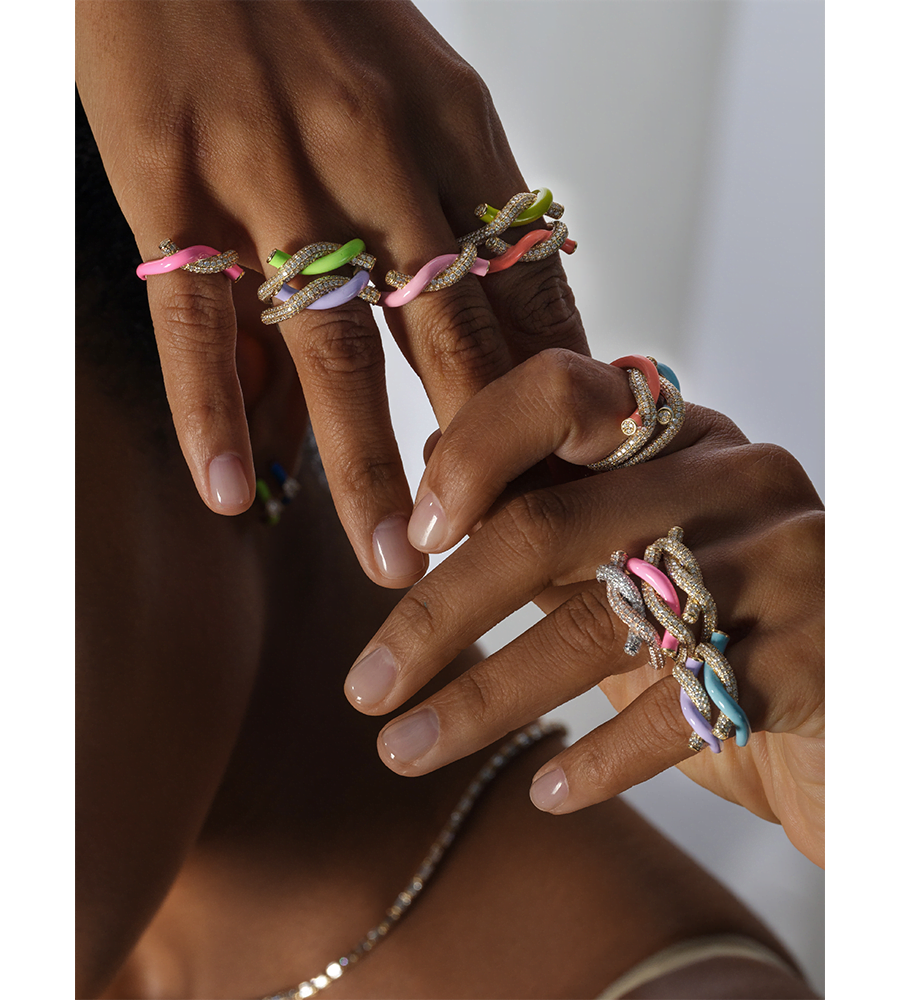 The brand’s joyous jewellery is meant to compliment your mood, and although it’s fine jewellery, Zeman says these pieces are perfect for the everyday. “Boochier is about living in the moment and enjoying what you have when you have it,” she says. “We love the unexpectedness of mixing diamonds with bright colours. We believe that everyone has a playful side in them and we strive to awaken it.”