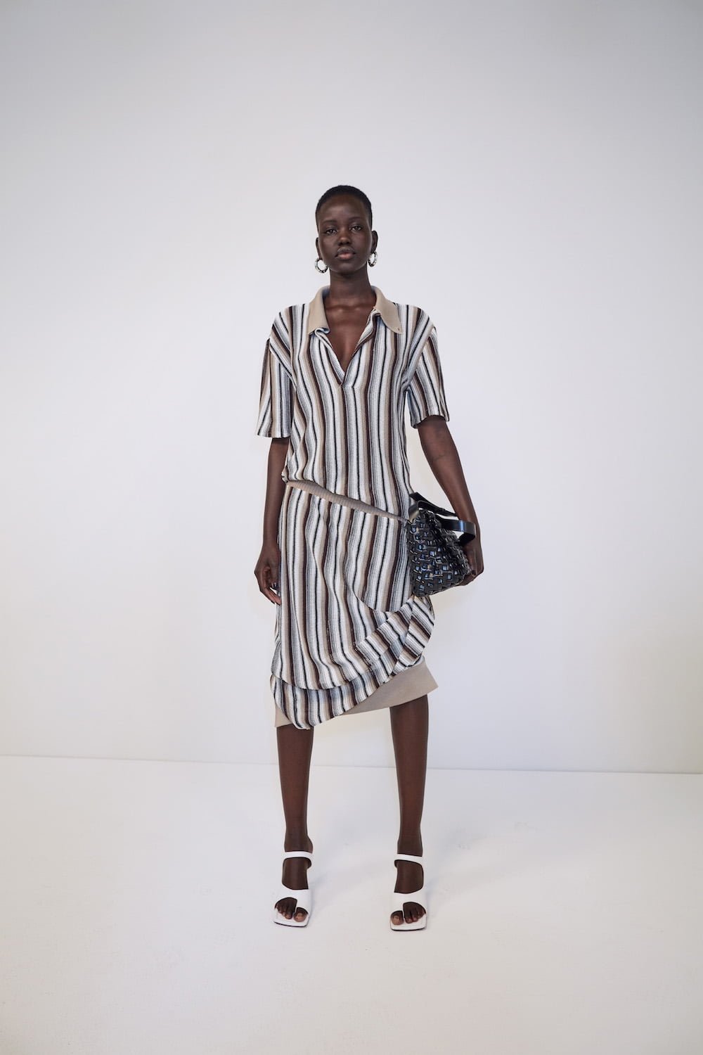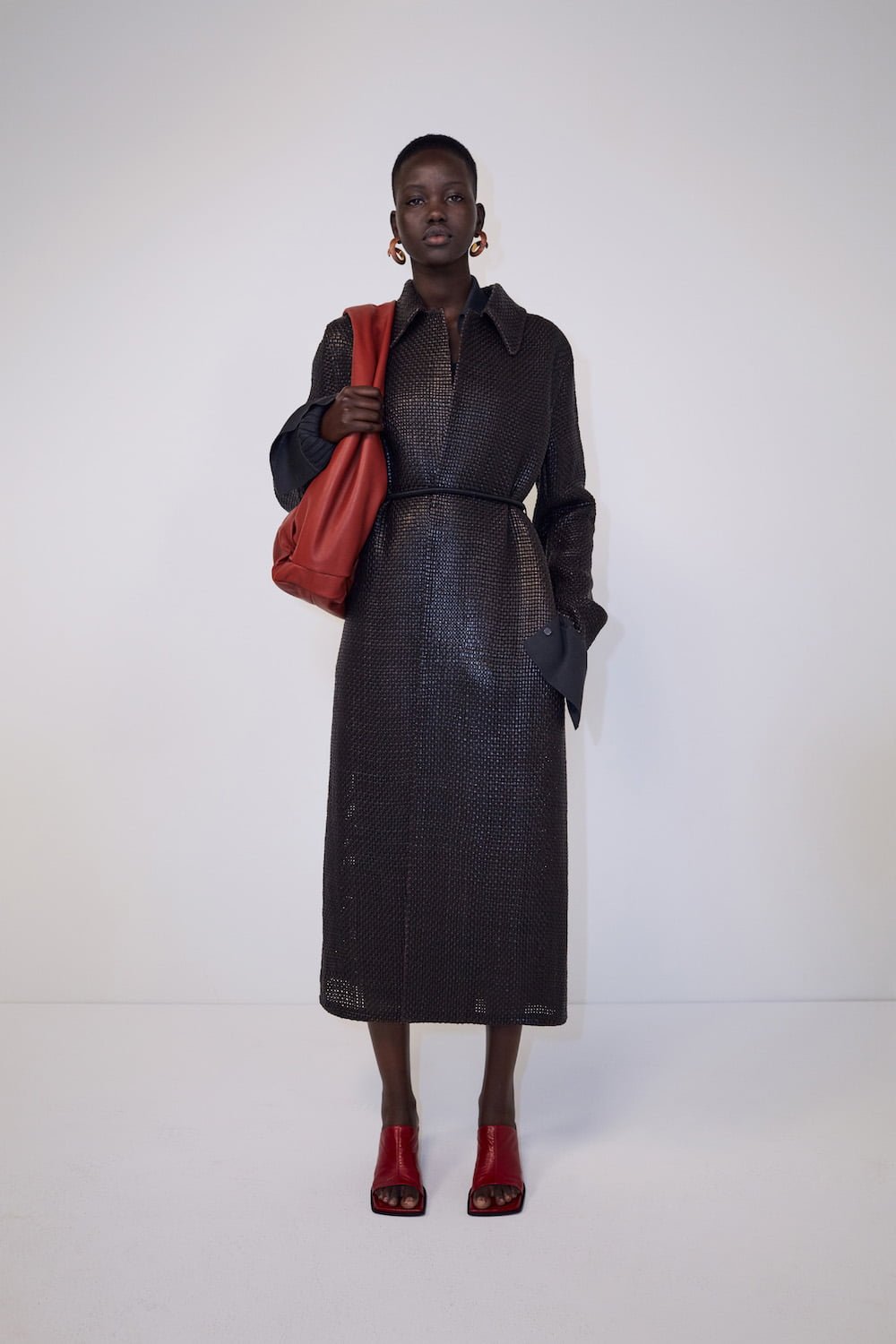 One of the designers from the women’s design team, explained that it’s not unusual for the studio to make 10 prototypes, in the real fabric, to perfect the fit. That kind of attention to detail is unheard of outside of couture. In the brave new Bottega world, Old-school craft melds beautifully with industrial technology. A stretch leather sheath dress was made with no stitching or seams. Instead, using a technique from its bag making division, the pieces of glove-soft leather were bonded together with glue and the join was imperceptible. Other stand-out pieces include a green leather mac with a wide corrugated waist band draped knits and an intreciatto trench woven so that it draped like liquid on the body.