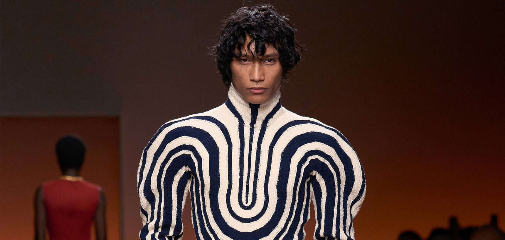 That’s not to say these clothes lacked in serious wow power. Architectural suiting cut from jersey walked alongside cocooning car coats, leather swing skirts and structural knitwear in gentle hues. If last season’s catwalk was a globe-trotting character study, this time Blazy was set on outfitting the everyday on a universal scale. There was something for every type of Bottega Veneta customer. Think asymmetrical dresses in contrasting hues that came pinned in delightful formations thanks to jewelled button fastenings. Or column dresses that migrated into feathered hemlines that danced like flames as models walked through the wood-covered showspace. “There is something very human in the simple act of dressing,” said Blazy.