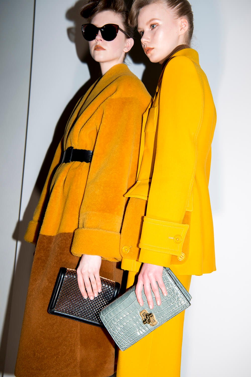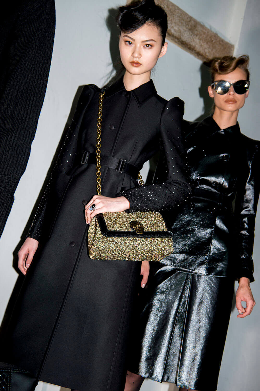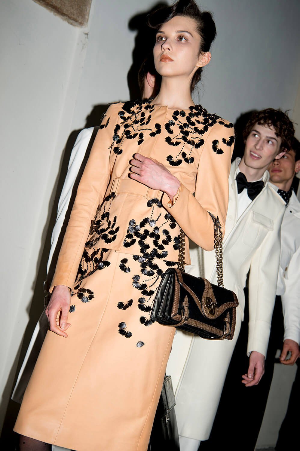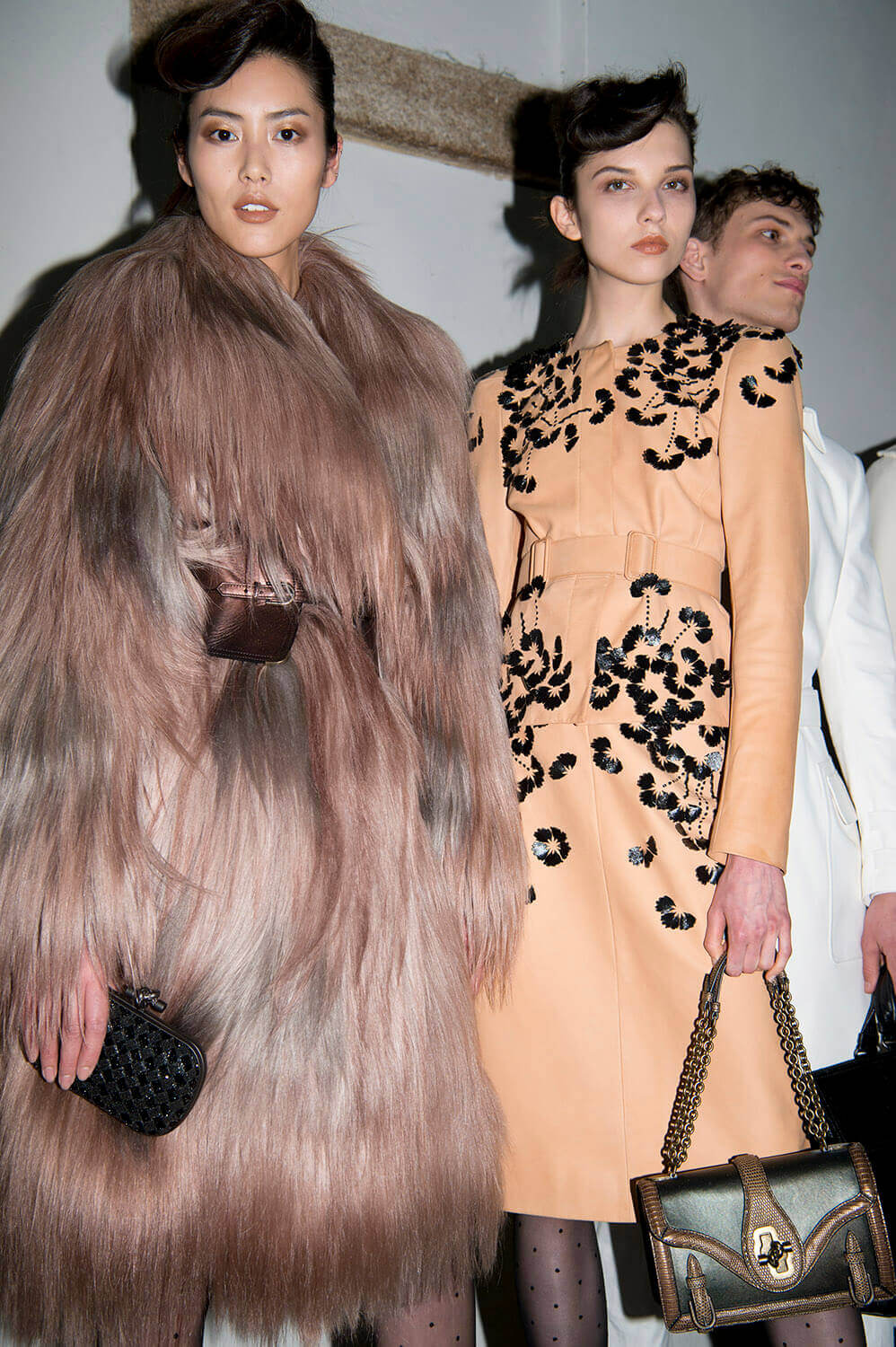 There’s something of the Hitchcock heroine to this, Bottega Veneta’s AW17 offering. Something about a cinched waist and a pitched shoulder will give you that. Not quite Grace Kelly in Rear Window, think more Kim Novak in Vertigo. A sort of coiffed femme fatale who glides about in a haze of cigarette smoke and leads men into compromising situations. It was all about this kind of amplified, rounded shoulder. Refer to first look – Eva Herzigova in this power-shouldered ribbed jumper tucked into a jodhpur and accessorised with a cracking leather glove. Which signalled this was all about the shoulder and the waist, a shape that became a loose theme – double-breasted suiting, worn with a belt to give an hourglass figure, a silhouette echoed in those almost 1940s-style tea dresses. Occasionally shoulders were further amplified with use of fur. Because how else to show you are a power lady than by expanding your form with use of luxury fabrics? The men here, as this was Bottega’s first co-ed outing, were men who looked like they could be easily led astray. Something about those sailor-boy jumpers, that folded down at the collar, or the dickie bows, suggested innocence. So too the pure white tailoring, or the ruffled shirts that poked up beneath. The Bottega lady could eat them for dinner. But we’re sure they’d taste very nice.