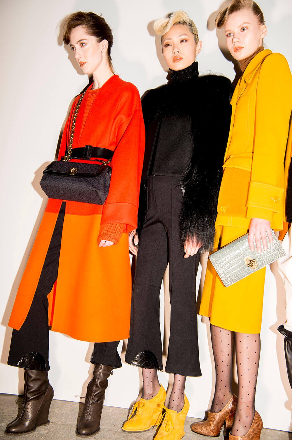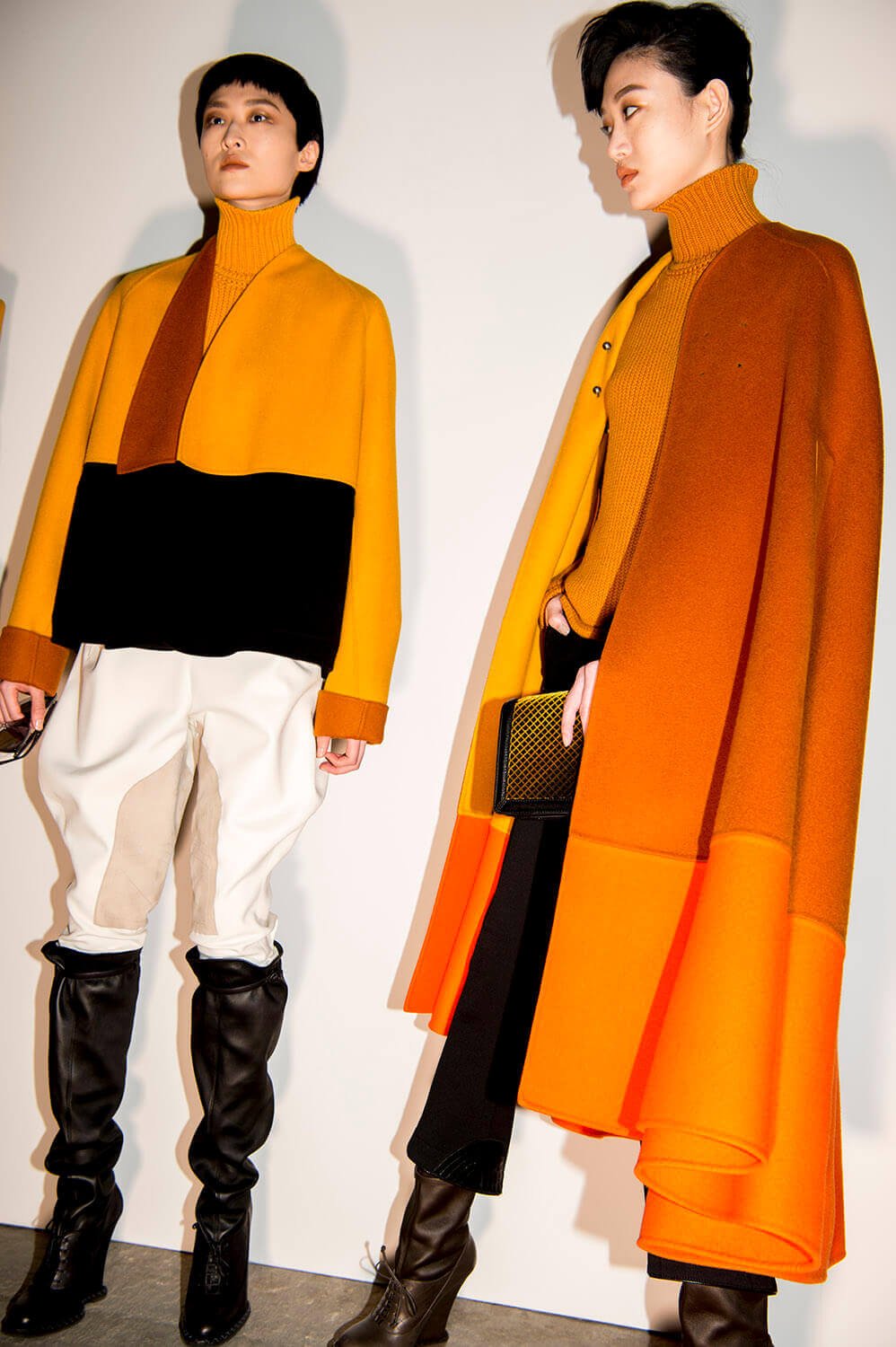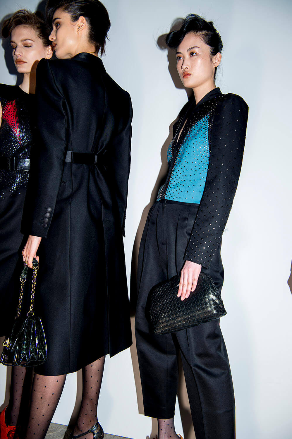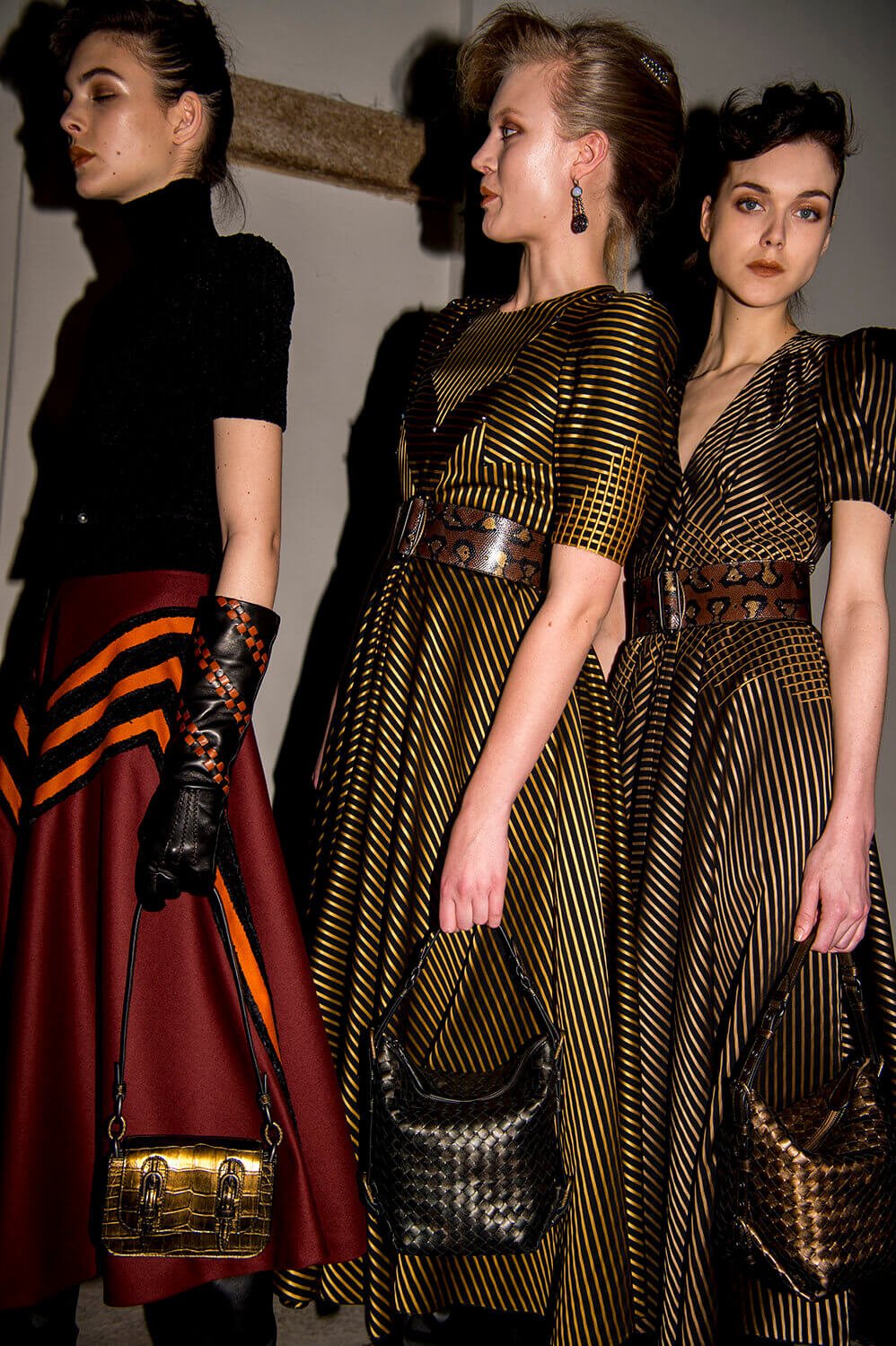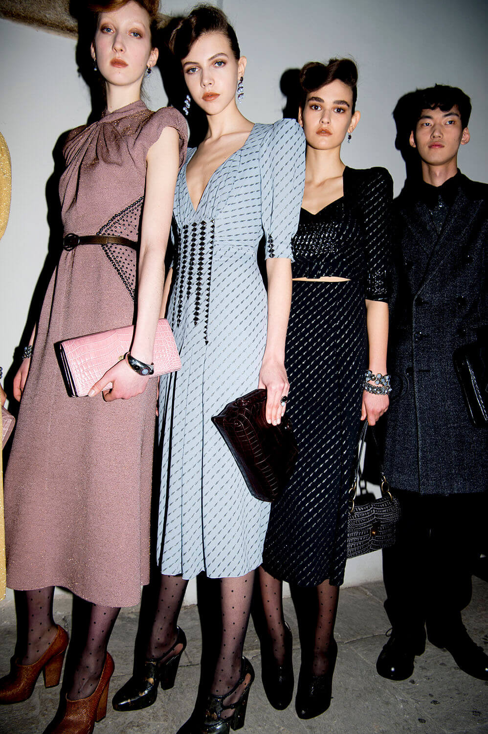 There’s something of the Hitchcock heroine to this, Bottega Veneta’s AW17 offering. Something about a cinched waist and a pitched shoulder will give you that. Not quite Grace Kelly in Rear Window, think more Kim Novak in Vertigo. A sort of coiffed femme fatale who glides about in a haze of cigarette smoke and leads men into compromising situations. It was all about this kind of amplified, rounded shoulder. Refer to first look – Eva Herzigova in this power-shouldered ribbed jumper tucked into a jodhpur and accessorised with a cracking leather glove. Which signalled this was all about the shoulder and the waist, a shape that became a loose theme – double-breasted suiting, worn with a belt to give an hourglass figure, a silhouette echoed in those almost 1940s-style tea dresses. Occasionally shoulders were further amplified with use of fur. Because how else to show you are a power lady than by expanding your form with use of luxury fabrics? The men here, as this was Bottega’s first co-ed outing, were men who looked like they could be easily led astray. Something about those sailor-boy jumpers, that folded down at the collar, or the dickie bows, suggested innocence. So too the pure white tailoring, or the ruffled shirts that poked up beneath. The Bottega lady could eat them for dinner. But we’re sure they’d taste very nice.
