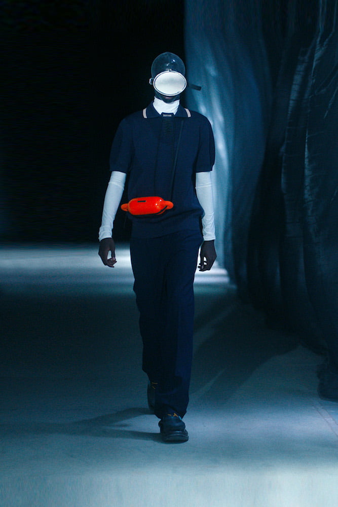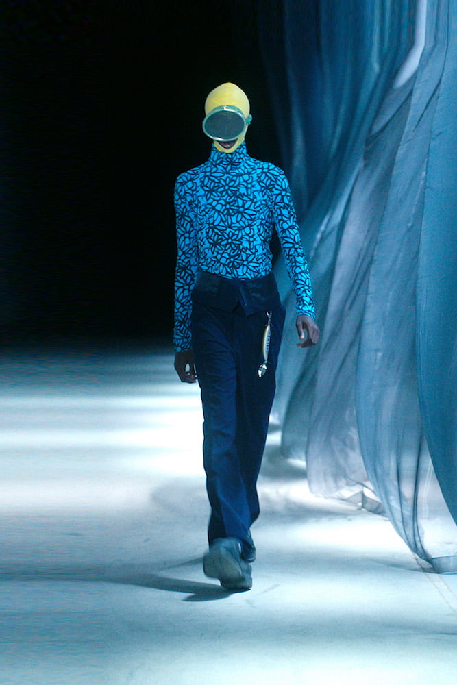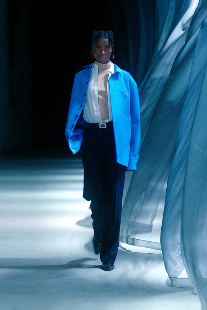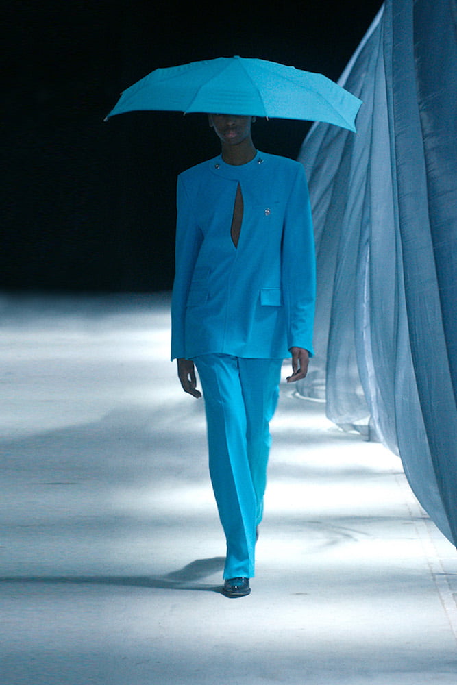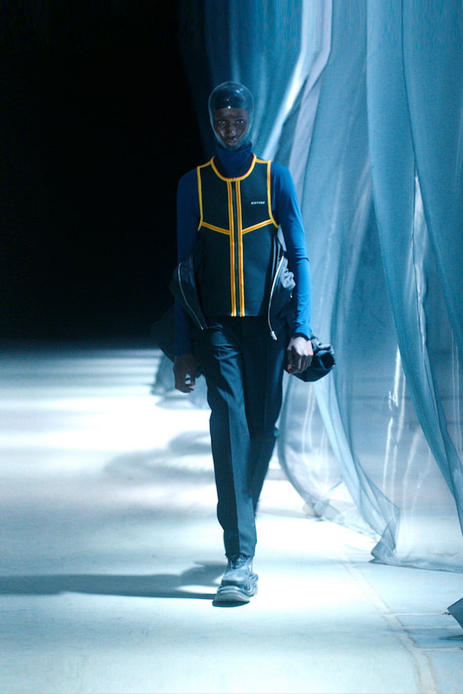 They called this collection Global Warning and 60 per cent of the fabrics you see here are made from recycled ocean plastic from nonprofit environmental organisation Parley for the Oceans, used to create aqua blue outerwear with diver fastenings, scuba vests and the brand’s signature boxy tailoring – made for all genders.